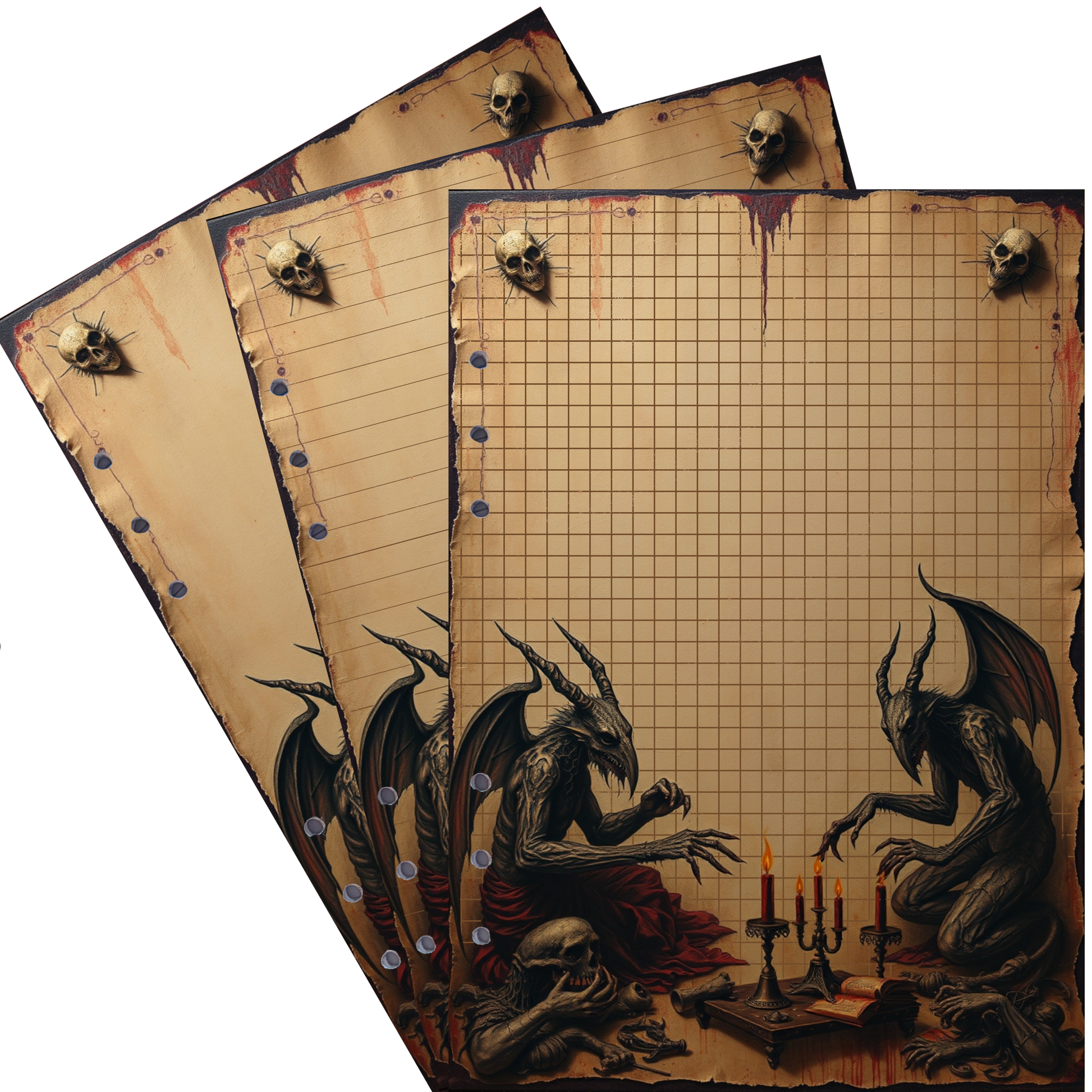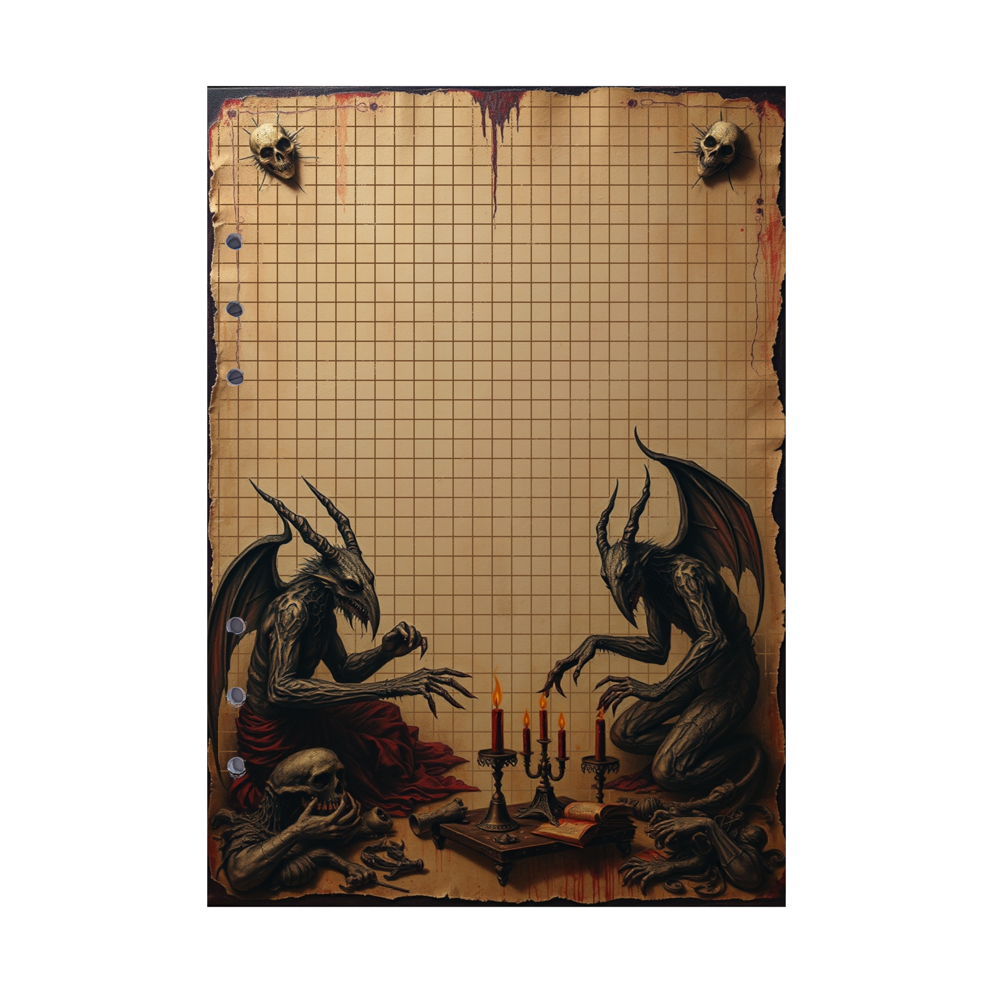 In der "Devil's Kitchen 17"-Ringbucheinlage erleben Sie eine geheimnisvolle Szene: Zwei geflügelte Unterweltkreaturen tauschen sich bei schummrigem Kerzenschein über ihren Tag aus. Umgeben von flackerndem Licht und einer düsteren, fast mystischen Atmosphäre, wird der Moment von den Kreaturen lebendig, während sie ihre finsteren Geschichten teilen. Dieses Design ist perfekt für alle, die ihre Notizen in einer teuflischen, aber zugleich intim-stimmungsvollen Umgebung festhalten möchten.