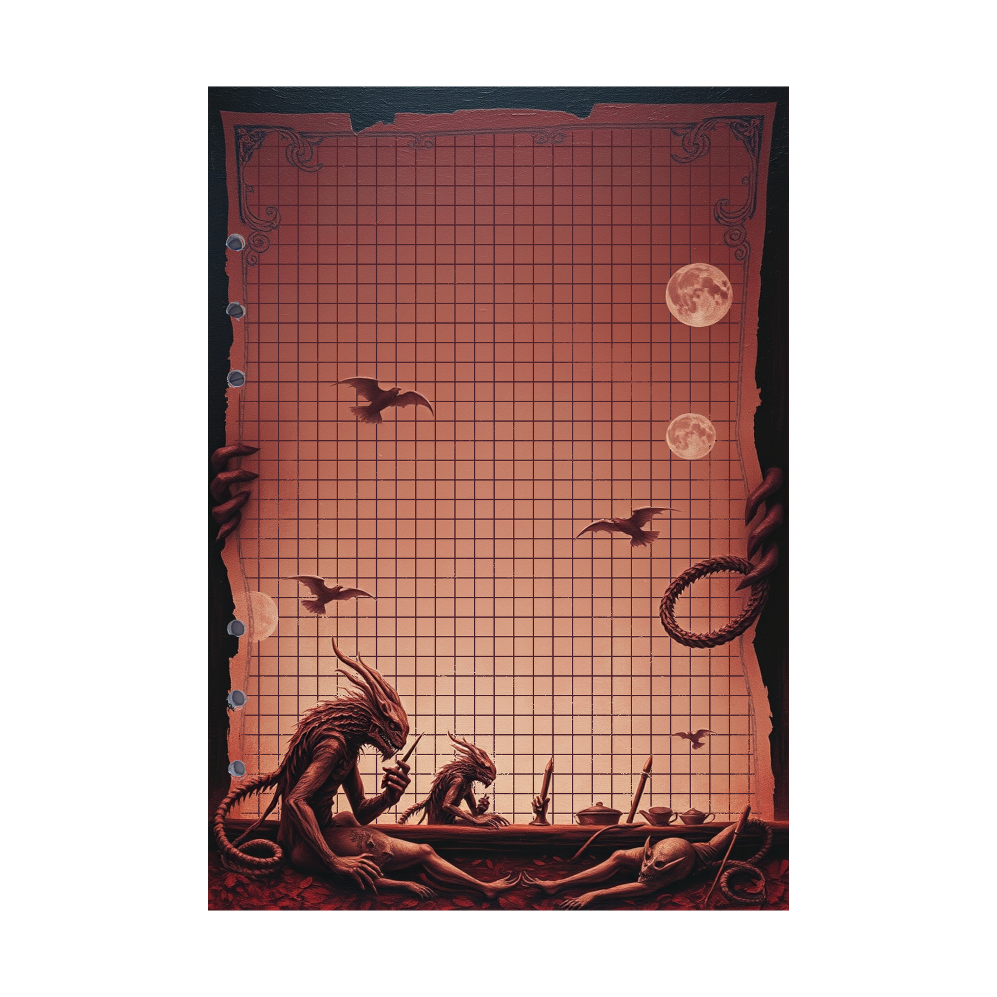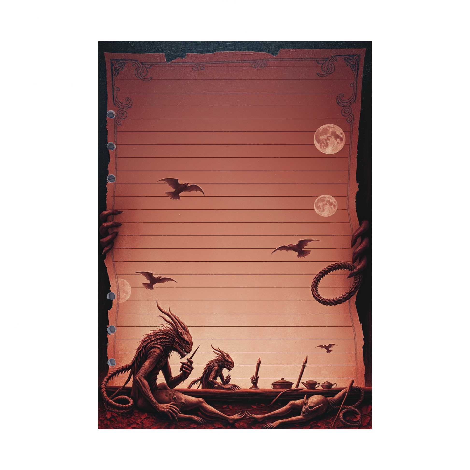 - Kreatives Design: Das Bild der Teufelshelfer unter den zwei Monden verleiht Ihren Notizen eine mystische, fast übernatürliche Atmosphäre.