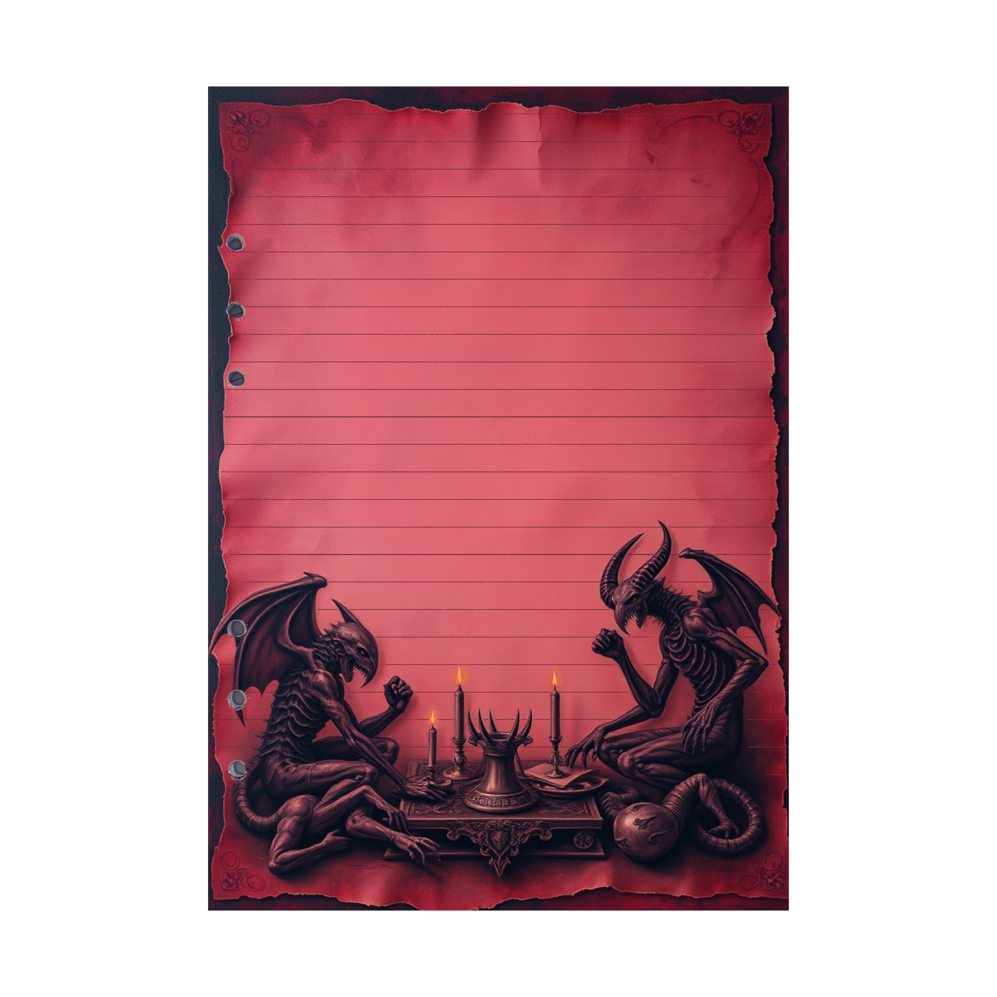In der "Devil's Kitchen 22"-Ringbucheinlage erleben Sie eine spannende und zugleich teuflisch gemütliche Szene: Bei sanftem Kerzenschein in einer weinroten Höhle teilen sich zwei Kreaturen eine dampfende Suppe und unterhalten sich angeregt. Die flackernden Lichter und der mystische, weinrote Hintergrund schaffen eine geheimnisvolle, fast intime Atmosphäre, in der die beiden Gestalten ihre finsteren Gedanken austauschen. Dieses Design ist ideal für alle, die ihre Notizen in einer düsteren, aber dennoch anregenden Umgebung festhalten möchten.