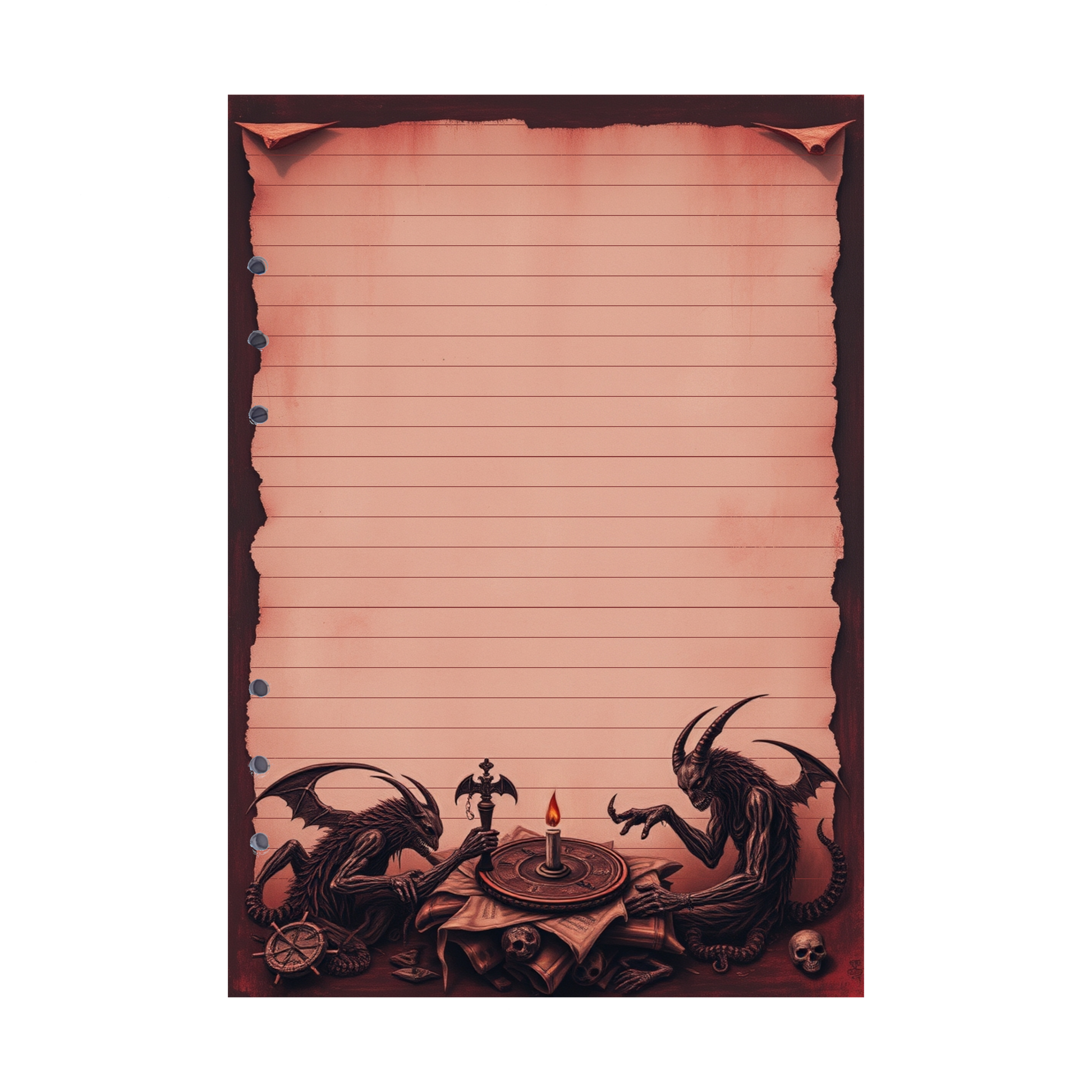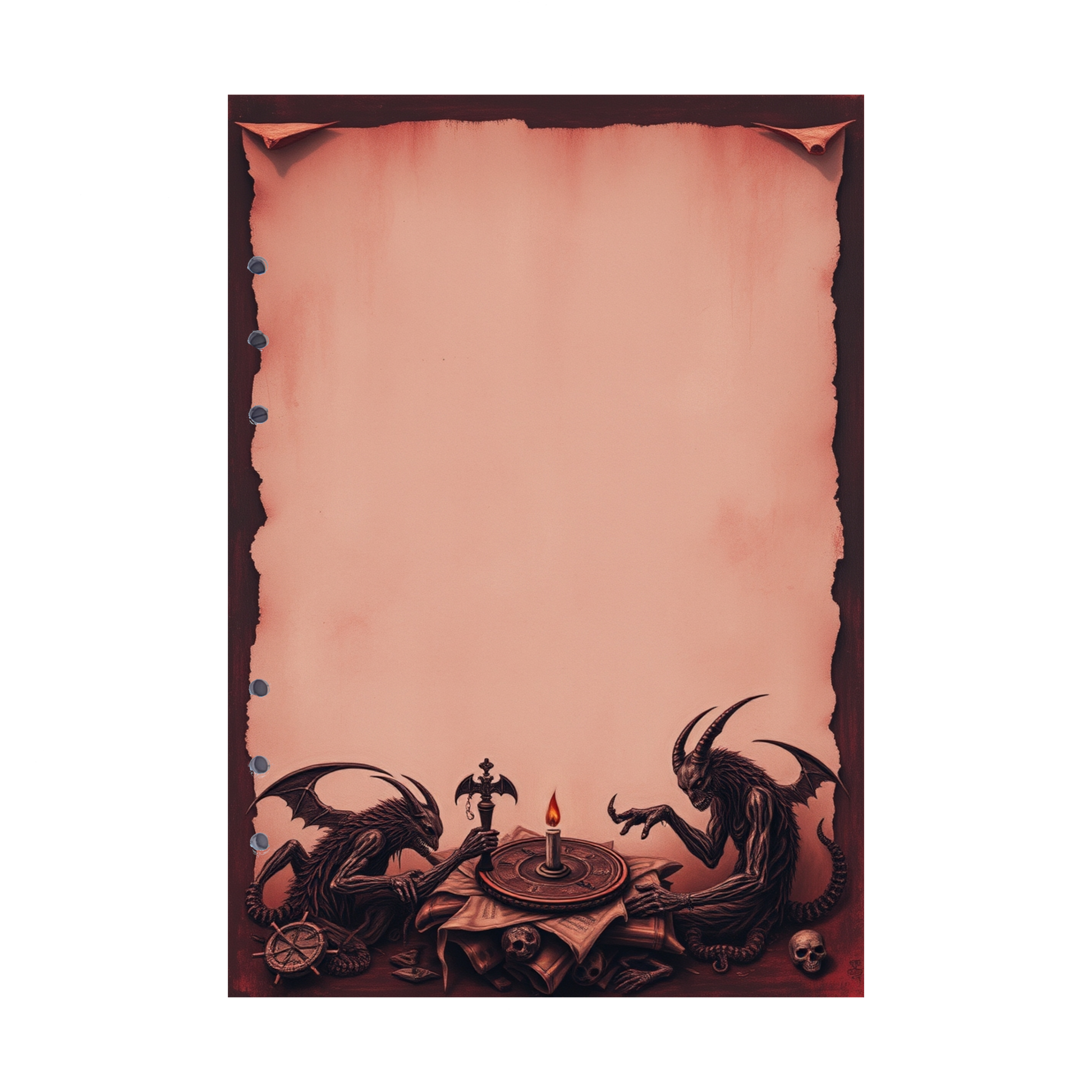 In der "Devil's Kitchen 23"-Ringbucheinlage bereiten sich zwei teuflische Helferlein mit Flügeln auf ihren nächsten Besuch auf der Erde vor. Um ihre Reise zu planen, nutzen sie Karten und einen Kompass, während sie sich angeregt über ihre finsteren Vorhaben beraten. Dieses Design verströmt eine Mischung aus Planung und schelmischer Aufregung, während die beiden Kreaturen sich auf ihre nächste Mission vorbereiten. Ein ideales Motiv für alle, die ihre Notizen in einer Atmosphäre von Teufelsplänen und geheimen Expeditionen festhalten möchten.