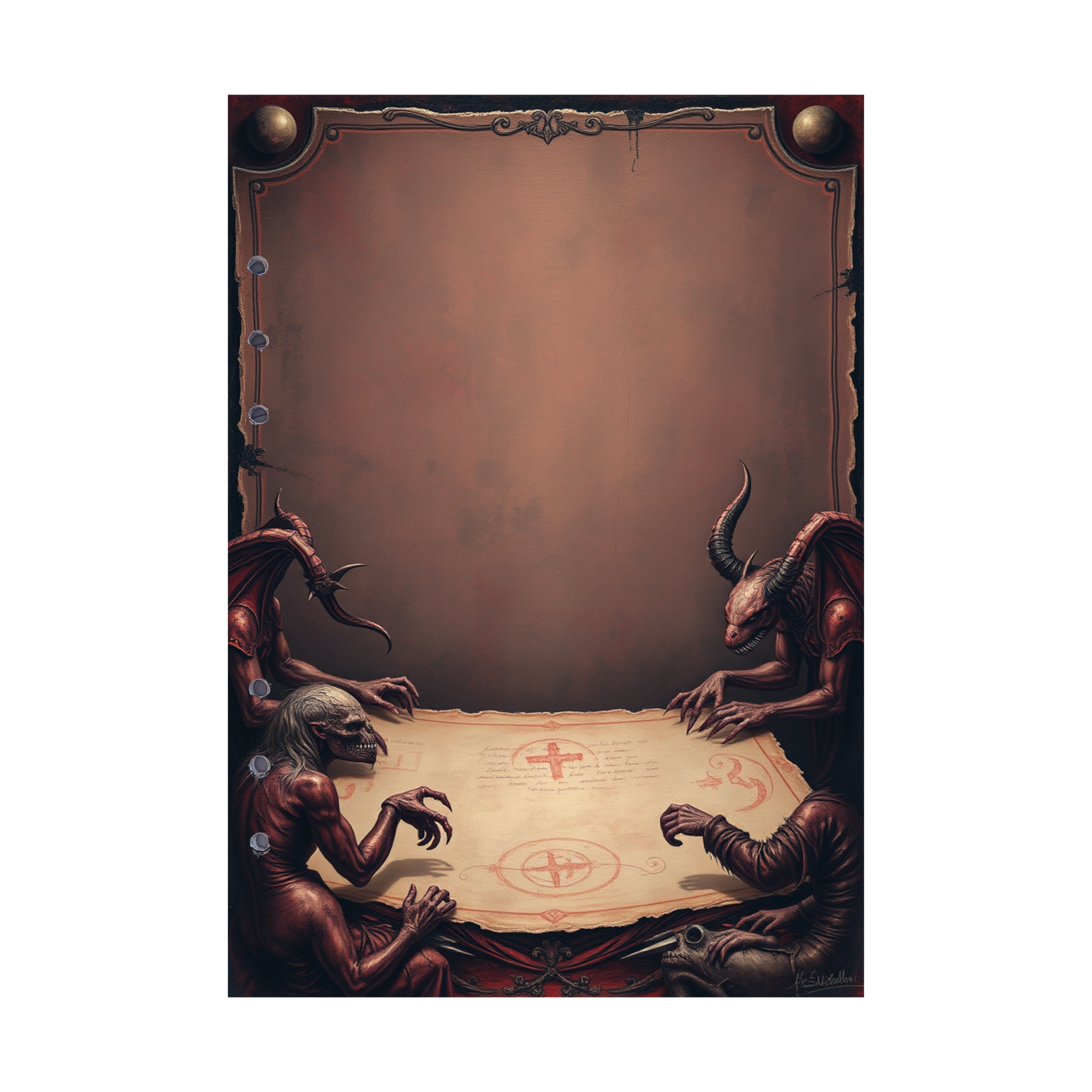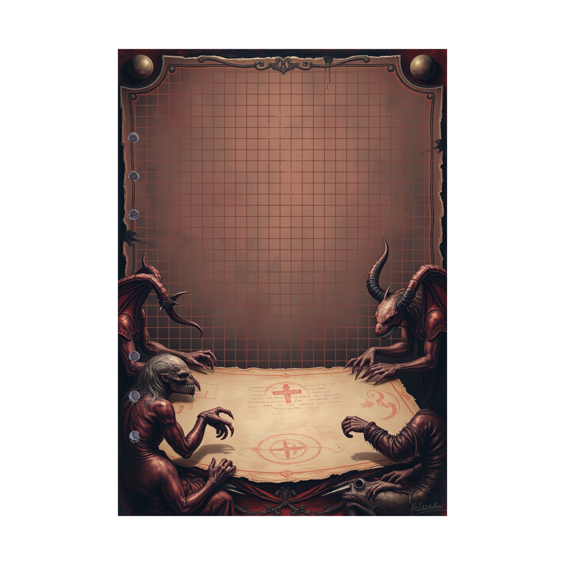 In der "Devil's Kitchen 34"-Ringbucheinlage sehen wir die vier weisen Teufel, die sich über einer alten, vergilbten Landkarte der Hölle versammeln. Mit ernsten Blicken studieren sie die mystischen Routen und Geheimnisse der Unterwelt, als ob sie die nächsten finsteren Pläne aushecken oder ein uraltes Ritual vorbereiten würden. Das Design vermittelt eine Atmosphäre von Wissen, Macht und dunkler Weisheit – perfekt für alle, die ihre Gedanken und Ideen mit einer Portion mystischer und teuflischer Energie festhalten möchten.