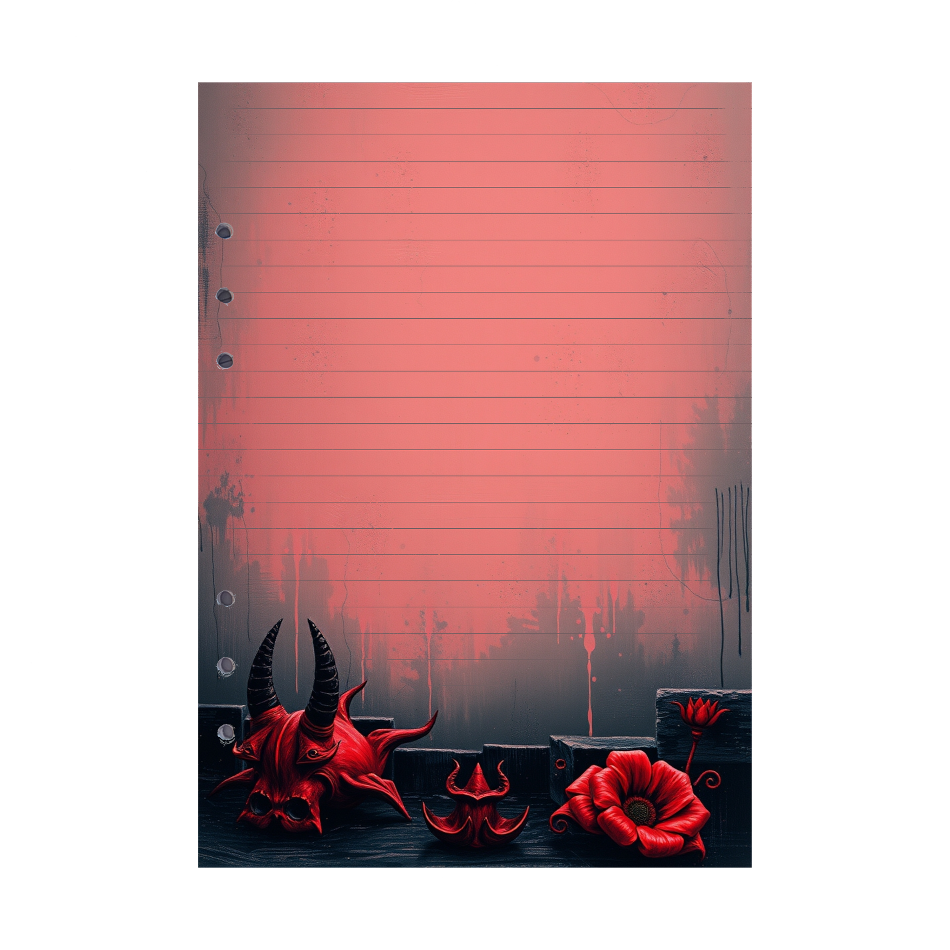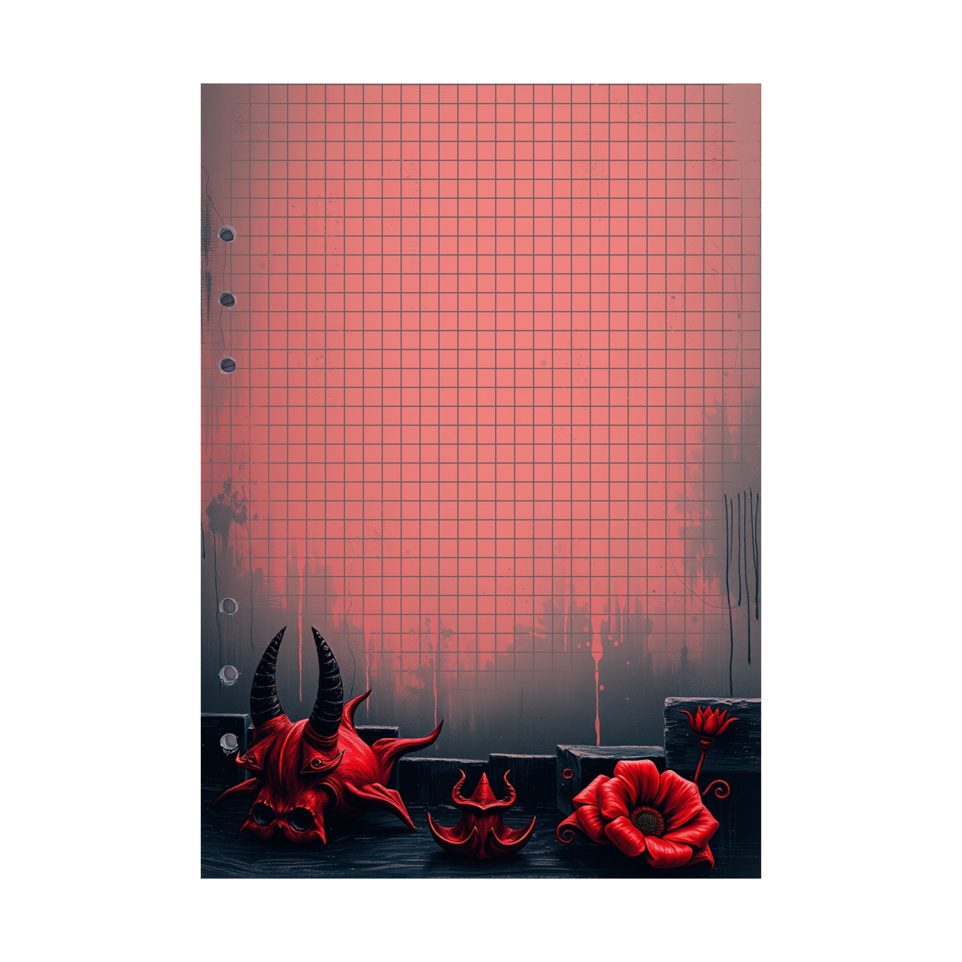 In der "Devil's Kitchen 38"-Ringbucheinlage sehen wir einen alten Tisch, der mit einer roten Blüte, einem rostigen, gehörnten Schädel und einem kleinen roten Schälchen dekoriert ist. Der Tisch steht vor einer verschmutzten, rosa Wand mit grauen Flecken, was der Szene eine düstere, mystische Atmosphäre verleiht. Das Design kombiniert vergängliche Schönheit und düstere Symbolik und schafft ein einzigartiges, teuflisches Ambiente – ideal für kreative Projekte, die von Geheimnissen, Alter und dunklen Geheimnissen inspiriert sind.