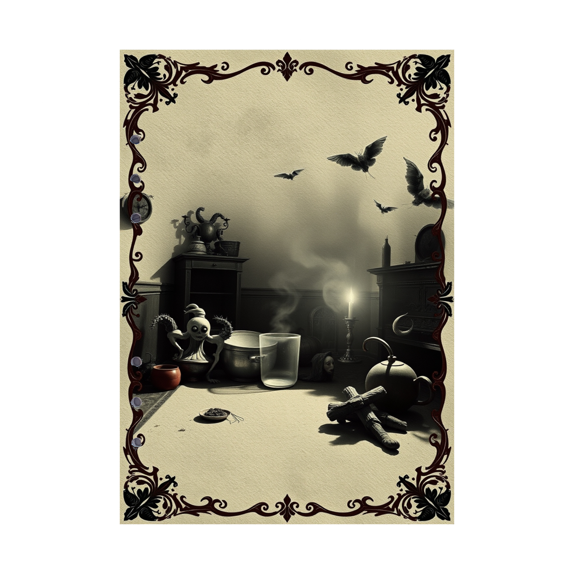 In der "Devil's Kitchen 40"-Ringbucheinlage sehen wir das chaotische Ergebnis einer teuflischen Kochsession: Die Küche ist nach dem Kochen von Teufel und seinen Kindern ein einziges Durcheinander. Spielsachen und Kochutensilien sind überall verstreut, ein wahres Durcheinander aus Teufelswerkzeugen und Kinderfreude. Das Design fängt die wilde Energie und den kreativen Sturm in der Küche ein, der nach einem lebhaften Teufelsmahl zurückgelassen wird – eine perfekte Darstellung von Chaos, Familie und Teufelskunst.