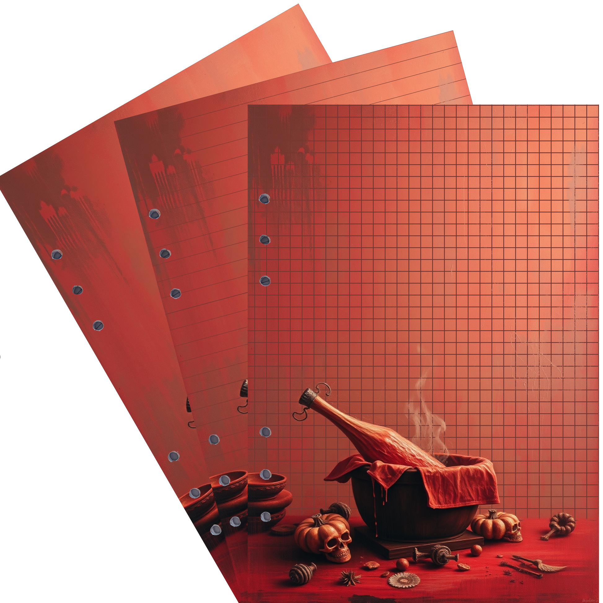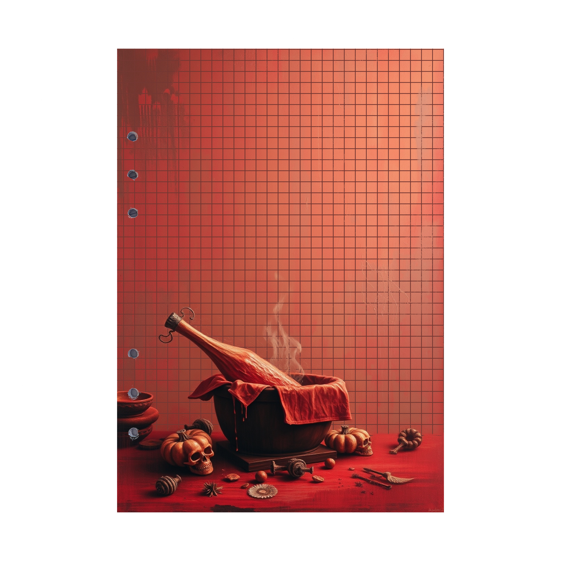 In der "Devil's Kitchen 44"-Ringbucheinlage sehen wir den Teufel höchstpersönlich bei den Vorbereitungen für ein romantisches Dinner. Alle Zutaten sind bereits sorgfältig zurechtgelegt – ein wahrer Meister der teuflischen Kulinarik. Die Atmosphäre ist von Eleganz und mystischer Vorfreude durchzogen, während der Teufel mit Präzision und Stil sein teuflisches Mahl für den besonderen Abend vorbereitet.