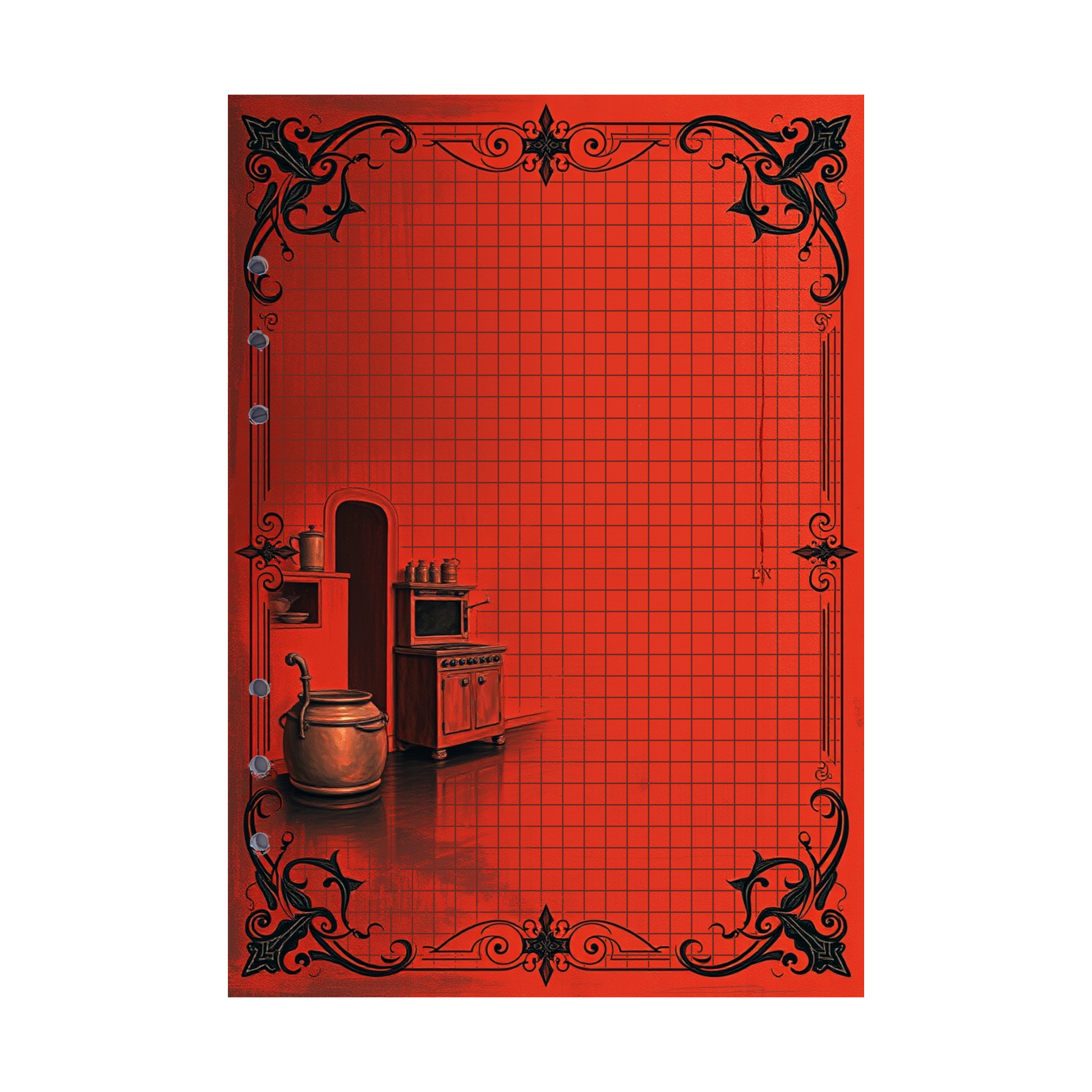 Die "Devil's Kitchen 47"-Ringbucheinlage zeigt die feuerrote Küche des Teufels, die in einem intensiven, glühenden Rot erstrahlt. Im Mittelpunkt steht der Eingang der Küche, flankiert von einem antiken Küchenschrank und einem mächtigen Kupferkessel, der bereit ist, mit teuflischen Zutaten gefüllt zu werden. Die gesamte Szene versprüht eine intensive, mystische Energie und zieht den Betrachter in die düstere und faszinierende Atmosphäre einer teuflischen Kochkunst hinein.