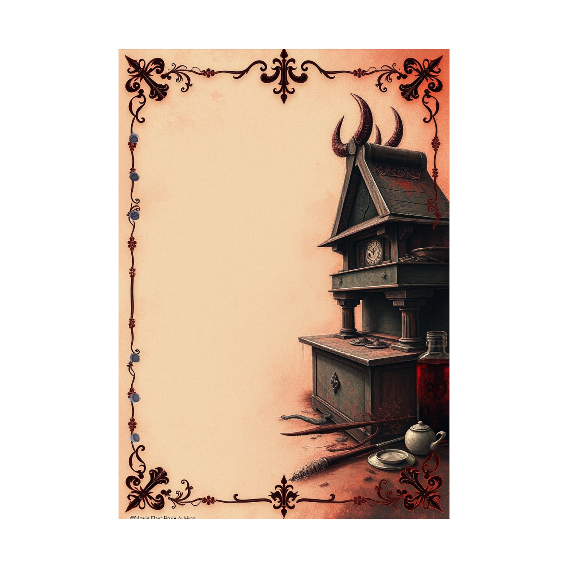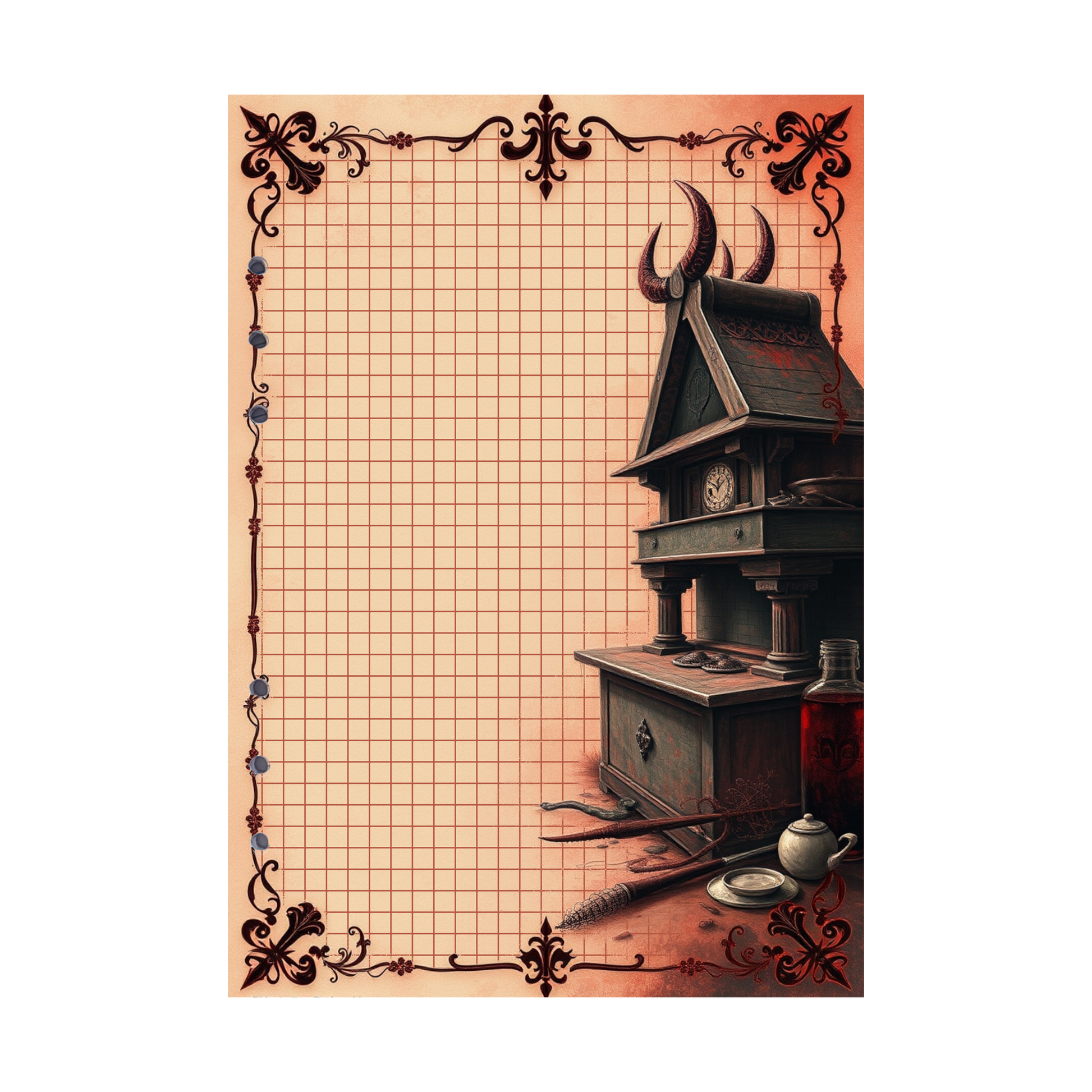 Die "Devil's Kitchen 49"-Ringbucheinlage entführt uns in eine besonders teuflische Küche, in der selbst die Möbel nicht unberührt bleiben – sie sind mit prächtigen Hörnern verziert. Die Szene vermittelt das Gefühl eines Ortes, der von dunkler Magie und teuflischer Eleganz durchzogen ist. Hier wird jeder Aspekt der Küche, vom Schrank bis zum Tisch, von einer düsteren und einzigartigen Atmosphäre begleitet. Ideal für alle, die ihre Notizen in einem Raum festhalten möchten, der gleichermaßen faszinierend und unheimlich ist.
