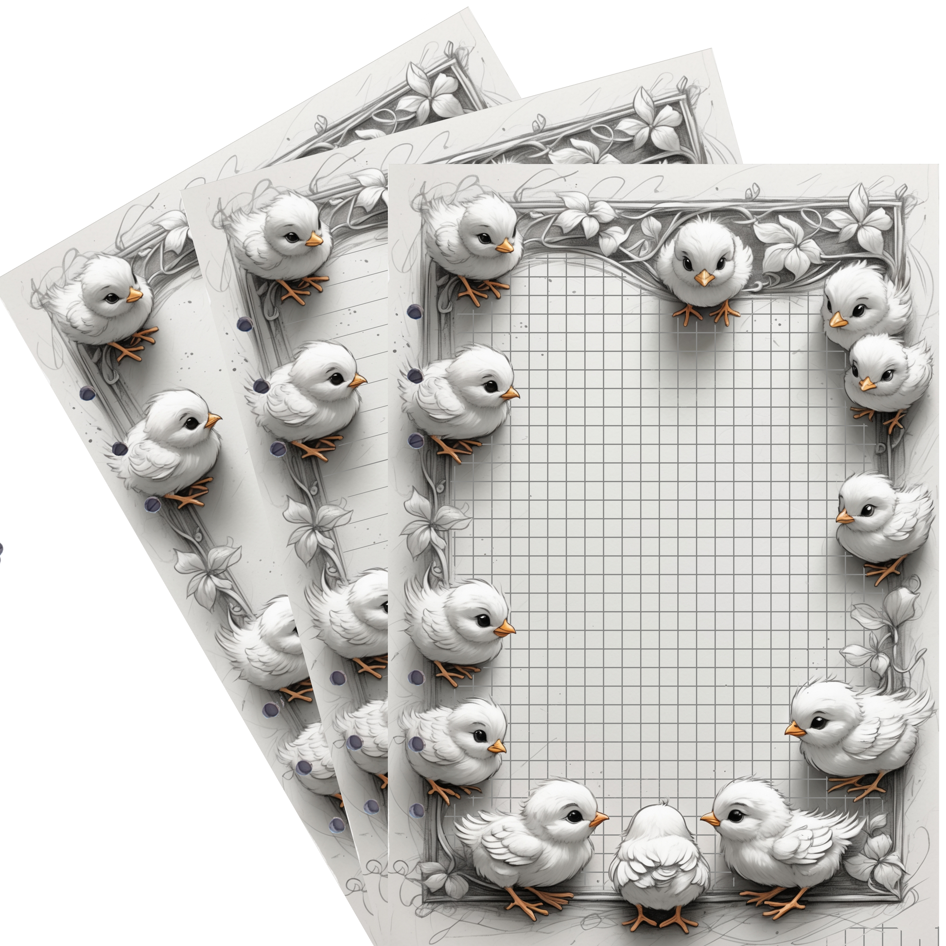 Verspieltes Design: Die weißen Küken, die die Schreibfläche umrahmen, sorgen für eine fröhliche und lebendige Osteroptik.