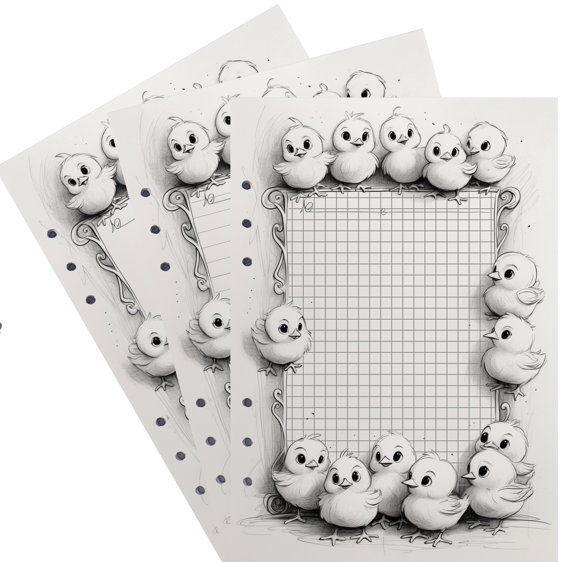 Bringen Sie Osterfreude in Ihre Notizen mit unseren DIN A5 Ringbucheinlagen im "Happy Easter 25"-Design! Dieses süße Design zeigt viele kleine weiße Küken, die die Seite als fröhlichen Rahmen umgeben. Die Küken sorgen für eine verspielte und frühlingshafte Atmosphäre und lassen genügend Platz für Ihre kreativen Gedanken und Notizen.