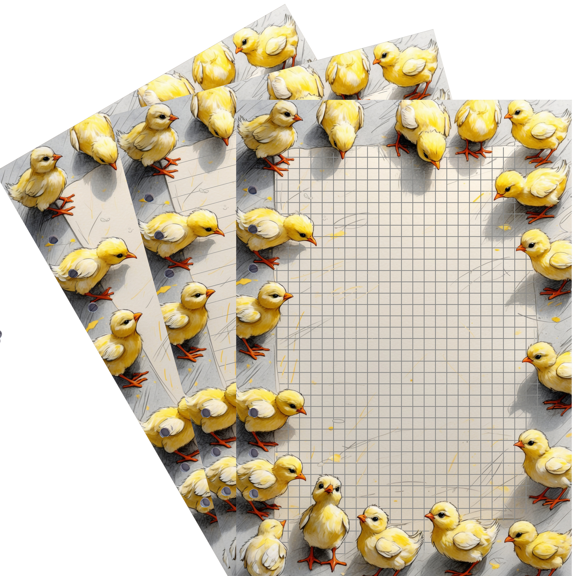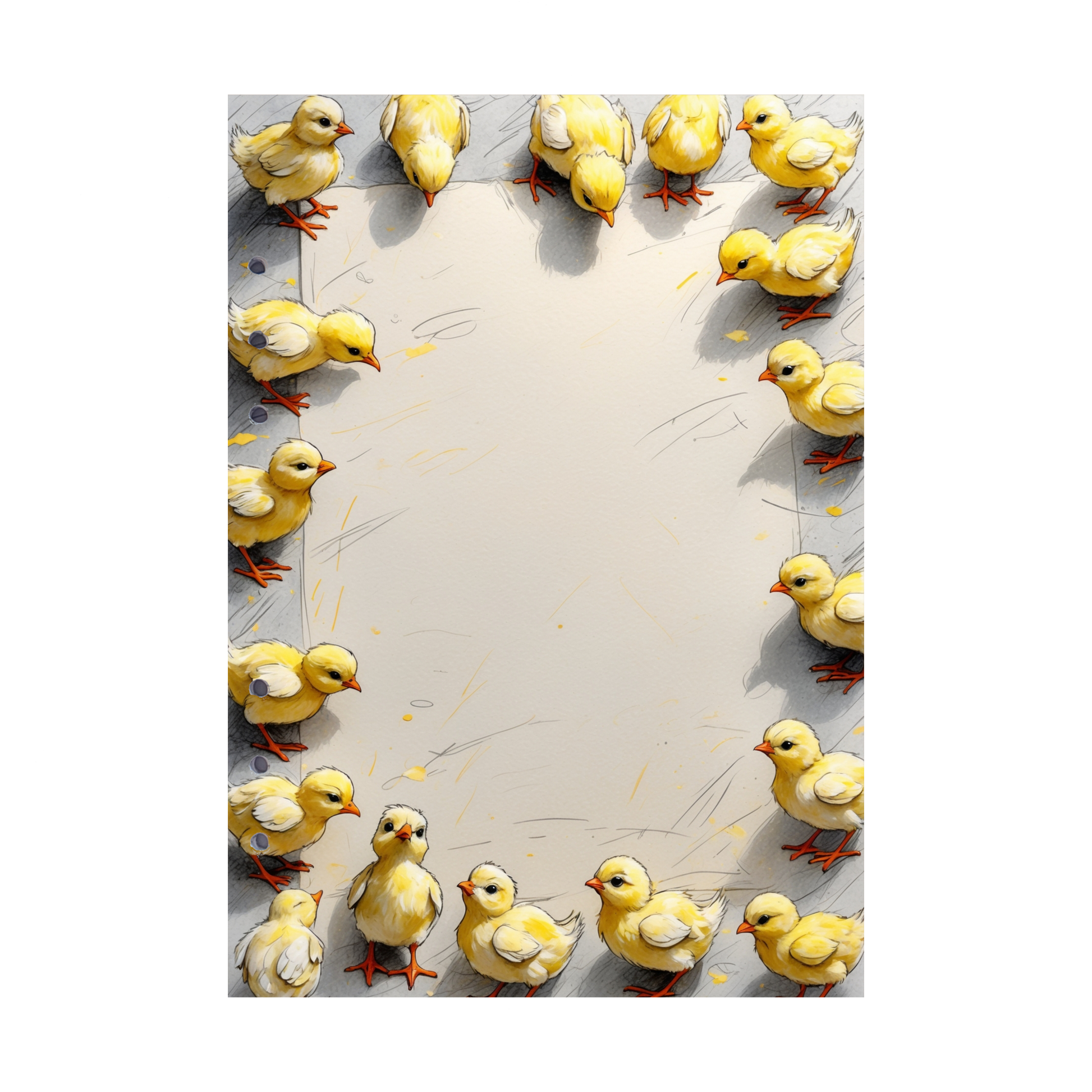 Fröhliches Design: Die vielen kleinen, quirligen Küken als Rahmen bringen eine energiegeladene und verspielte Osteratmosphäre in Ihre Notizen.