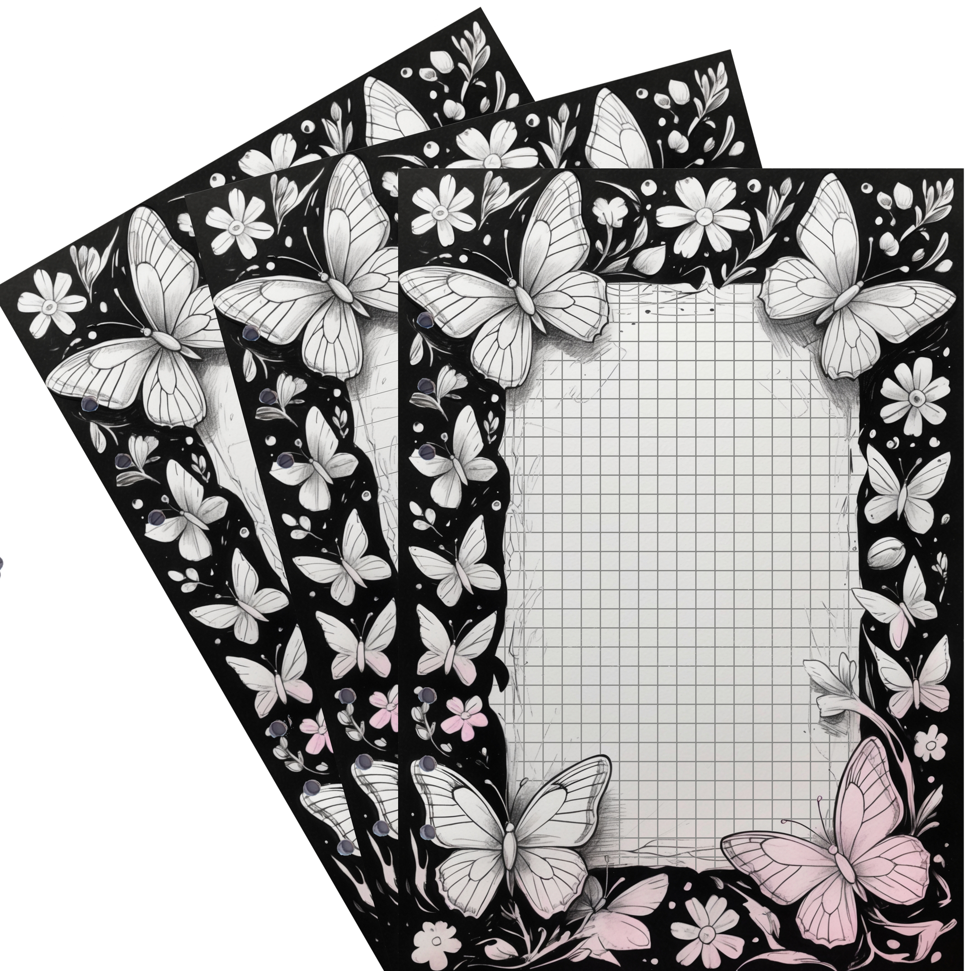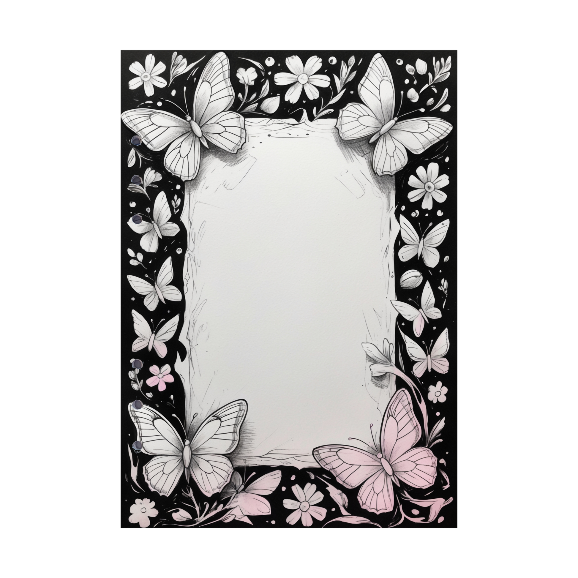 Kreatives Design: Der schwarze Rahmen mit weißen Schmetterlingen bietet eine ideale Vorlage für individuelles Ausmalen und kreative Notizen.