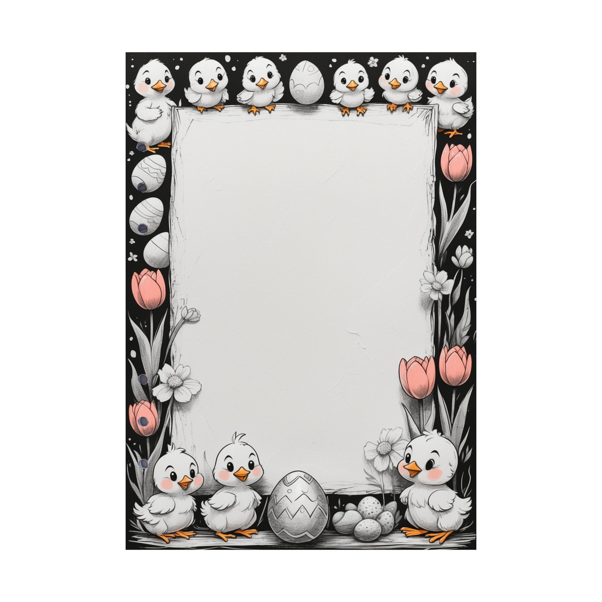 Kreatives Design: Die weißen Küken und rosa Tulpen als Highlights bieten eine wunderschöne und einladende Vorlage für kreatives Ausmalen und Gestalten.