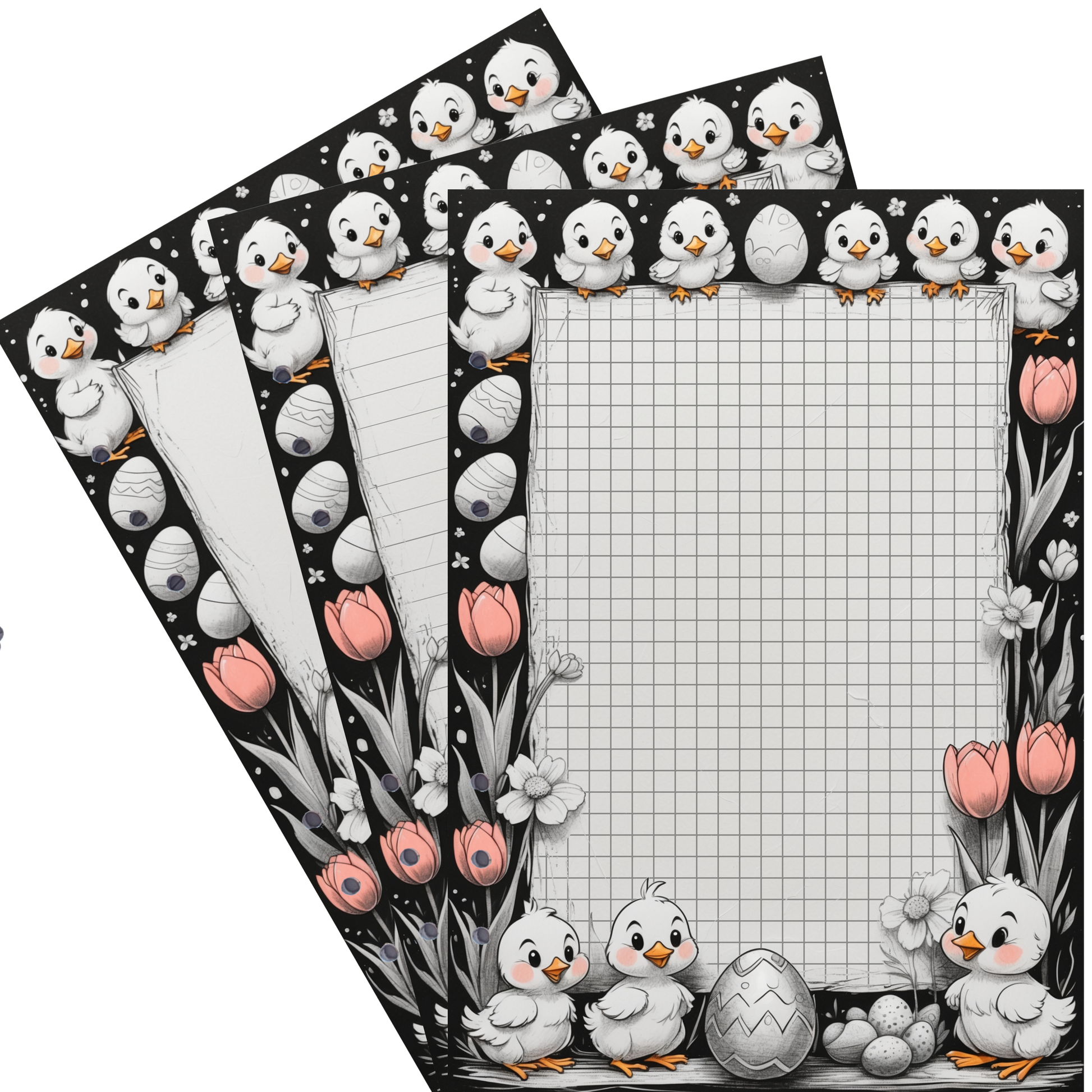 Holen Sie sich den Frühling direkt in Ihre Notizen mit unseren DIN A5 Ringbucheinlagen im "Happy Easter 43"-Design! Auf diesen Seiten finden sich viele süße, weiße Küken, die eine bezaubernde Randgestaltung bilden, sowie zarte rosa Tulpen als Highlights, die dem Design einen frischen und eleganten Touch verleihen. Diese Gestaltung lädt dazu ein, die Seiten zu gestalten und auszumalen, um Ihre persönlichen Akzente zu setzen und Ihre Notizen kreativ zu verschönern.