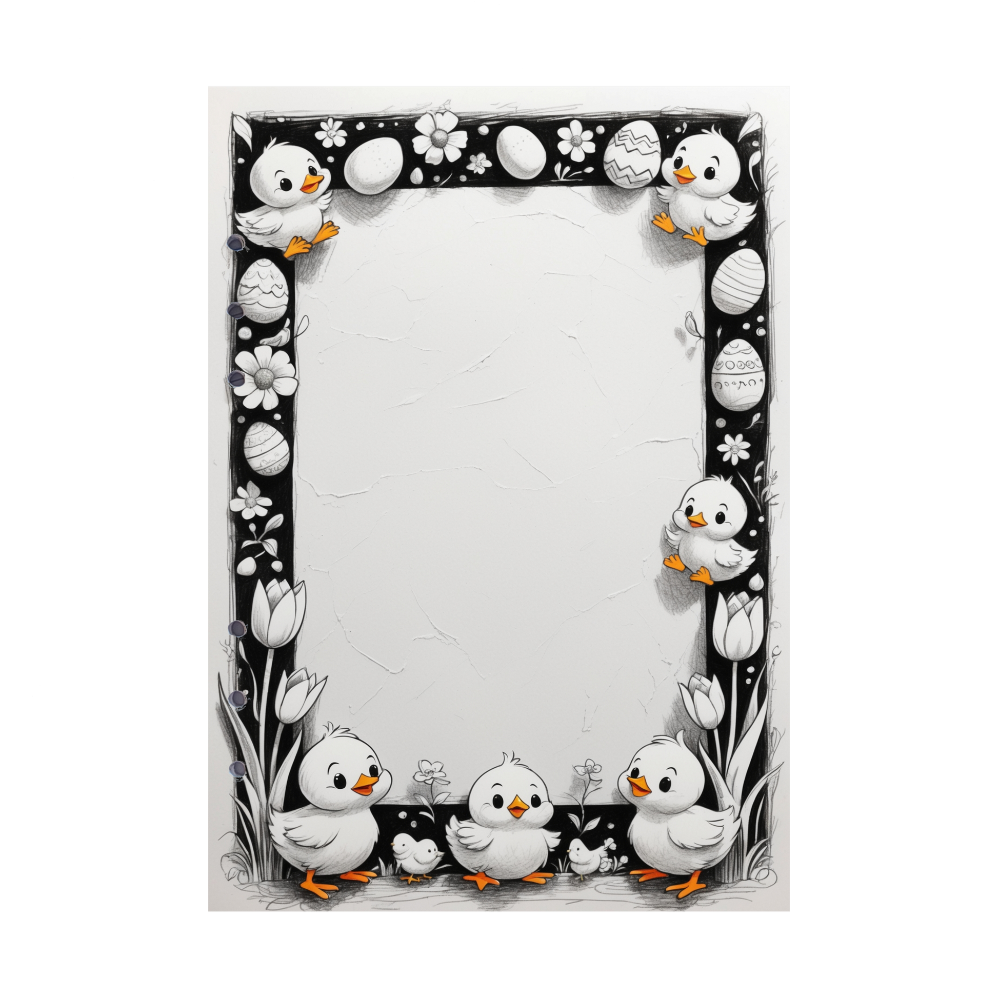 Kreatives Design: Die weißen Küken mit ihren orangefarbenen Füßchen und Schnäbeln auf dem schwarzen Rahmen bieten eine einladende und kreative Vorlage für Ausmalprojekte.
