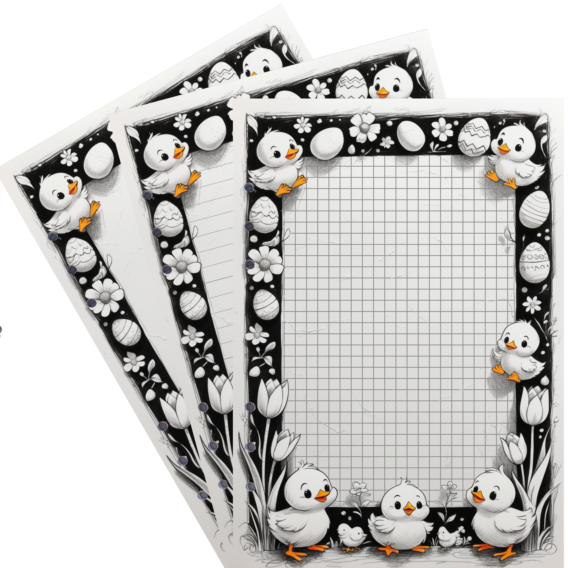 Bringen Sie fröhliche Farben in Ihre Notizen mit unseren DIN A5 Ringbucheinlagen im "Happy Easter 45"-Design! Dieses Design zeigt viele niedliche weiße Küken mit orangefarbenen Füßchen und Schnäbeln, die auf einem schwarzen Rahmen angeordnet sind. Die klaren Konturen bieten eine großartige Vorlage zum Ausmalen und Gestalten. Lassen Sie Ihrer Kreativität freien Lauf, indem Sie die Küken und den Rahmen nach Belieben ausmalen und so Ihre Notizen individuell verschönern.