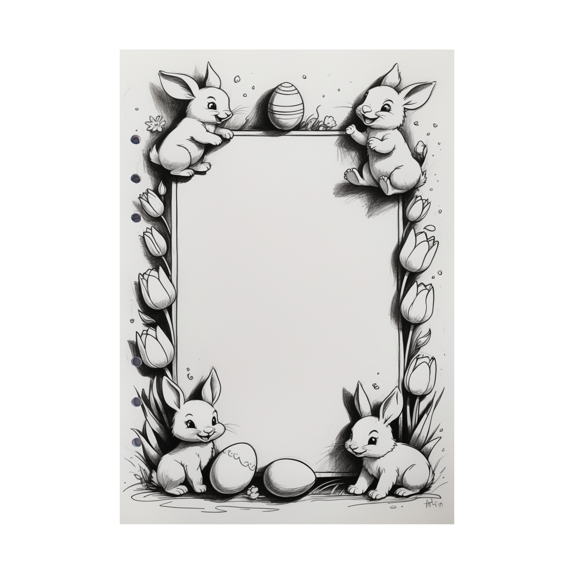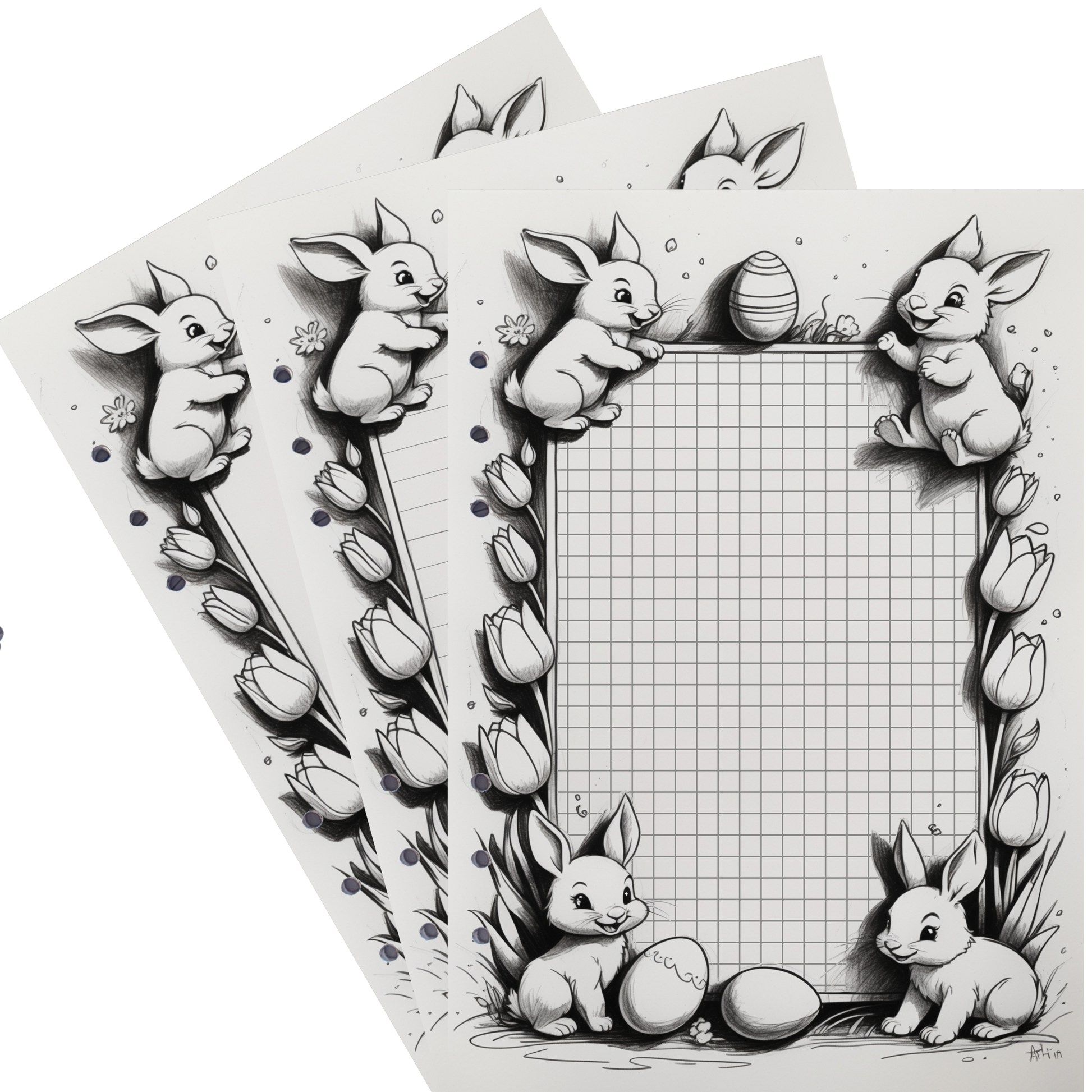 Bringen Sie Farbe in Ihre Notizen mit unseren DIN A5 Ringbucheinlagen im "Happy Easter 48"-Design! Dieses Design zeigt einen charmanten Rahmen aus Hasen, Tulpen und Ostereiern, alles in Weiß gehalten und bereit für Ihre persönliche, farbenfrohe Gestaltung. Die klare Vorlage lädt dazu ein, die Elemente nach Ihrem Geschmack auszumalen und kreativ zu gestalten, um so Ihren Notizen eine fröhliche Osterstimmung zu verleihen.
