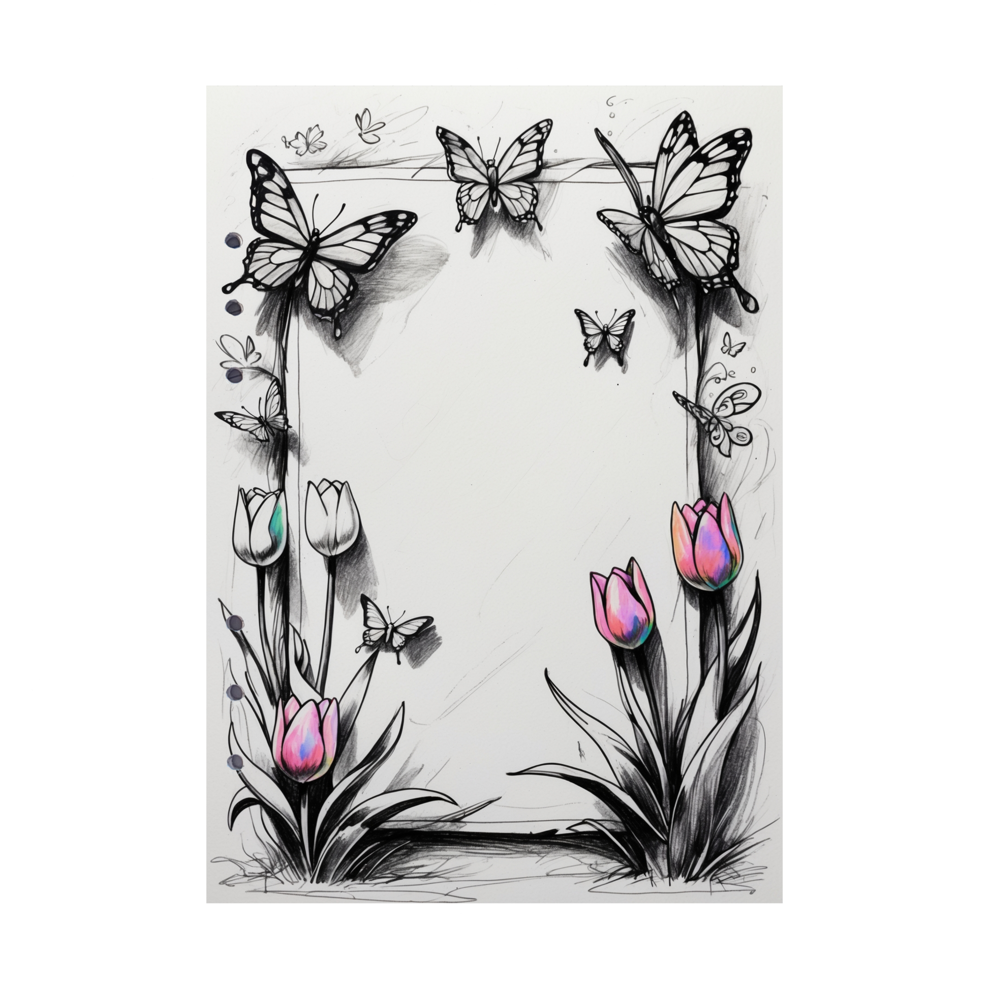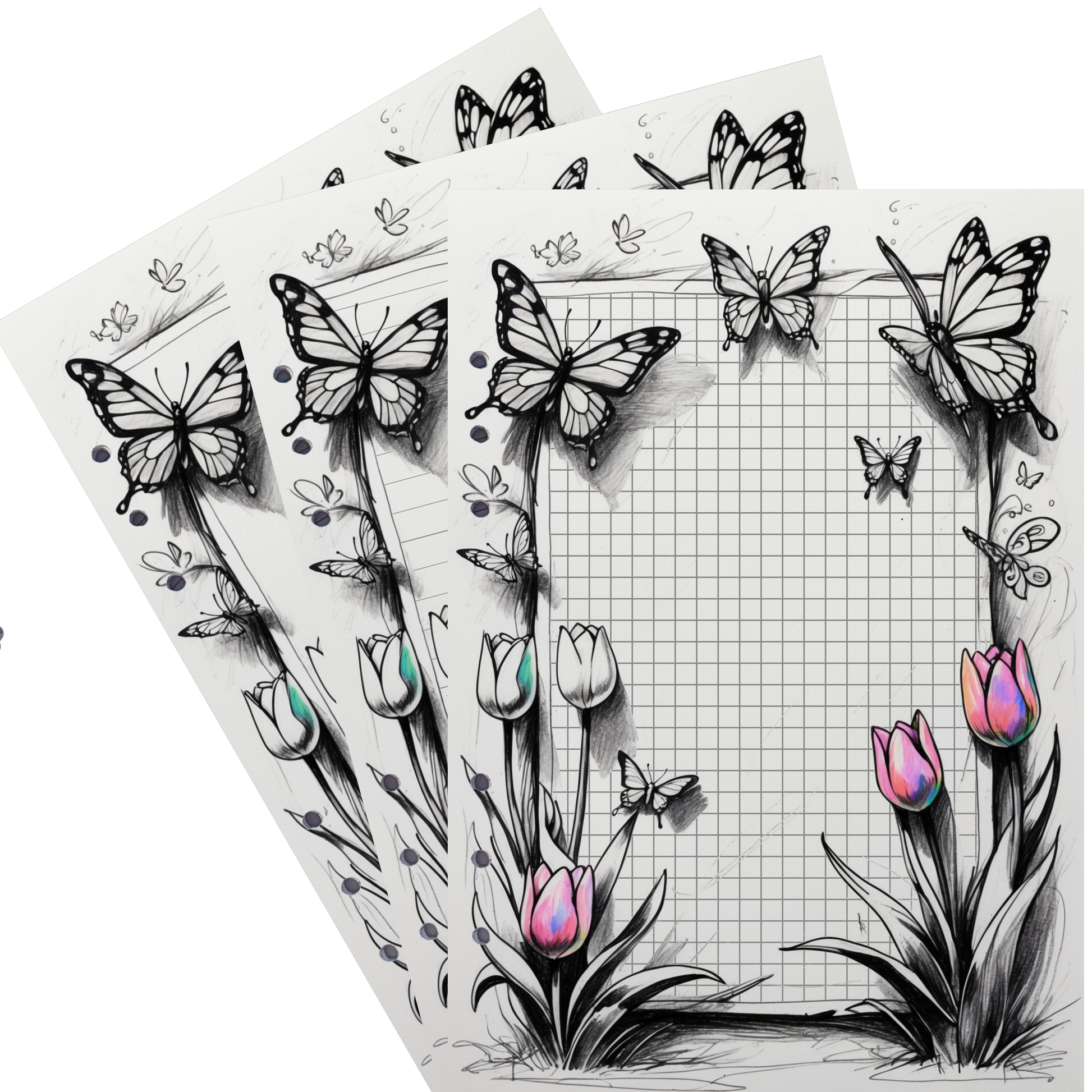Kreatives Design: Die tulpen und Schmetterlinge bieten eine wunderbare Ausmalvorlage, die Ihre Notizen zu einem ganz persönlichen Kunstwerk macht.