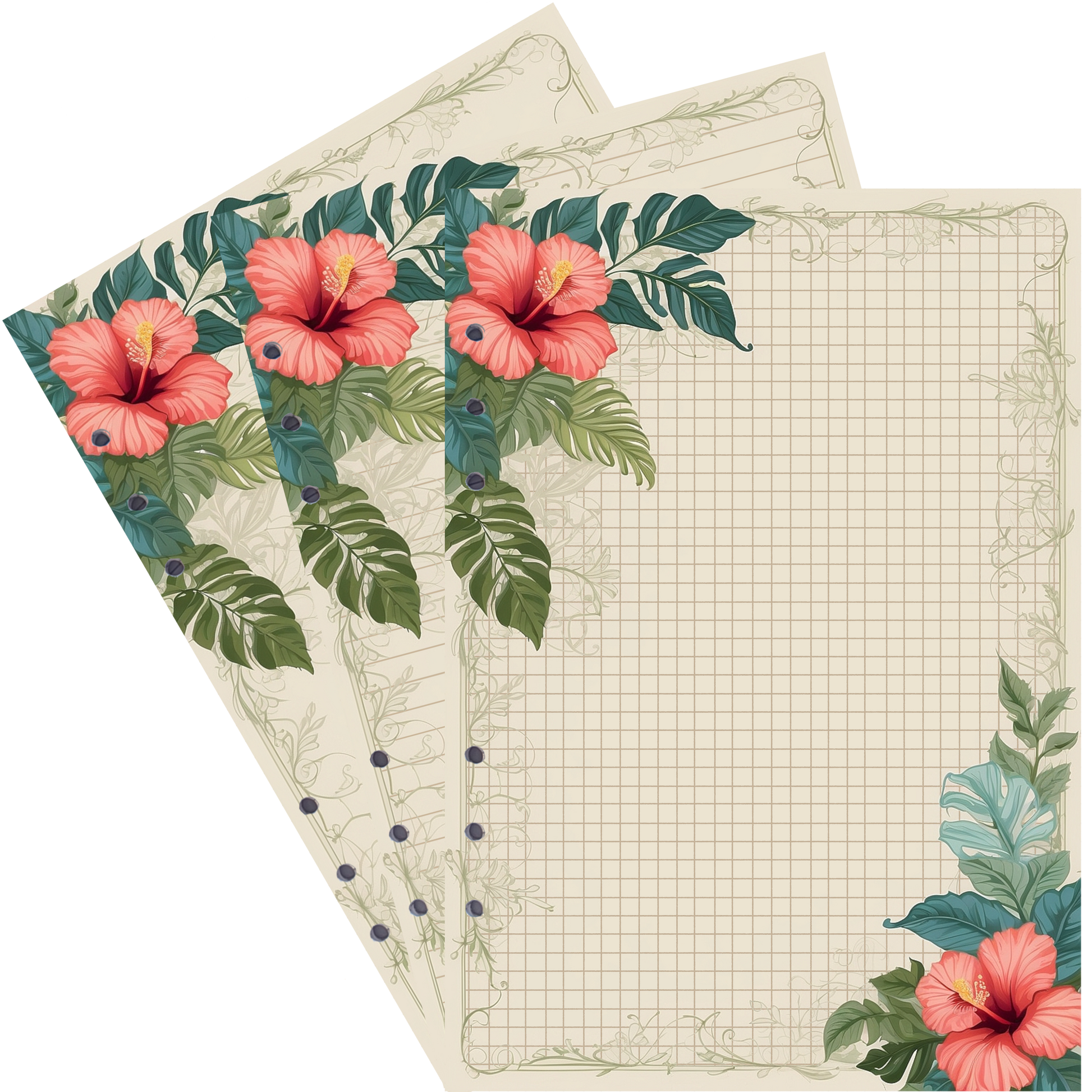 Verleihen Sie Ihrem Ringbuch eine florale Eleganz mit unseren liebevoll designten Hibiskus-Ringbucheinlagen. Unsere DIN A5 Nachfüllseiten bieten eine beeindruckende Vielfalt an Hibiskusmotiven und sind in verschiedenen Lineaturen (blanco, liniert oder kariert) erhältlich, um Ihre Notizen stilvoll zu ergänzen. Ideal für den täglichen Gebrauch, kreative Projekte oder berufliche Notizen.