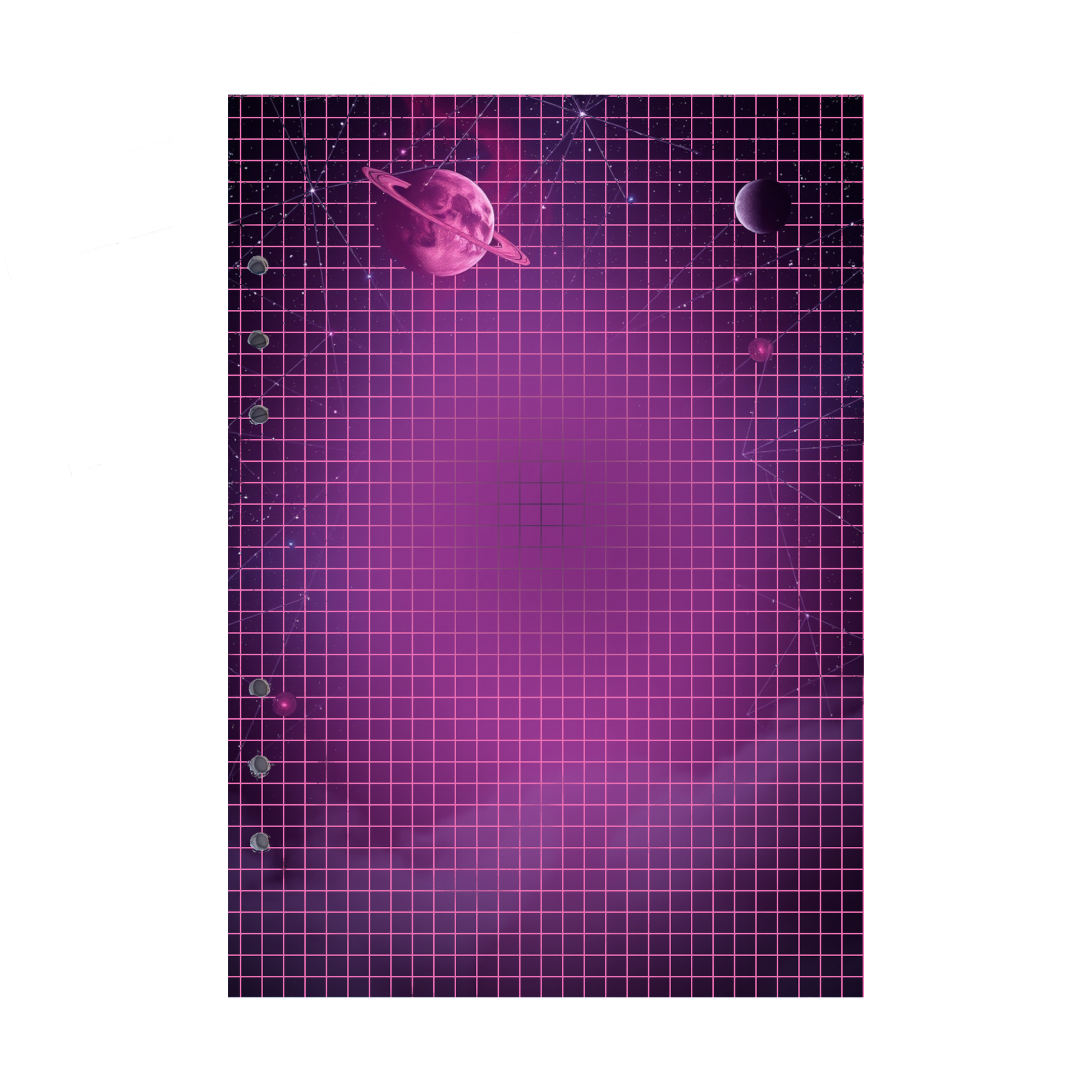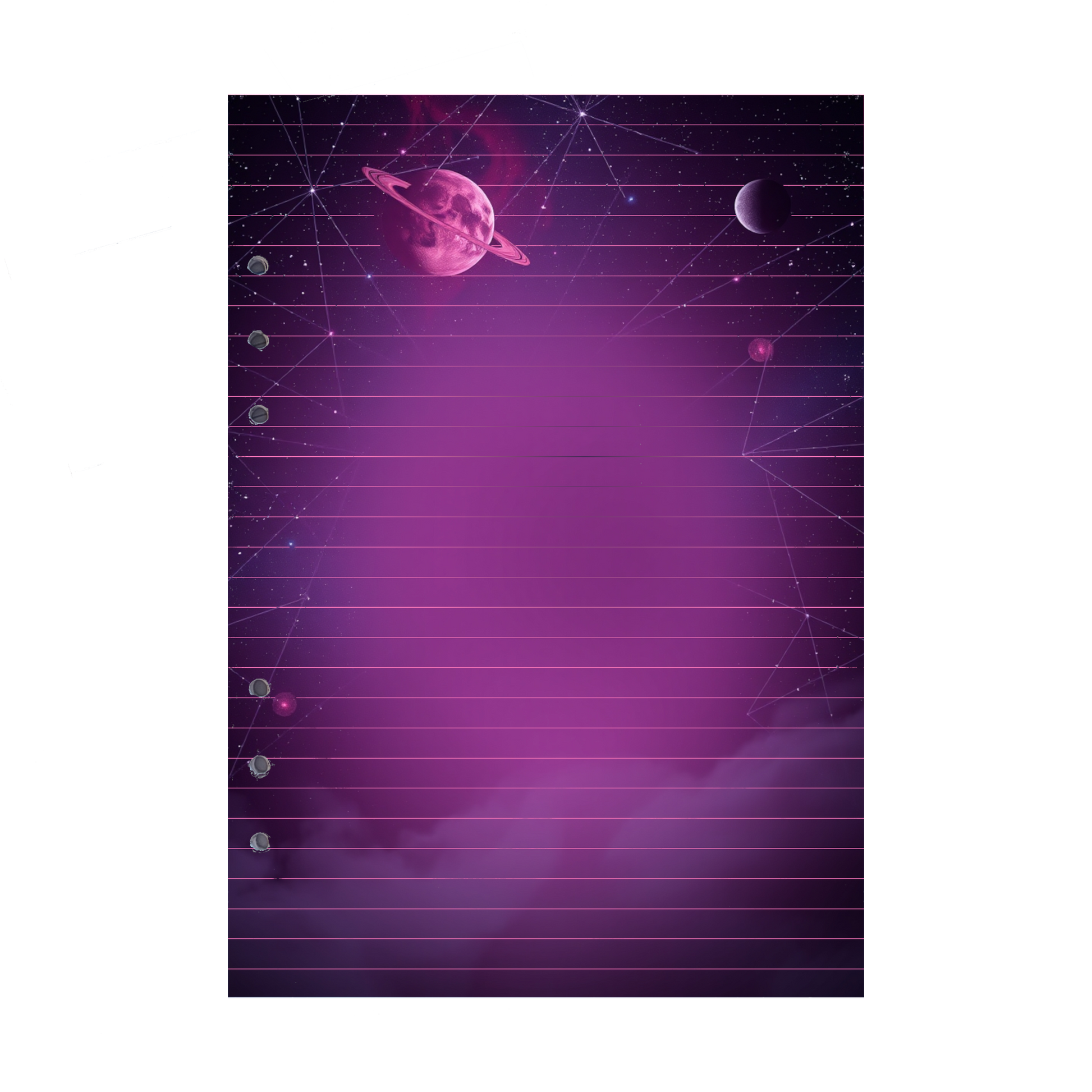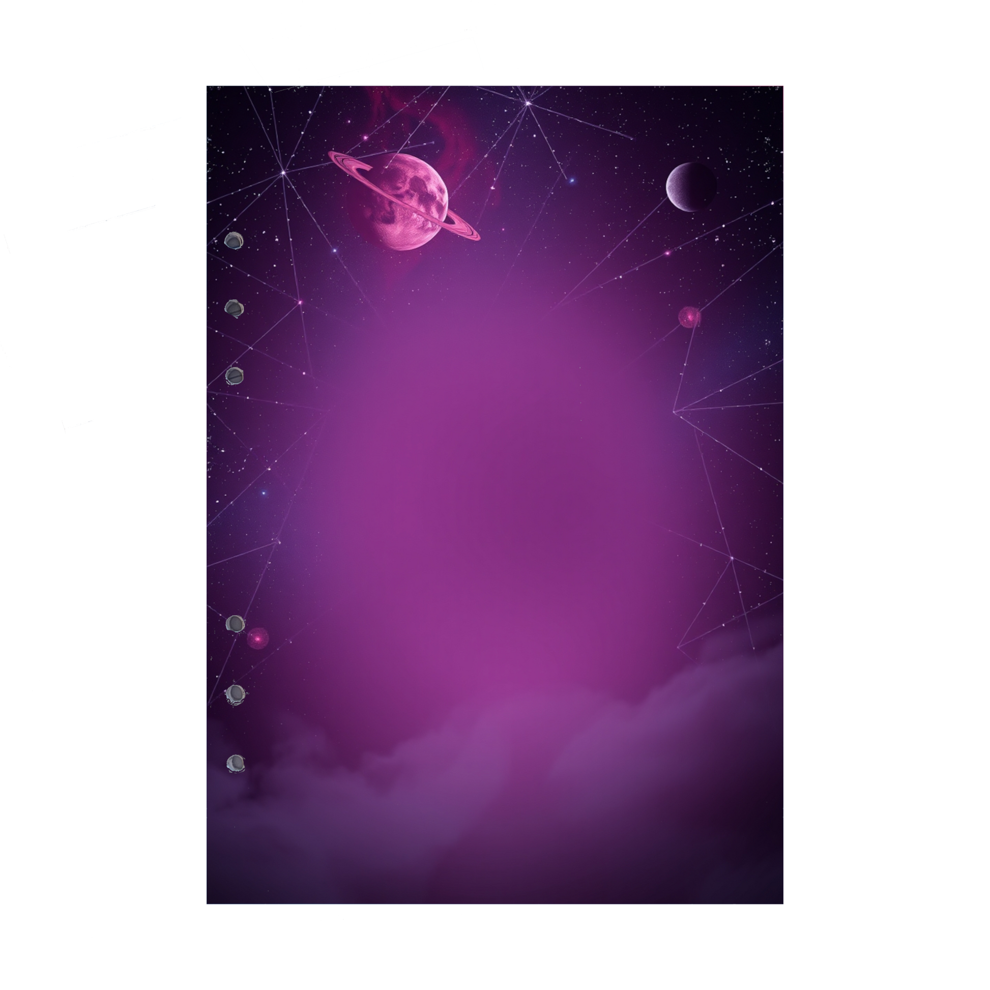 Erleben Sie die harmonische Schönheit des Universums mit unseren DIN A5 Ringbuch Nachfüllseiten im "Magic Cosmos 18"-Design. Ein lila-roter Himmel in sanften Tönen entfaltet sich über die Seite, wobei die Farben perfekt miteinander verschmelzen und eine warme, fast mystische Atmosphäre schaffen. Unten ziehen zarte Wolken entlang und Planeten schweben in der Ferne, was das Design mit einer ruhigen und doch beeindruckenden kosmischen Ausstrahlung vervollständigt.