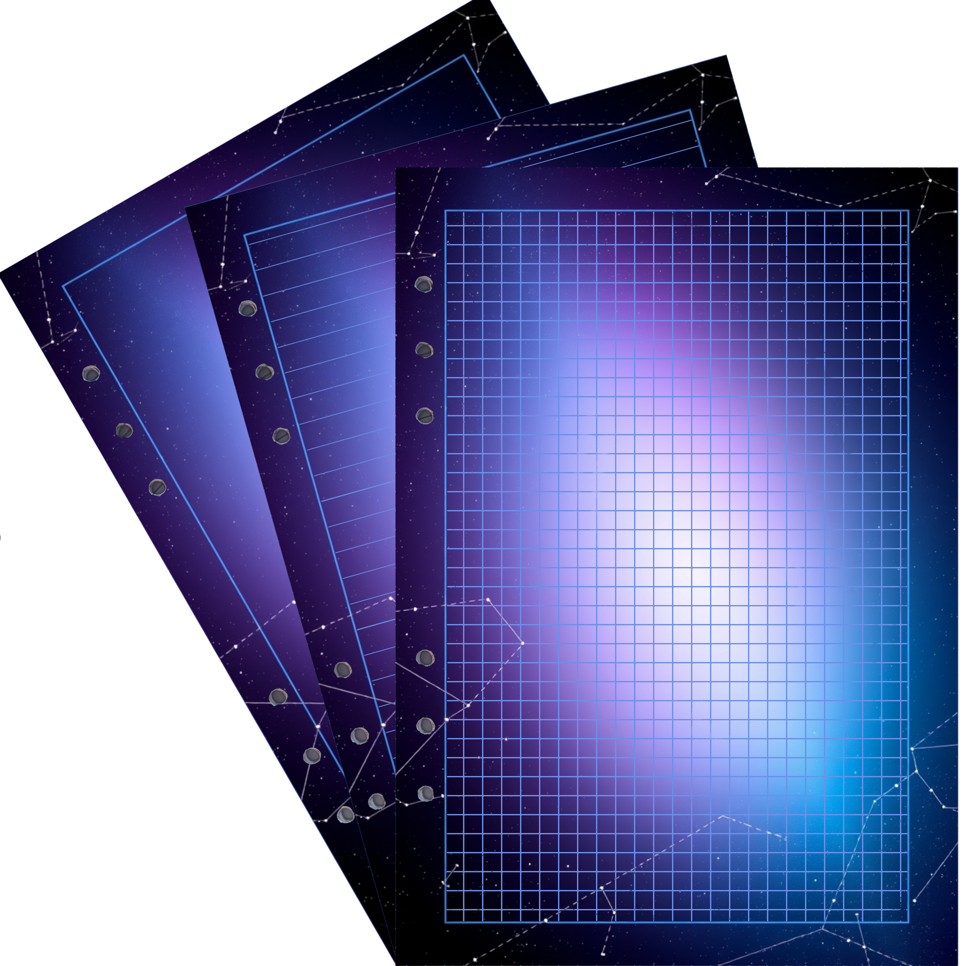 Erleben Sie den Zauber des nächtlichen Himmels mit unseren DIN A5 Ringbuch Nachfüllseiten im "Magic Cosmos 21"-Design. Ein faszinierender Übergang von Lila zu Blau zieht sich über die Seite und spiegelt den majestätischen Himmel wider. Seitlich schmücken zarte Sternbilder den Raum und verleihen dem Design eine kosmische Tiefe und Ruhe. Dieses Design fängt die mystische Schönheit der Nacht ein und bringt die Weiten des Universums in Ihr Ringbuch.