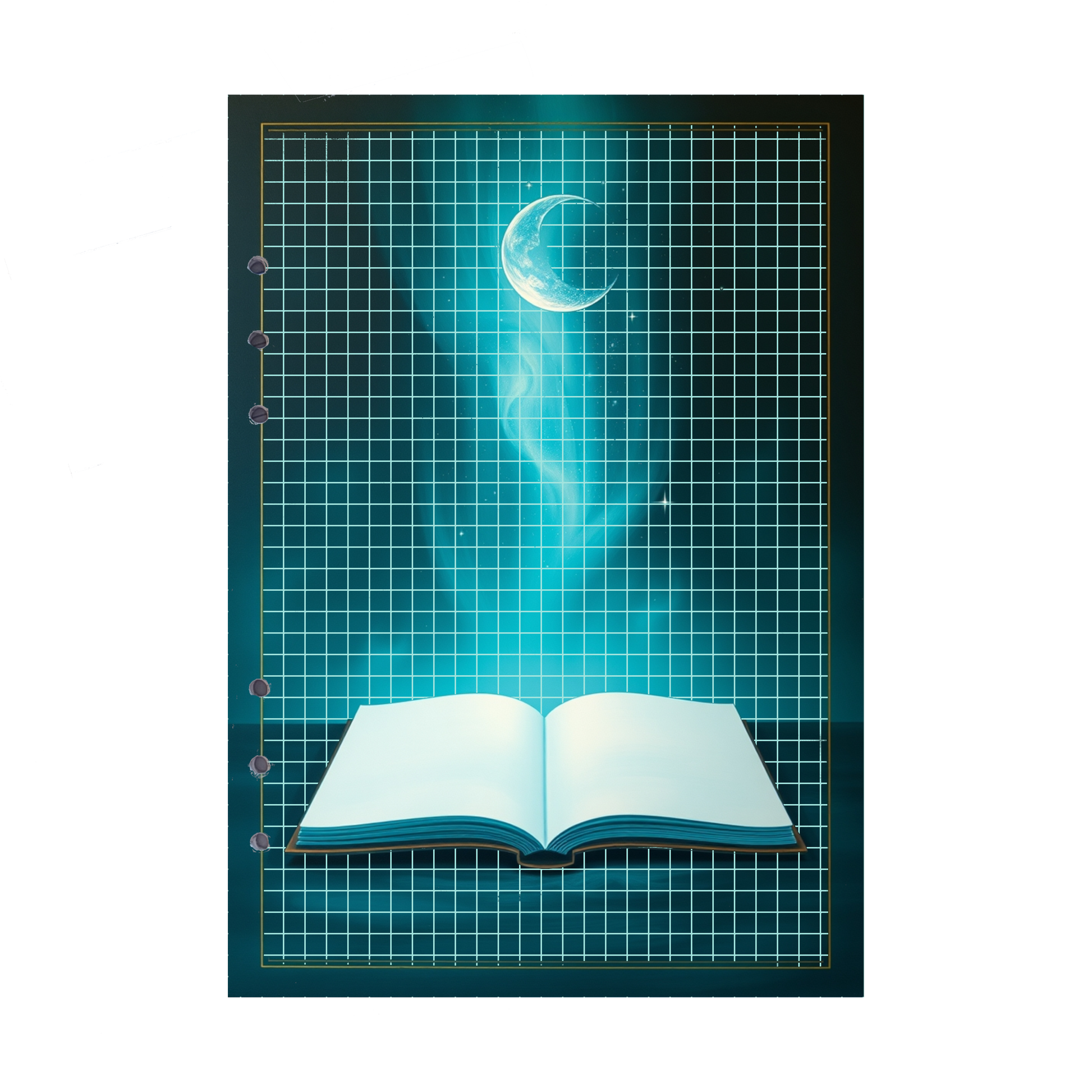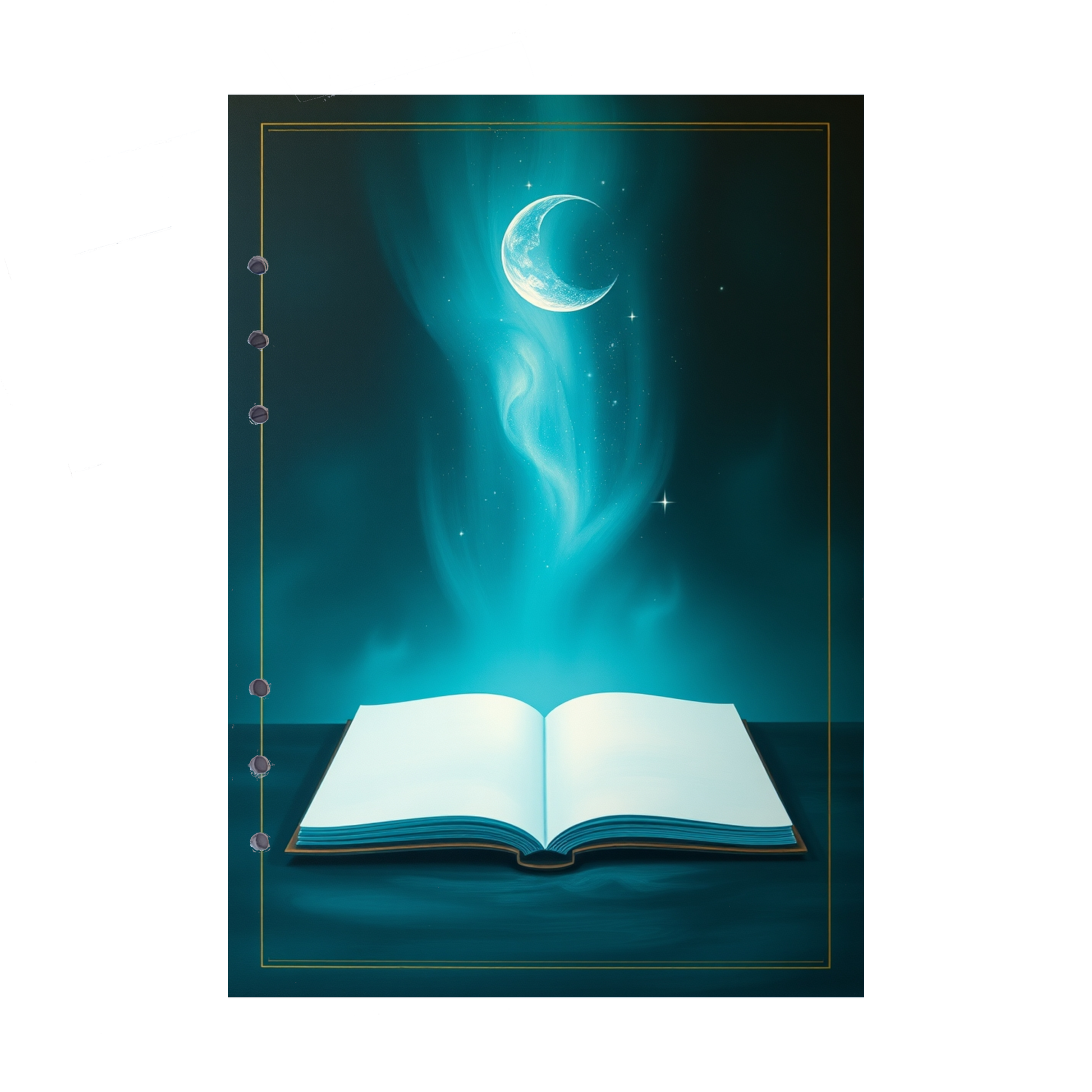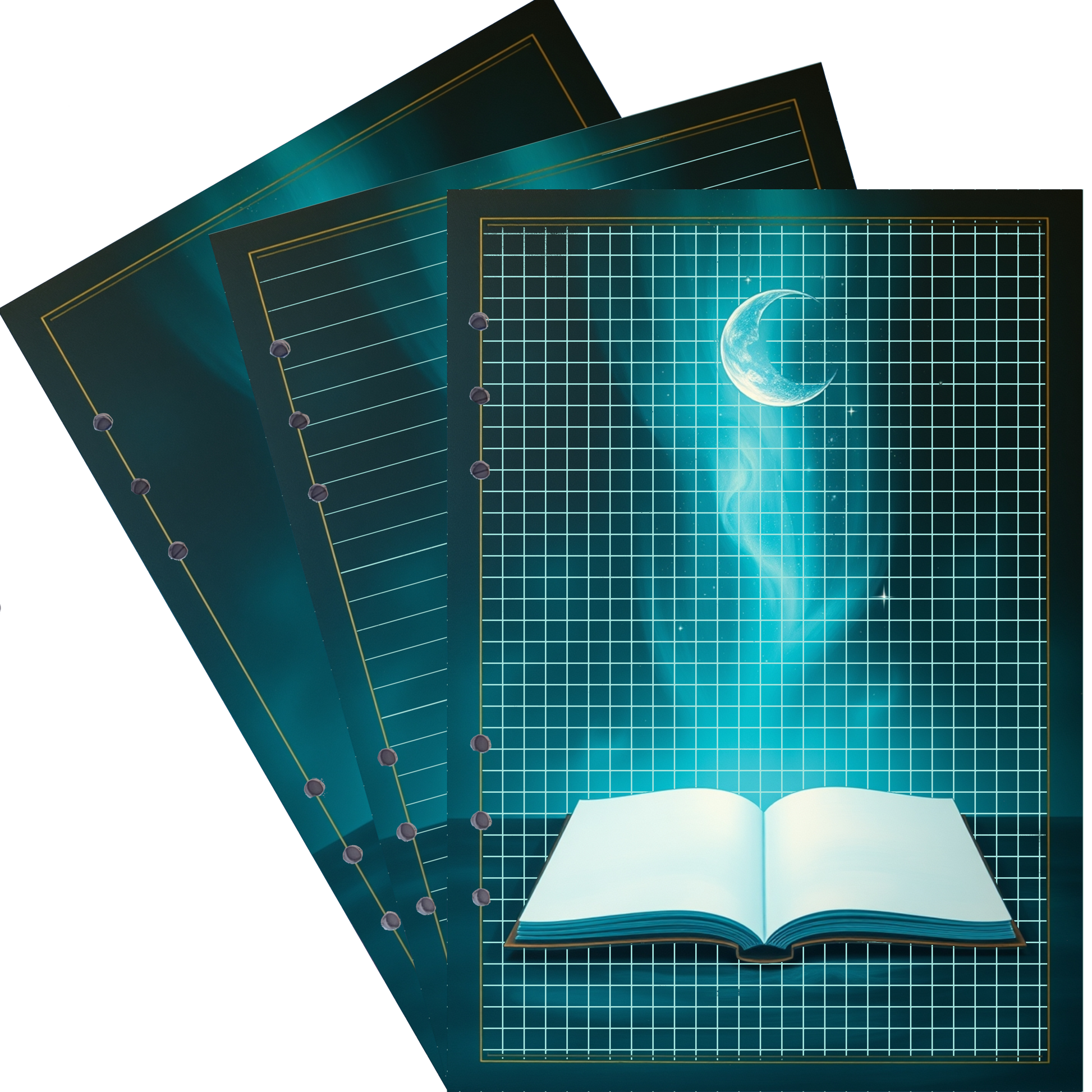Tauchen Sie ein in eine Welt voller Magie und Geheimnisse mit unseren DIN A5 Ringbuch Nachfüllseiten im "Magic Cosmos 33"-Design. Auf einem smaragd-grünen Hintergrund liegt ein geöffnetes Buch, aus dessen weißen Seiten der Nebel aufsteigt und in Richtung eines leuchtenden Mondes zieht. Dieses Design kombiniert die Ruhe eines nächtlichen Himmels mit der mystischen Symbolik des aufsteigenden Wissens und verleiht Ihren Notizen eine tiefgründige und magische Atmosphäre.