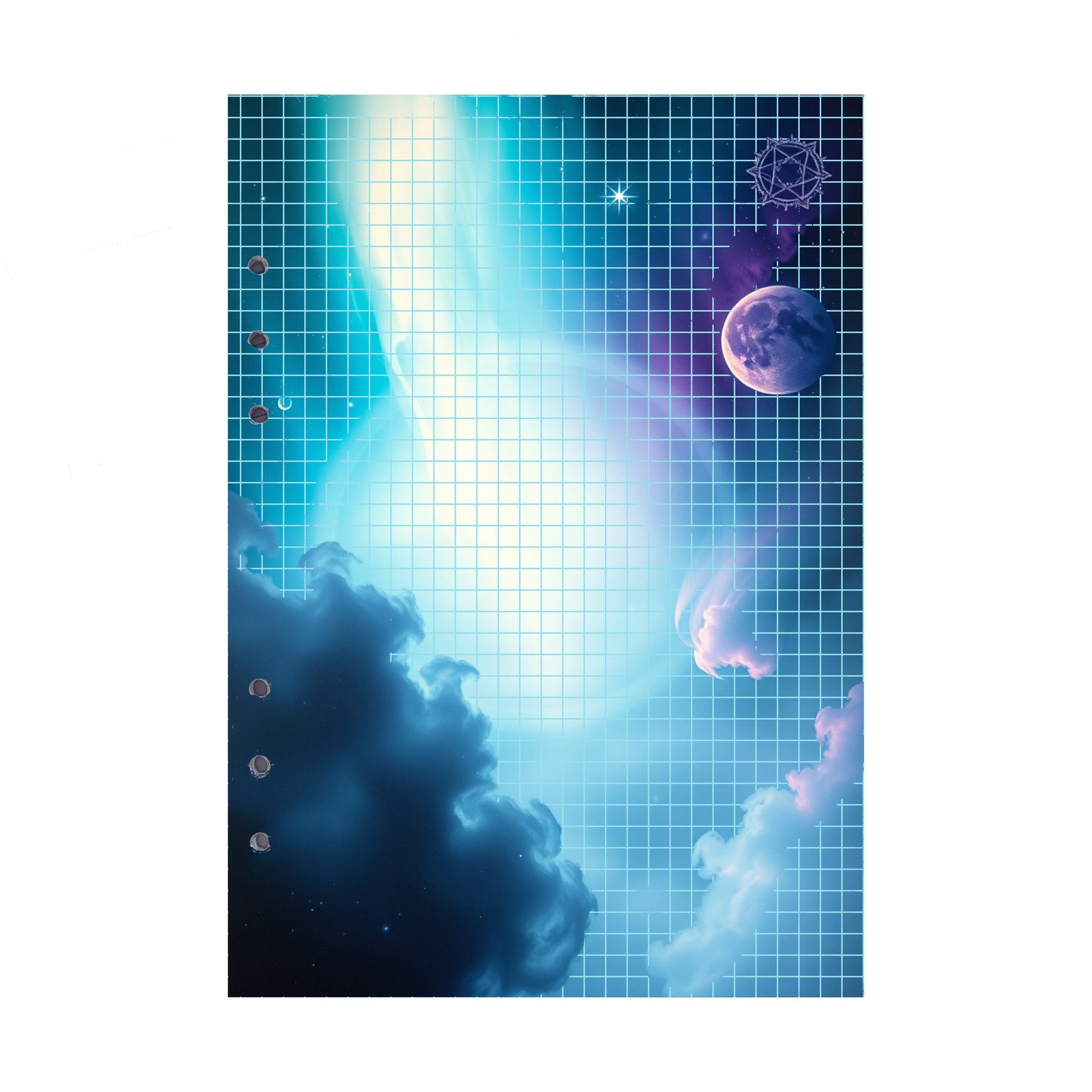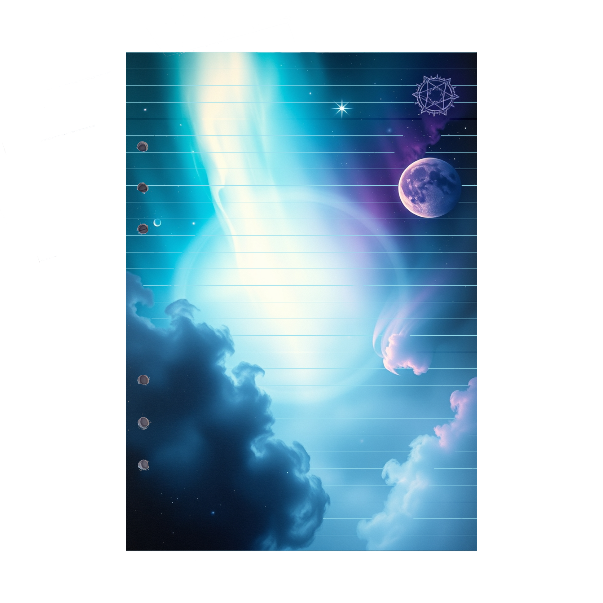 Erleben Sie die geheimnisvolle Schönheit des Nachthimmels mit unseren DIN A5 Ringbuch Nachfüllseiten im "Magic Cosmos 38"-Design. Unten links zieht eine dunkle Wolkenformation über die Seite, während oben rechts der Mond in seiner vollen Pracht leuchtet. Die Mitte der Seite strahlt in hellem Licht, umrahmt von einem sanften Halo-Ring, der dem Design eine mystische und beruhigende Ausstrahlung verleiht. Dieses Design fängt die Harmonie zwischen Dunkelheit und Licht in einer kosmischen Szenerie perfekt ein.