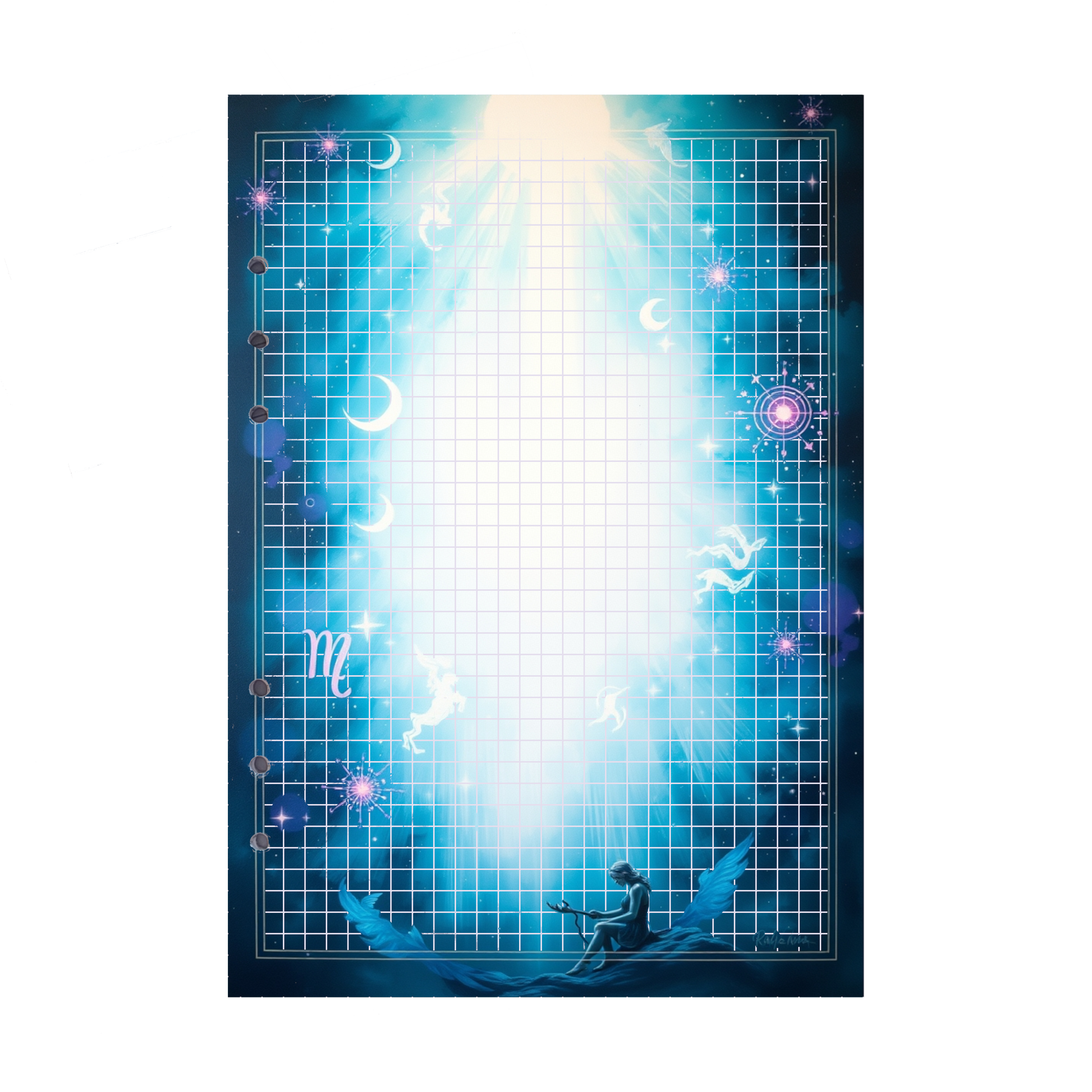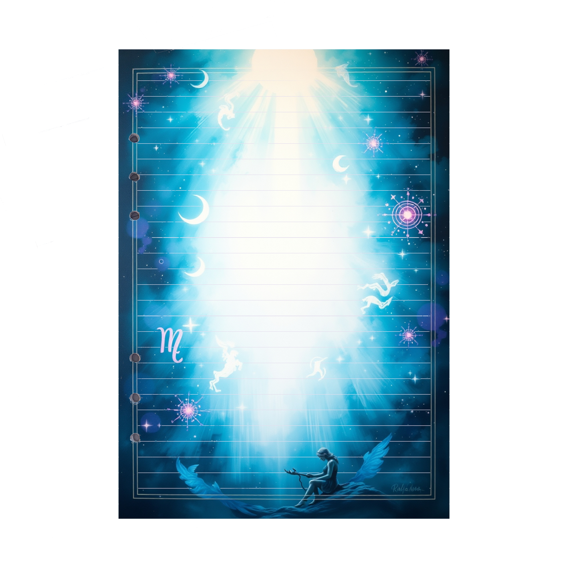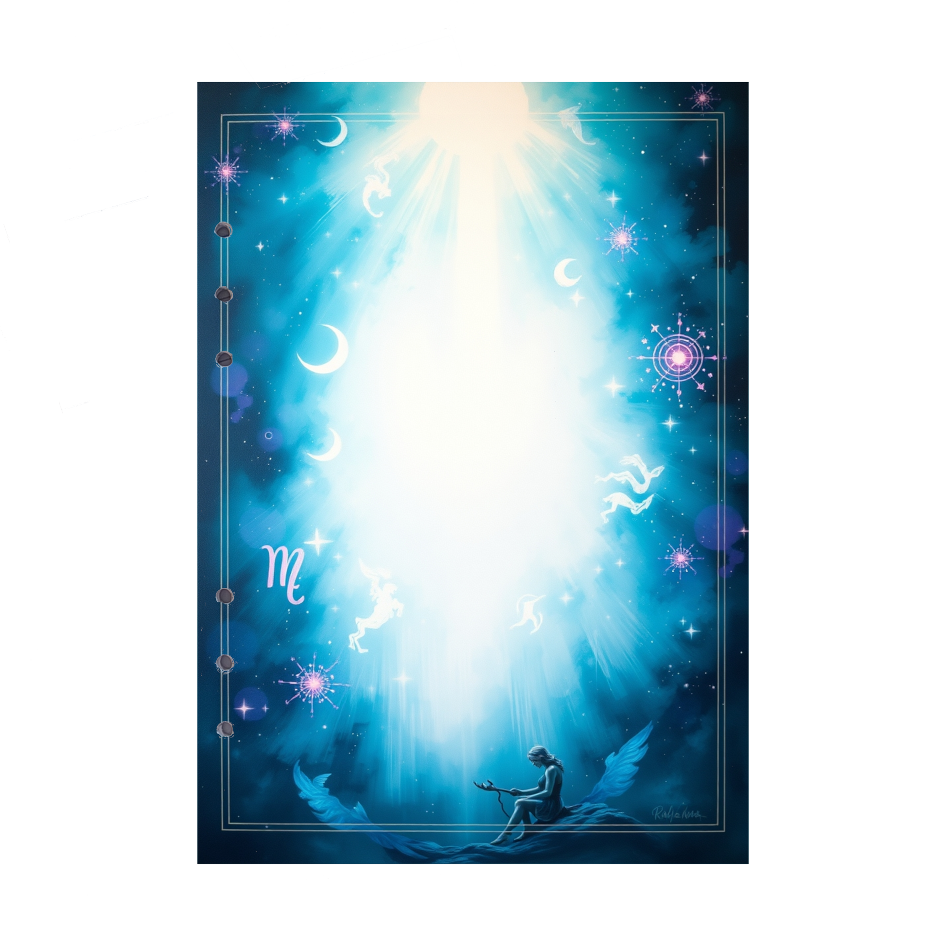 Lassen Sie sich von der magischen Verbindung zwischen Natur und Kosmos verzaubern mit unseren DIN A5 Ringbuch Nachfüllseiten im "Magic Cosmos 39"-Design. Von oben fallen Sonnenstrahlen herab, die die Sternzeichen vom Himmel zu erden scheinen. Unten am Rand sitzt eine Elfe friedlich auf einem Felsen am Ufer eines stillen Gewässers, umgeben von der kosmischen Energie, die in den Sternen schwebt. Dieses Design vereint mystische Elemente und eine harmonische Verbindung zur Natur, die sowohl Ruhe als auch Inspiration bietet.