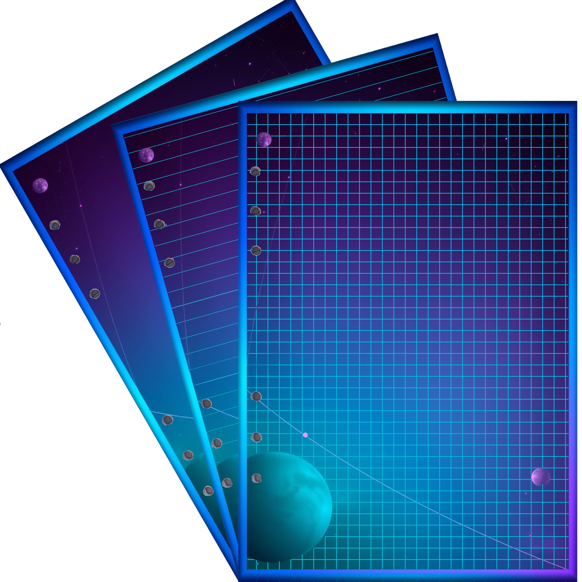 Erleben Sie die kraftvolle Schönheit des Kosmos mit unseren DIN A5 Ringbuch Nachfüllseiten im "Magic Cosmos 4"-Design. Ein intensiver, kräftiger Ombre-Himmel in tiefen Blautönen, der sich von hell nach dunkel erstreckt, bildet den atemberaubenden Hintergrund für einen majestätischen blauen Planeten, der in die Weiten des Universums aufsteigt. Dieses Design fängt die unendliche Tiefe des Kosmos ein und verleiht Ihren Notizen eine dynamische, kraftvolle Ausstrahlung.
