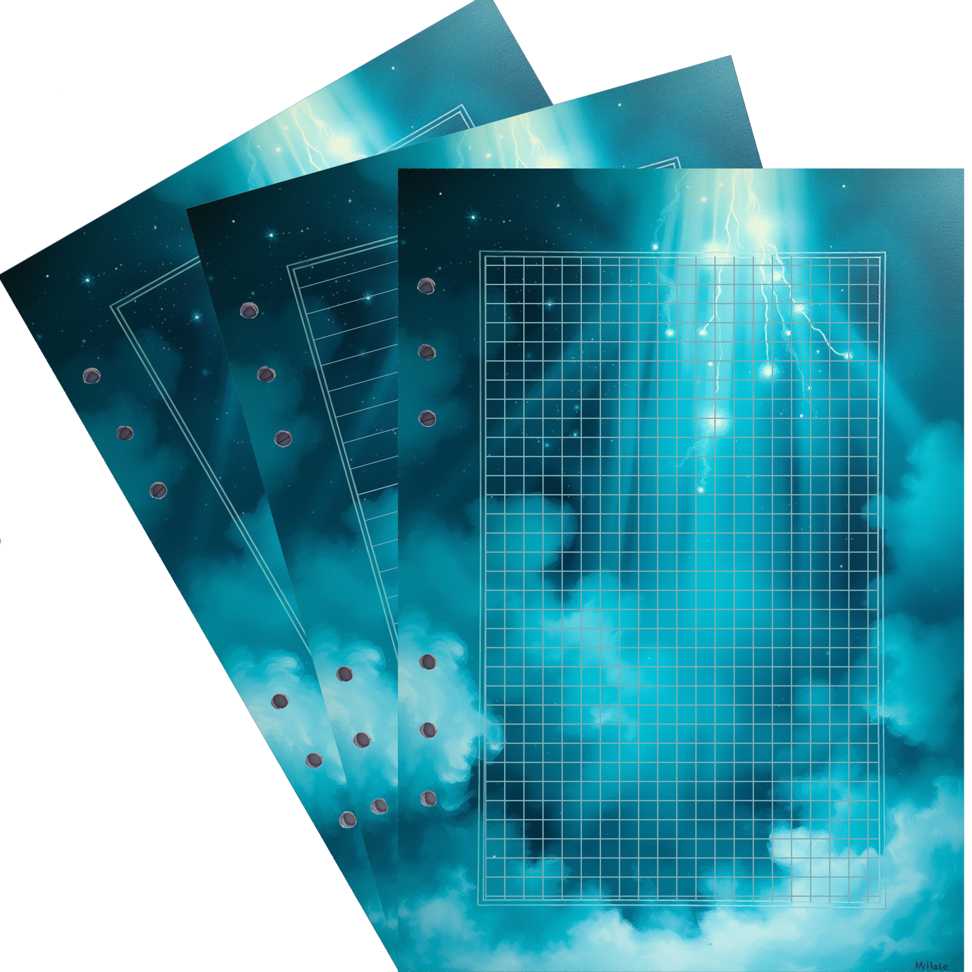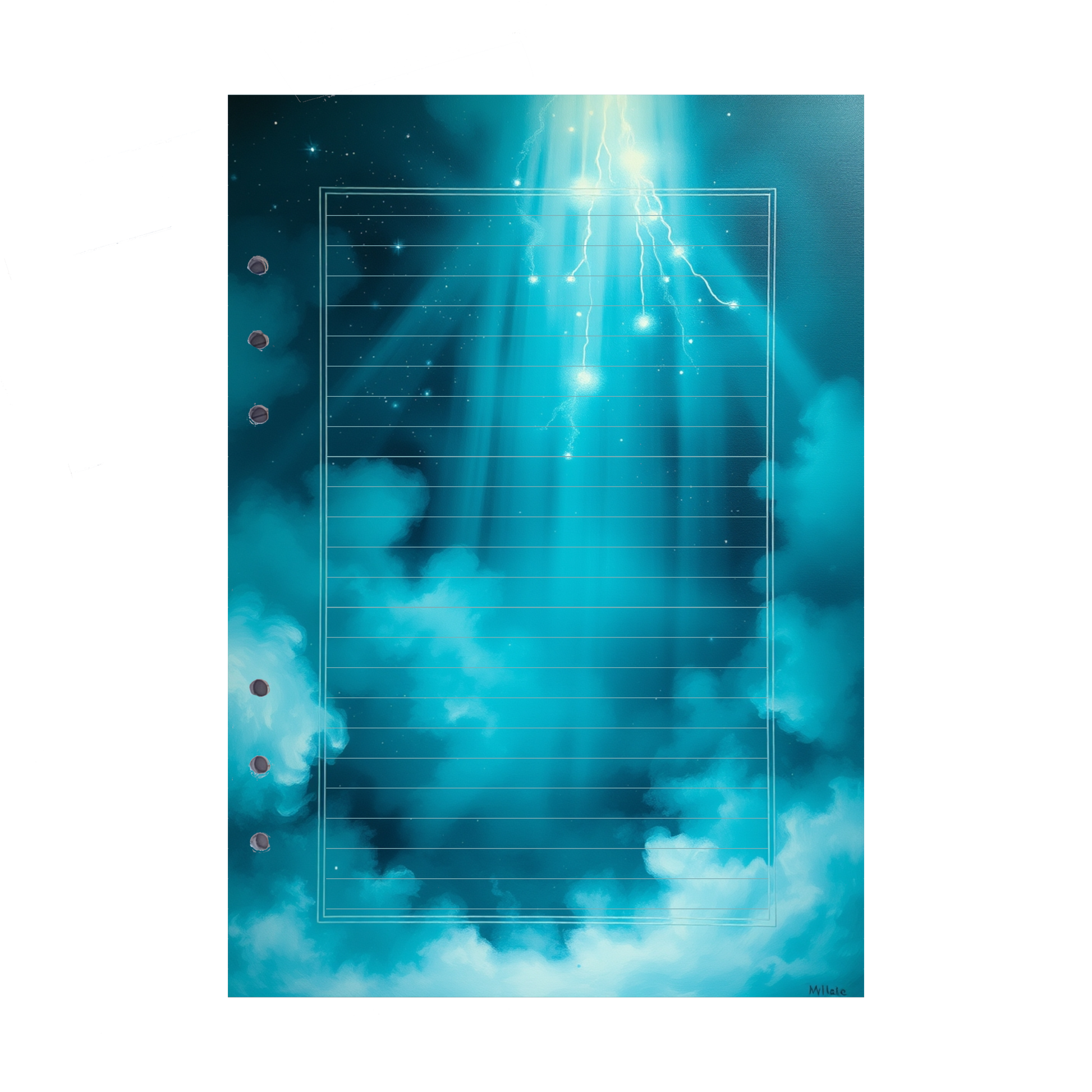 Erleben Sie die beeindruckende Energie des Kosmos mit unseren DIN A5 Ringbuch Nachfüllseiten im "Magic Cosmos 42"-Design. Der Himmel ist zur Hälfte mit Wolken bedeckt, während auf der anderen Seite ein klarer, leuchtend blauer Sternenhimmel erstrahlt. Ein Blitz zuckt plötzlich von oben herab und verleiht der Seite eine dynamische, fast elektrische Atmosphäre. Dieses Design fängt die kraftvolle Spannung und die Weite des Universums ein und bringt eine aufregende, kosmische Energie in Ihr Ringbuch.