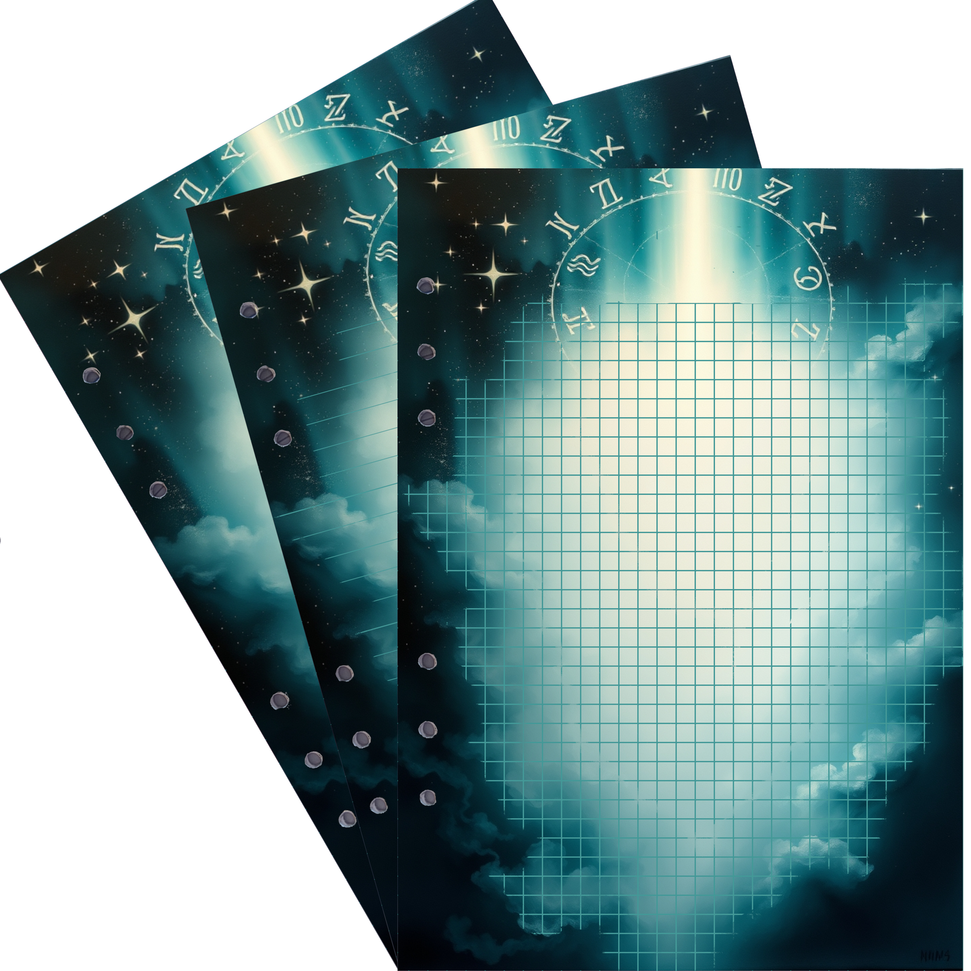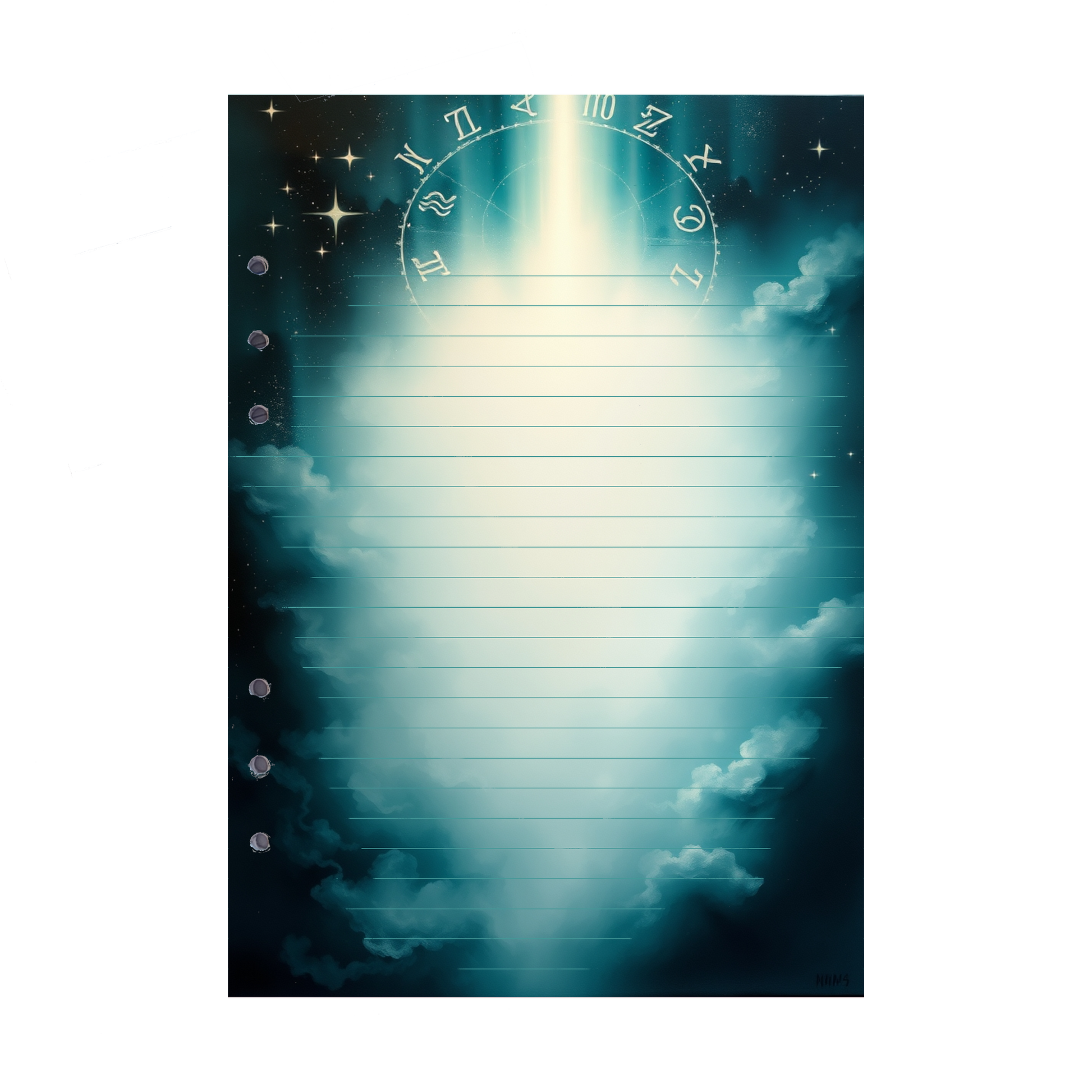 Lassen Sie sich von der kosmischen Kraft des Universums inspirieren mit unseren DIN A5 Ringbuch Nachfüllseiten im "Magic Cosmos 44"-Design. Oben prangt ein majestätisches Sternzeichenrad, durch das ein heller Lichtstrahl hindurchbricht und die Seite in kraftvollem Licht erstrahlen lässt. Unten ziehen sich dicke, smaragdgrüne Wolken durch das Design und verleihen der Szene eine mystische Tiefe. Diese beeindruckende Darstellung von Licht und Dunkelheit bringt eine energiegeladene und zugleich beruhigende Atmosphäre in Ihr Ringbuch.
