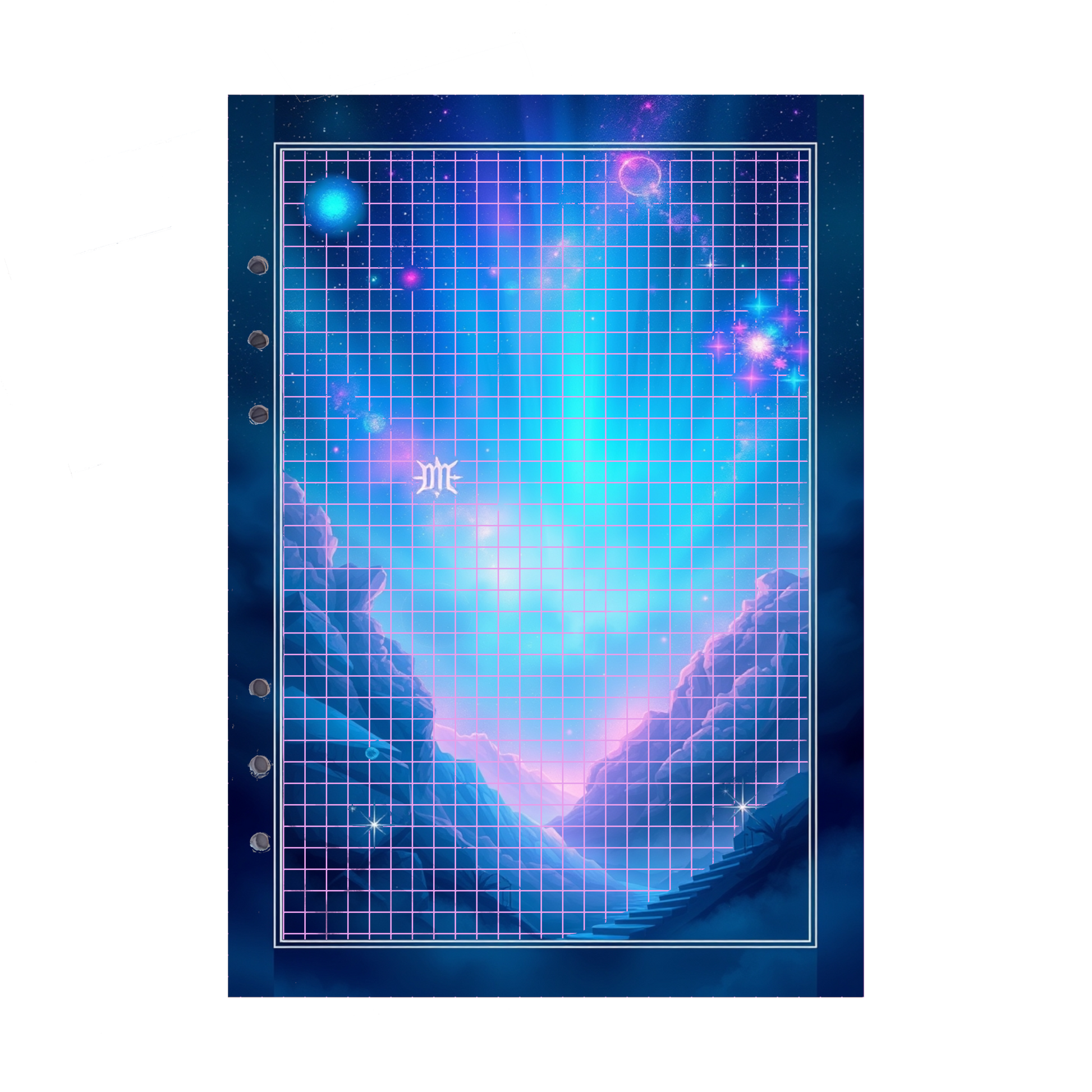 Erklimmen Sie mit unseren DIN A5 Ringbuch Nachfüllseiten im "Magic Cosmos 45"-Design neue Höhen und entdecken Sie eine himmlische Szenerie. Massive Berge erheben sich majestätisch, und eine Treppe führt hinauf, als ob sie Sie auf eine Reise in die unendlichen Weiten des Kosmos einlädt. Umrahmt von pinken und hellblauen Aurora-Lichtern und funkelnden kleinen Galaxien, strahlt die gesamte Szene in hellen Blau- und Pinktönen. Dieses Design verkörpert eine aufregende Mischung aus Natur und kosmischer Magie und verleiht Ihrem Ringbuch eine fantasievolle und lebendige Ausstrahlung.