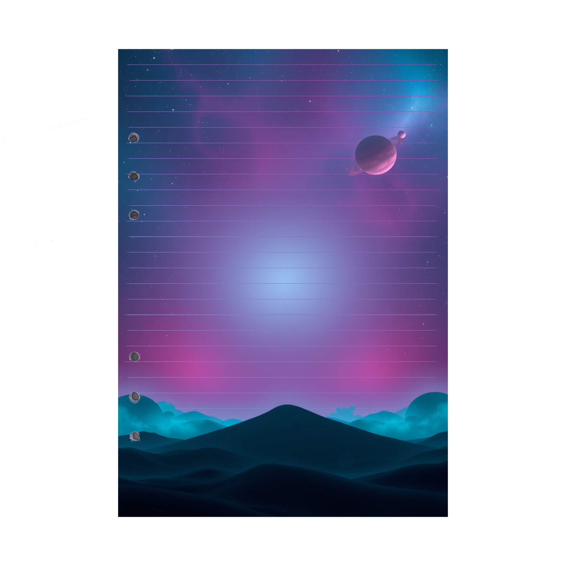 Lassen Sie sich von der majestätischen Schönheit des Universums inspirieren mit unseren DIN A5 Ringbuch Nachfüllseiten im "Magic Cosmos 7"-Design. Über tiefblauen Bergen zieht ein beeindruckender Planet ruhig durch einen violetten Nachthimmel, dessen Farben den Blick in die Weiten des Kosmos öffnen. Die dramatische Szenerie aus Bergen und Himmelskörpern entfaltet eine Atmosphäre von Ruhe und unendlicher Weite, die Ihre Gedanken in eine andere Dimension entführt.