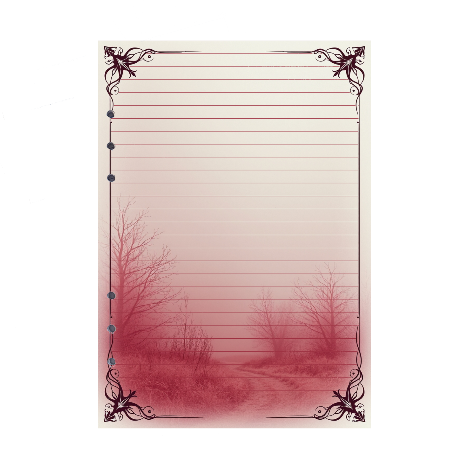 Das Mystic Fog 18-Design, mit seinem dichten hellrosa Nebel und den grell pinken Bäumen, schafft eine einzigartige, energiegeladene Atmosphäre. Der malerische Feldweg, umgeben von kahlen Bäumen, fügt eine gewisse Ruhe hinzu, während die kräftigen Farben eine dynamische Stimmung erzeugen. Ideal für alle, die ihre Notizen in einer lebendigen, inspirierenden Umgebung festhalten möchten.