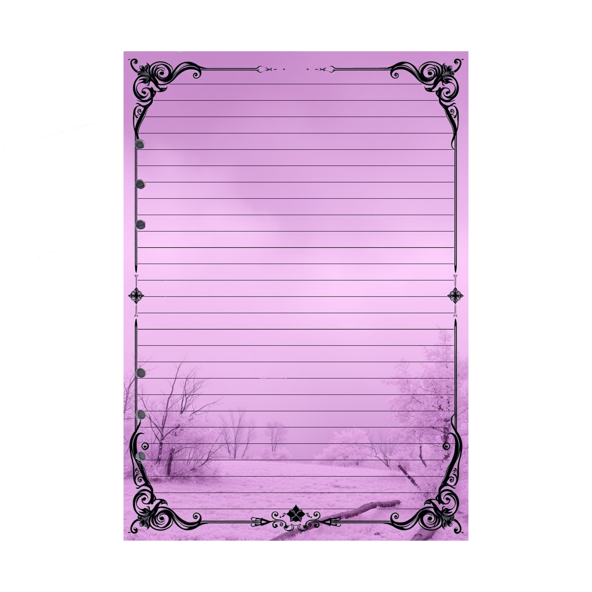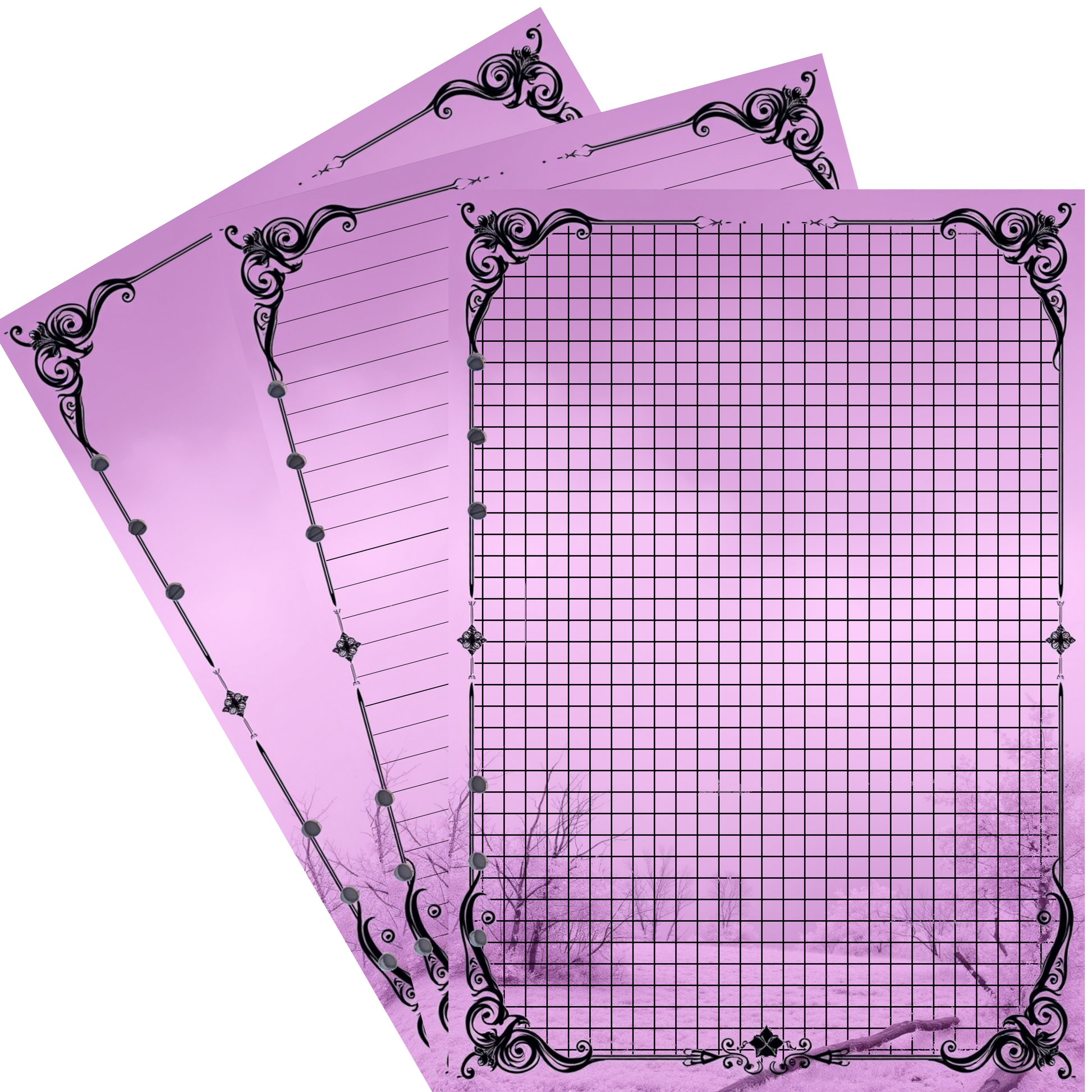 Tauchen Sie ein in eine Welt voller geheimnisvoller Schönheit mit unseren exklusiven DIN A5 Ringbucheinlagen im mystischen Mystic Fog 2-Design. Diese einzigartigen Nachfüllseiten präsentieren eine karge Landschaft in sanftem Flieder, durchzogen von zarten Bäumen in voller Blüte, die eine friedliche und zugleich surreal wirkende Atmosphäre schaffen. Umrahmt von einem schwarzen Vintage-Rahmen, verleiht dieses Design Ihren Notizen eine elegante und mystische Note – perfekt für alle, die das Besondere lieben und ihre Gedanken in einer inspirierenden Umgebung festhalten möchten.