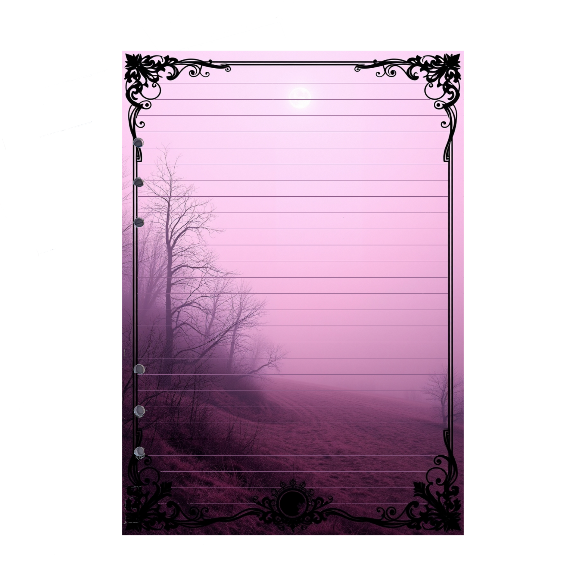 Das Mystic Fog 36-Design mit dem sanft ansteigenden Feld und dem Waldrand, umhüllt von kräftigem Lila und weichem Nebel in sanftem Lila, schafft eine friedliche, fast magische Stimmung. Diese einzigartige Szenerie lässt Ihre Notizen in einer beruhigenden, inspirierten Umgebung entstehen.
