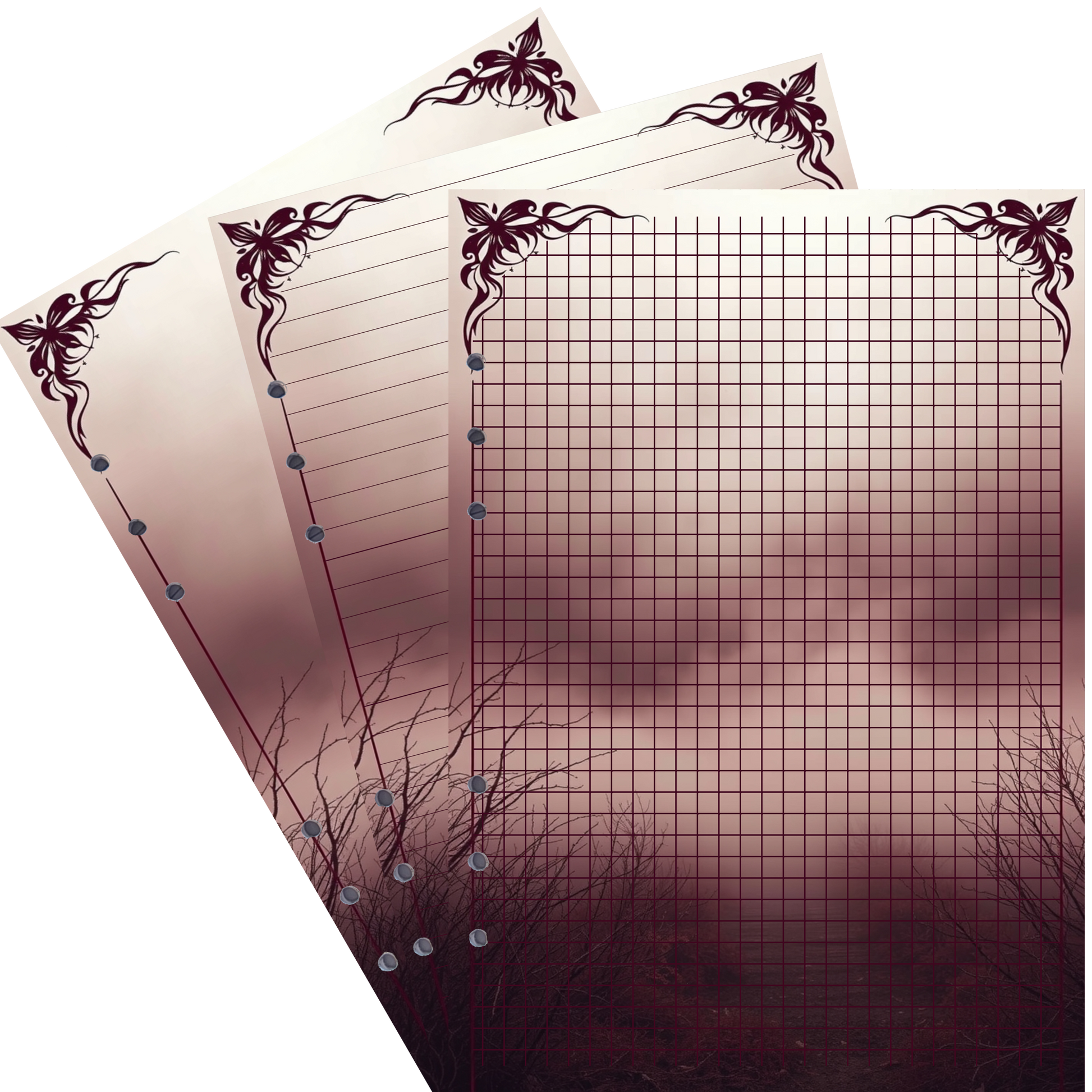 Das Mystic Fog 45-Design mit dem erdigen Pfad, der von Sträuchern gesäumt ist und in warmen Braun- und Dunkelbordeaux-Tönen gehalten ist, verleiht Ihren Notizen eine besonders erdige und beruhigende Atmosphäre. Die sanften Farben und der leichte Nebel laden zum Nachdenken und Reflektieren ein.