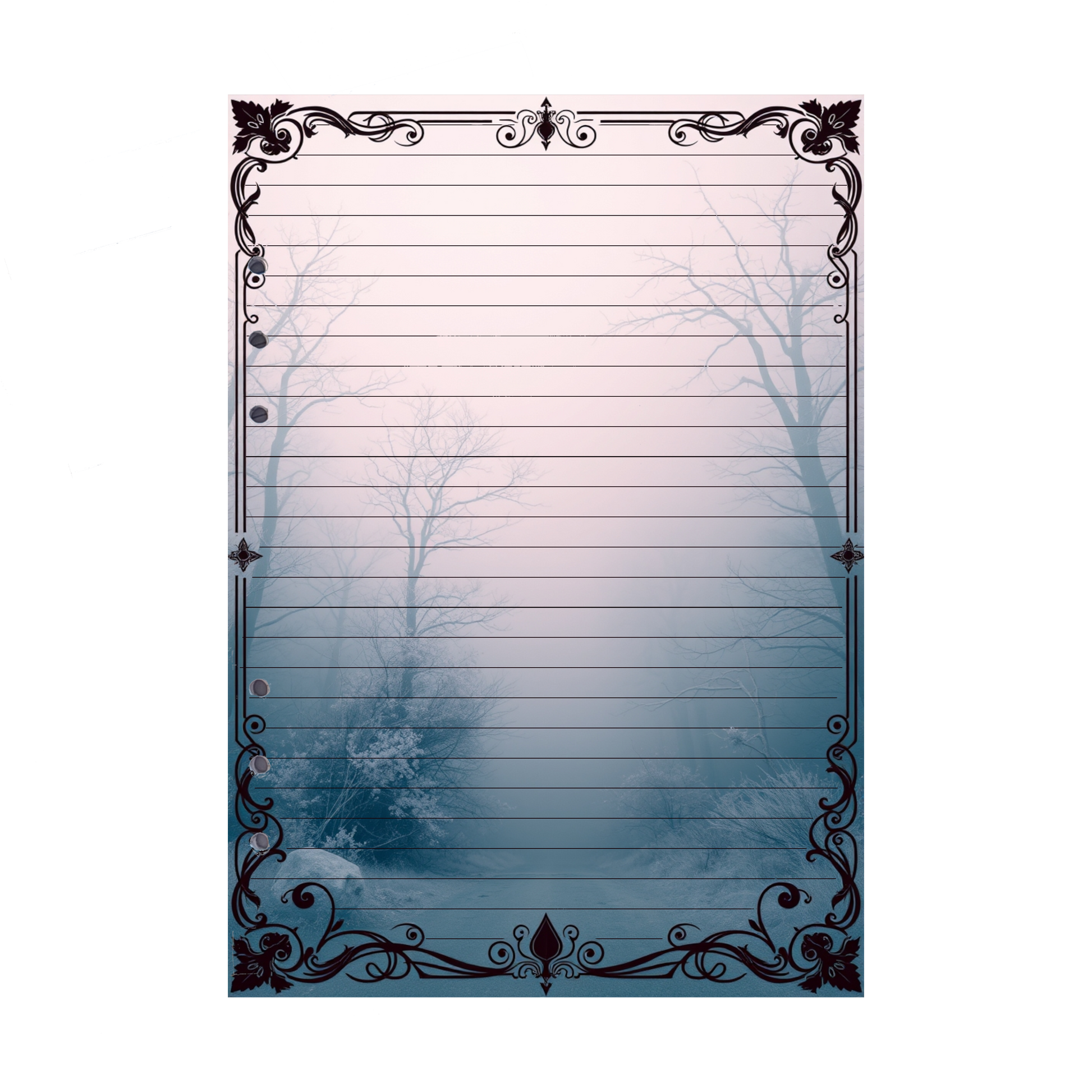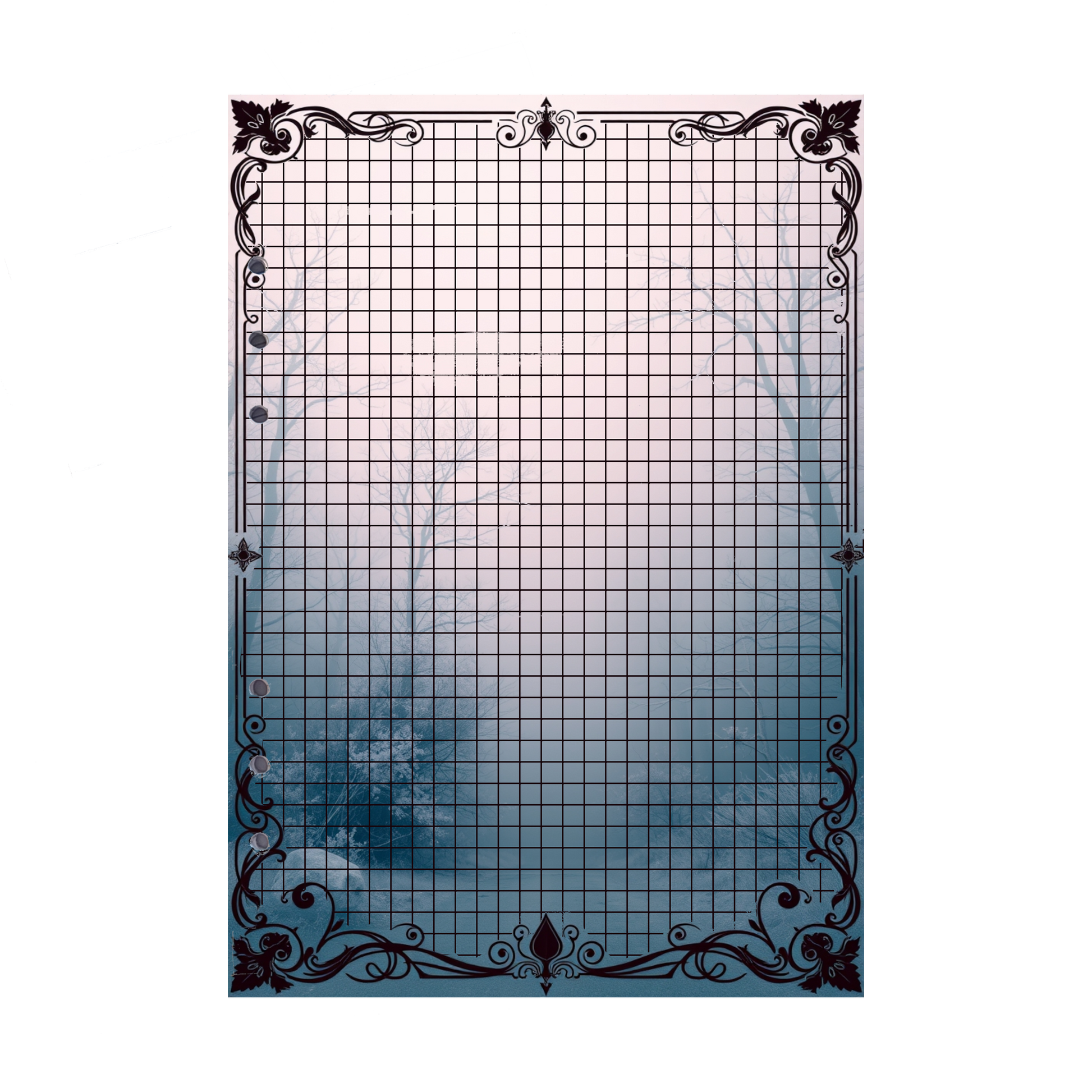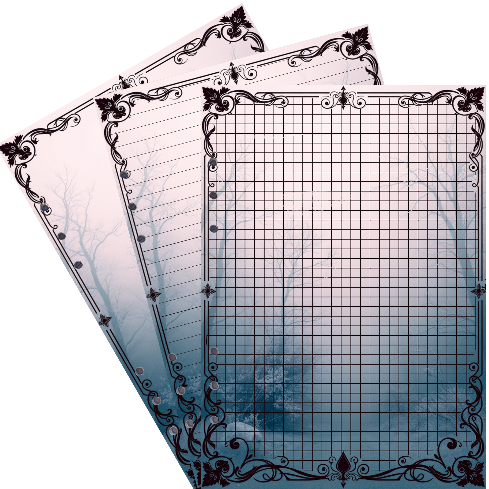 Verleihen Sie Ihren Notizen eine mystische und düstere Atmosphäre mit unseren exklusiven DIN A5 Ringbucheinlagen im Mystic Fog 47-Design. Ein blau-grauer Waldweg schlängelt sich durch die dichte Vegetation aus Bäumen und Sträuchern und wird von einem geheimnisvollen Nebel umhüllt. Die düstere Stimmung des Weges und der Umgebung lässt Ihre Gedanken in eine beinahe surreal anmutende Welt eintauchen – ideal für kreative Ideen und tiefgründige Notizen.