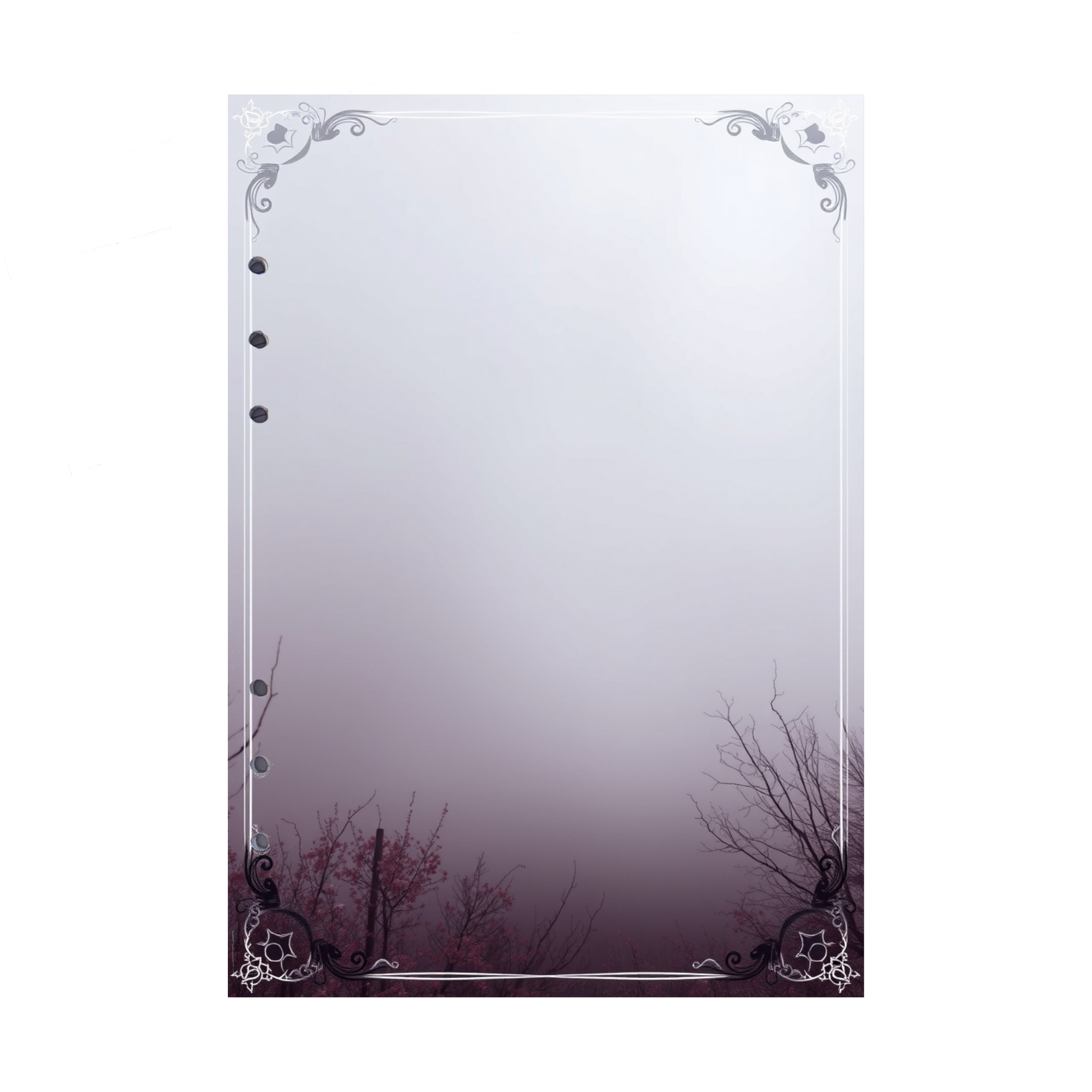 Erleben Sie die beruhigende Atmosphäre eines nebligen Waldes mit unseren exklusiven DIN A5 Ringbucheinlagen im Mystic Fog 49-Design. Die Spitzen von Bäumen zeichnen sich vage am unteren Rand ab, während der restliche Teil der Szenerie von einem lila bis weißen Nebel sanft umhüllt wird. Dieser sanfte Übergang zwischen den Farben schafft eine mystische und fast ätherische Stimmung – perfekt für kreative Gedanken, Notizen oder Skizzen in einer verträumten, ruhigen Umgebung.
