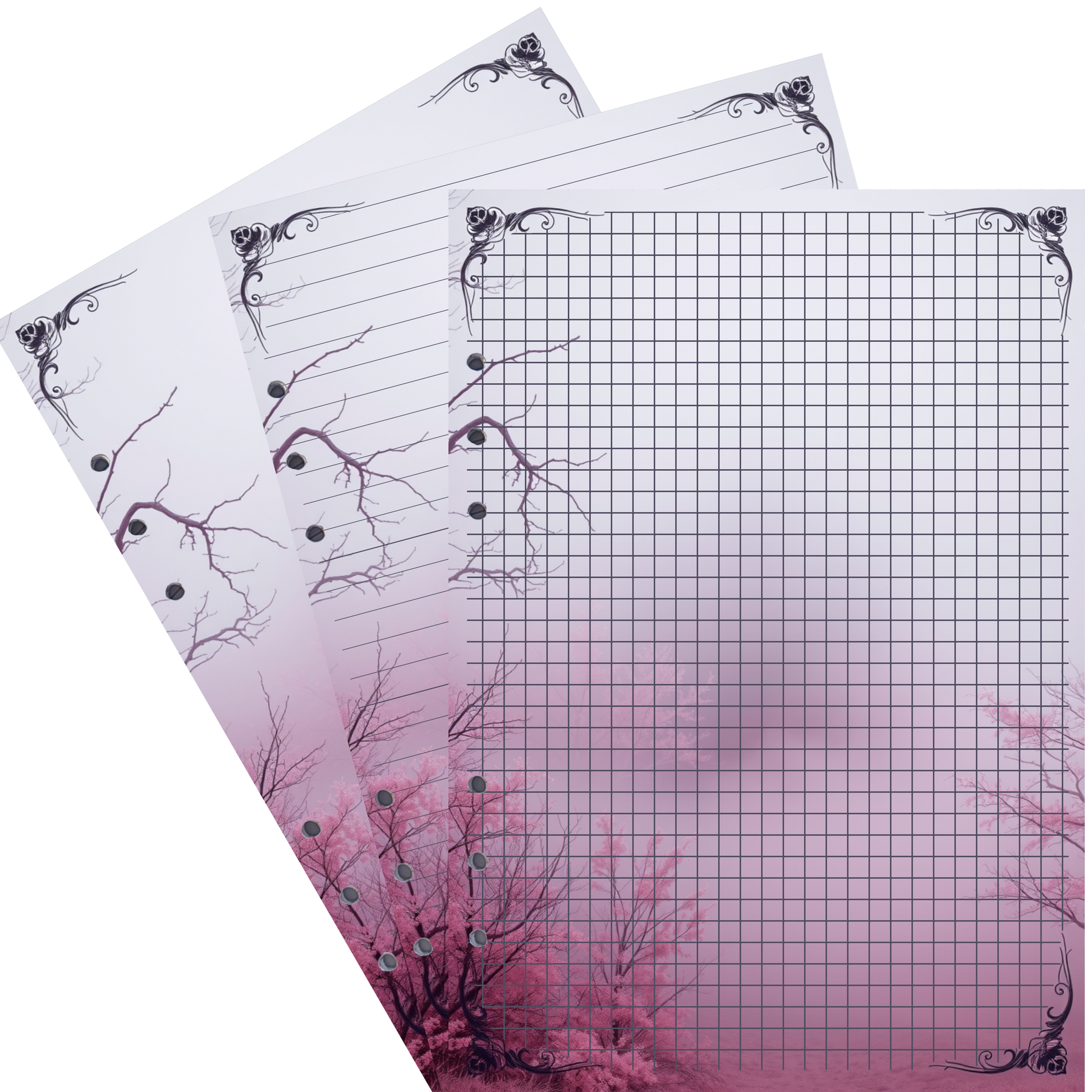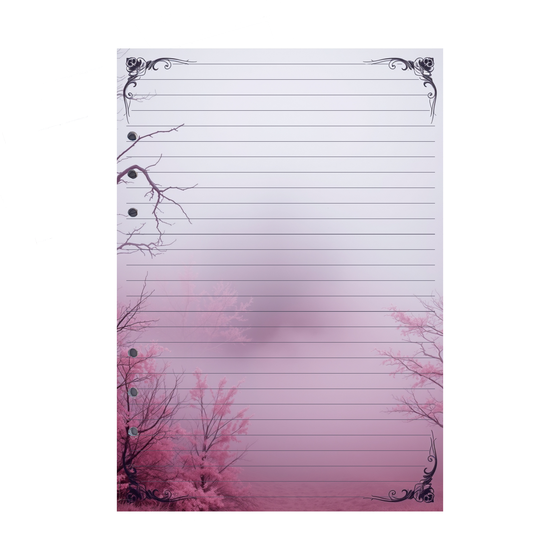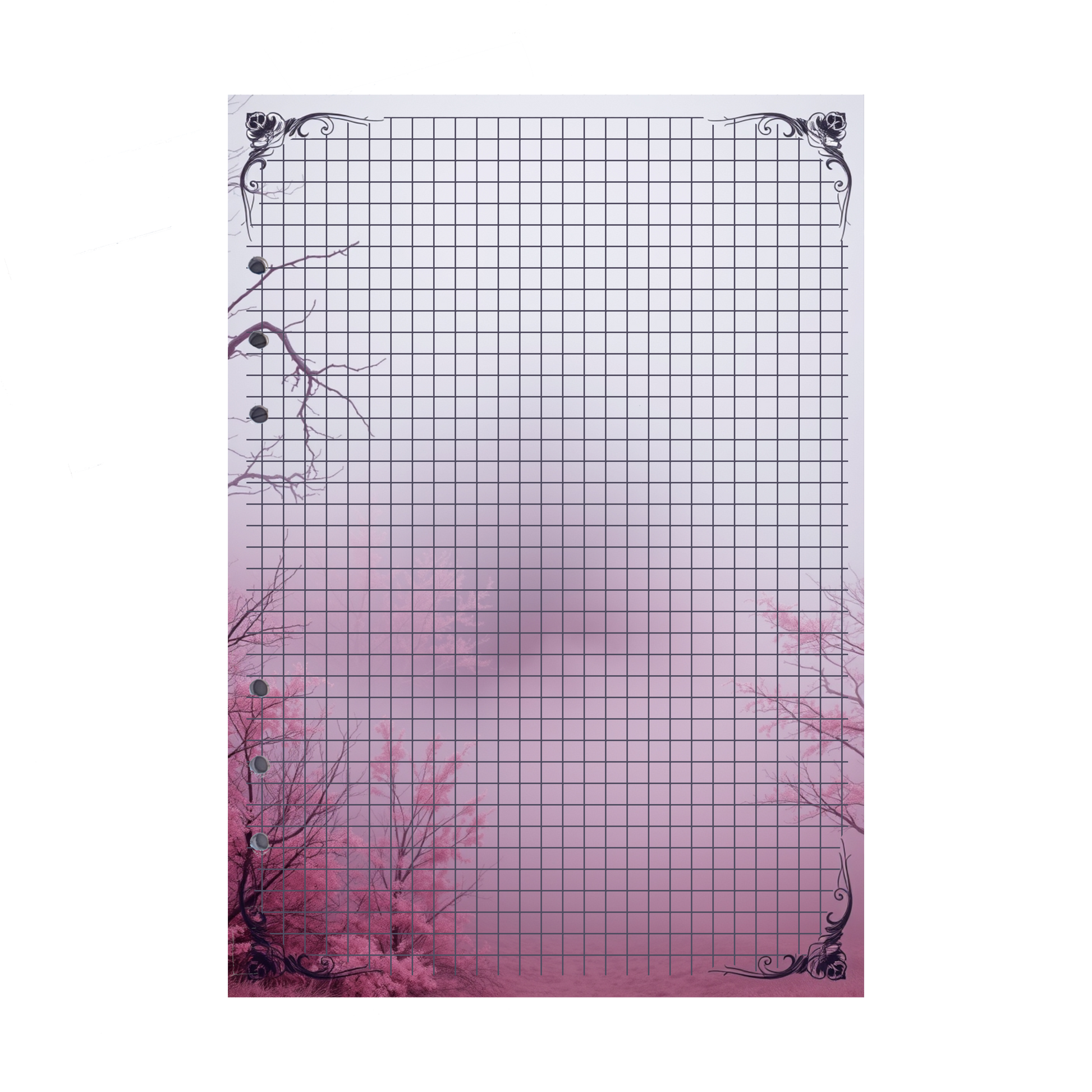 Lassen Sie sich von der mystischen Atmosphäre eines geheimen Waldes verzaubern mit unseren exklusiven DIN A5 Ringbucheinlagen im Mystic Fog 60-Design. Der Eingang zu diesem magischen Wald ist gesäumt von pinken Sträuchern und kahlen Ästen, die im zarten rosa-weißen Nebel verschwinden. Der weitere Verlauf des Weges ist nur schemenhaft zu erahnen, was diesem Design eine geheimnisvolle, fast unerforschte Stimmung verleiht. Perfekt für all jene, die ihre Gedanken in einer träumerischen und beruhigenden Umgebung festhalten möchten.