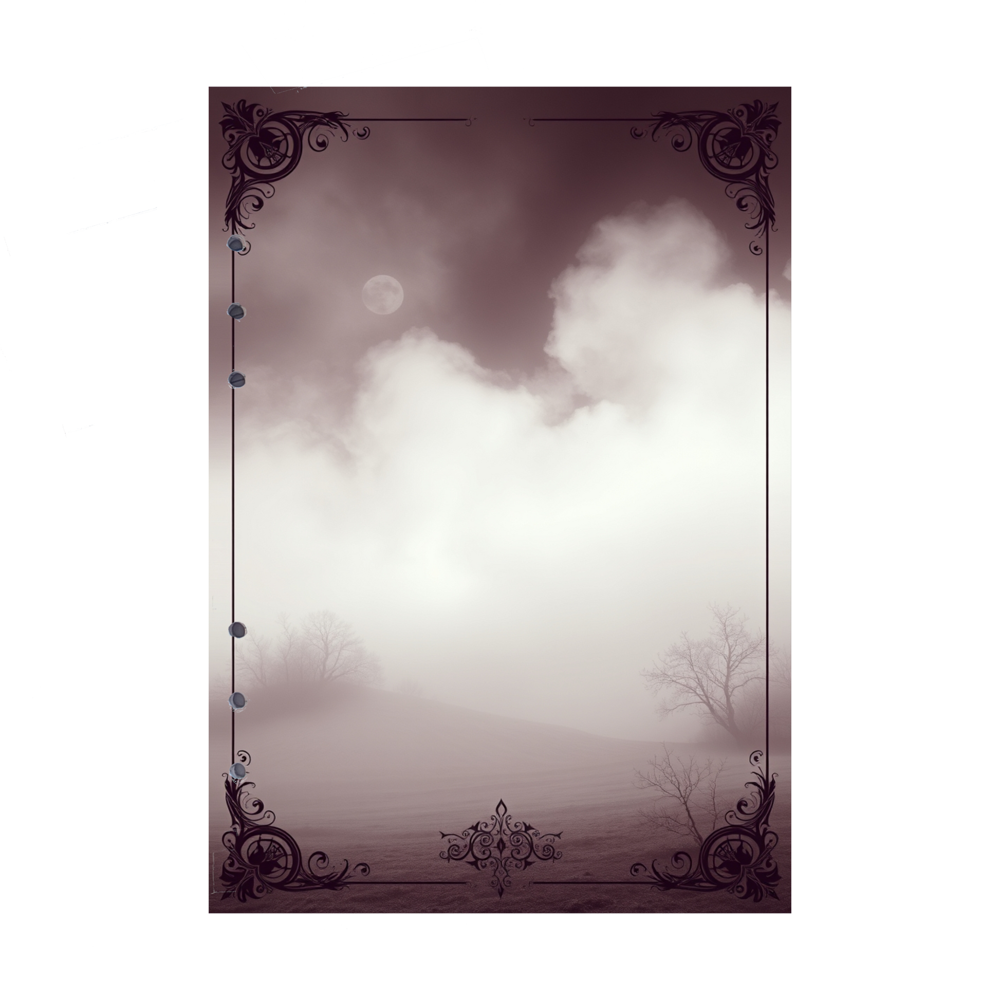 Erleben Sie die ruhige, fast magische Atmosphäre einer mondbeschienenen Nacht mit unseren exklusiven DIN A5 Ringbucheinlagen im Mystic Fog 65-Design. Diese Szene zeigt ein weitläufiges Feld, das im sanften Schein des Vollmonds erstrahlt. Nur wenige Bäume sind in der Ferne zu erkennen, und die gesamte Szenerie wird in warmen Brauntönen gehalten, die eine beruhigende und zugleich geheimnisvolle Stimmung erzeugen. Ideal für alle, die ihre Gedanken und Ideen in einer stillen, friedlichen Umgebung festhalten möchten.
