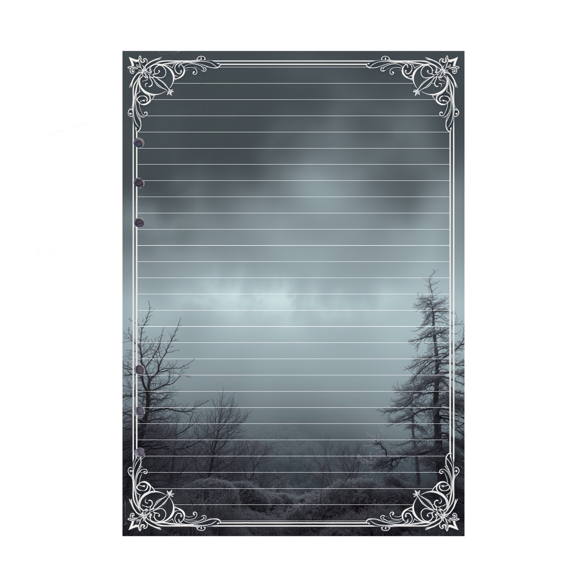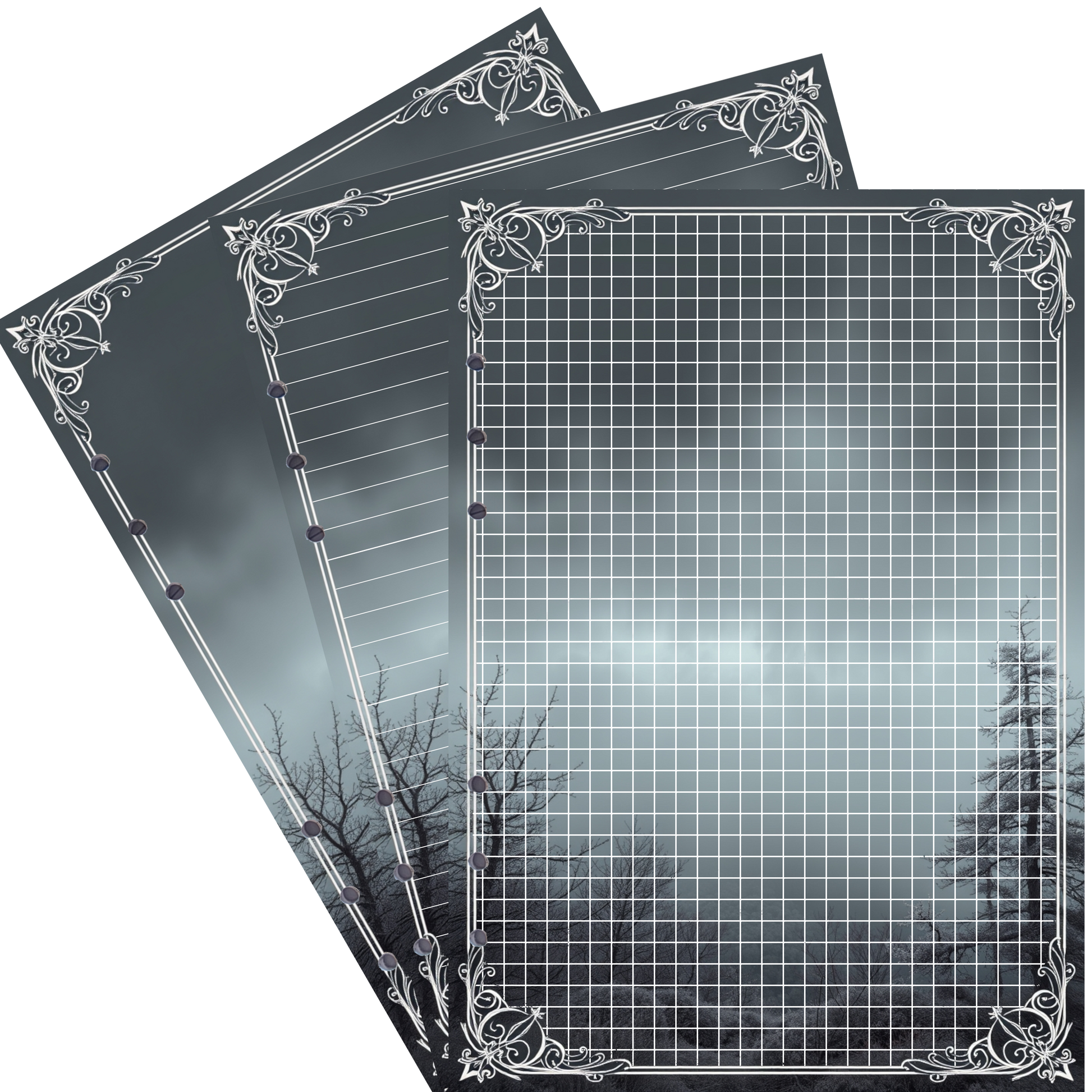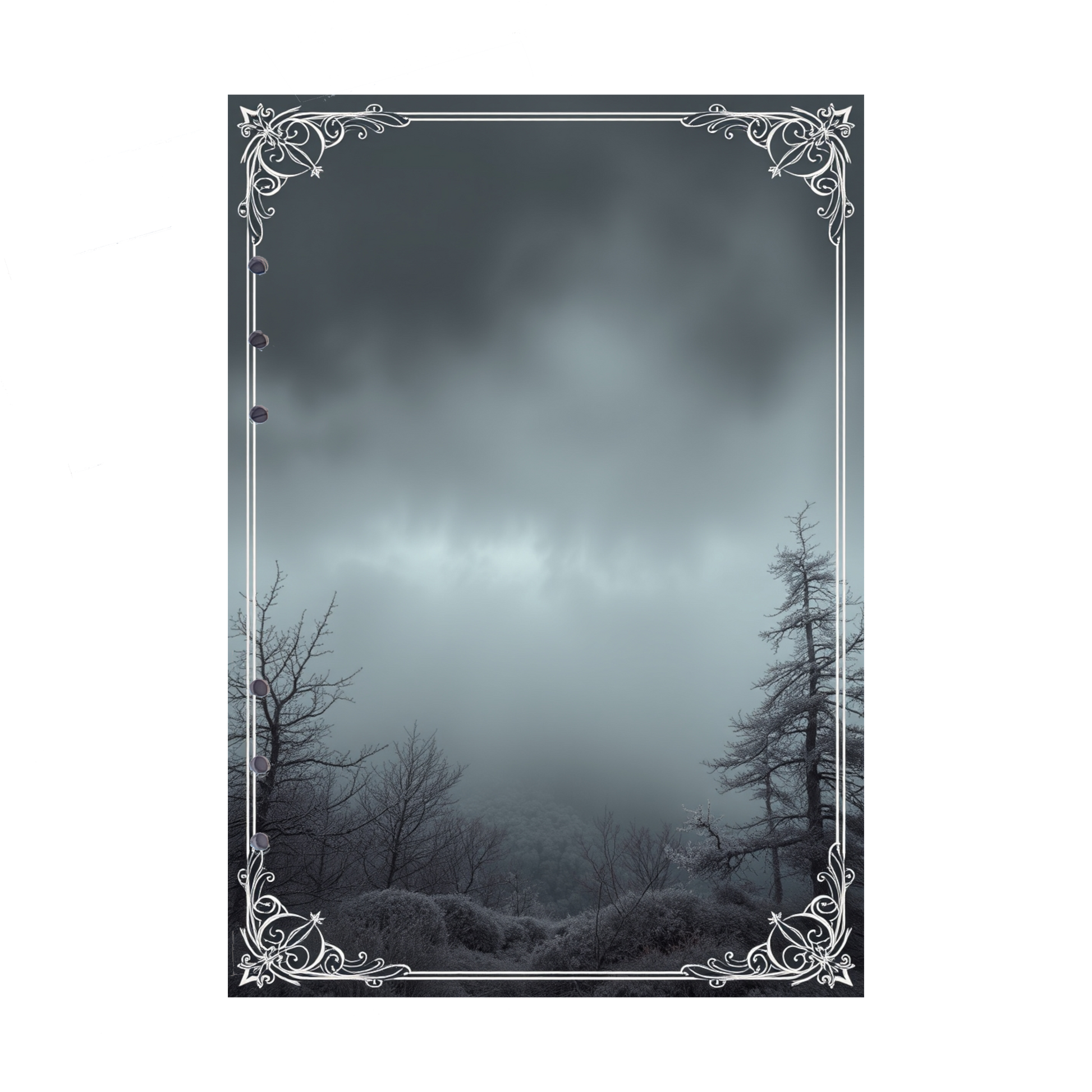 Tauchen Sie ein in die mystische Ruhe eines lichten Waldes mit dem Mystic Fog 71-Design. Zarte Bäume und Büsche, die durch das Bild verstreut sind, werden von dichtem, durchdringendem Nebel umhüllt. Die gesamte Szene ist in sanften Grautönen gehalten, was eine ruhige und zugleich geheimnisvolle Atmosphäre schafft. Diese Ringbucheinlagen sind perfekt für alle, die ihre Gedanken in einer verträumten, aber kraftvollen Umgebung festhalten möchten.