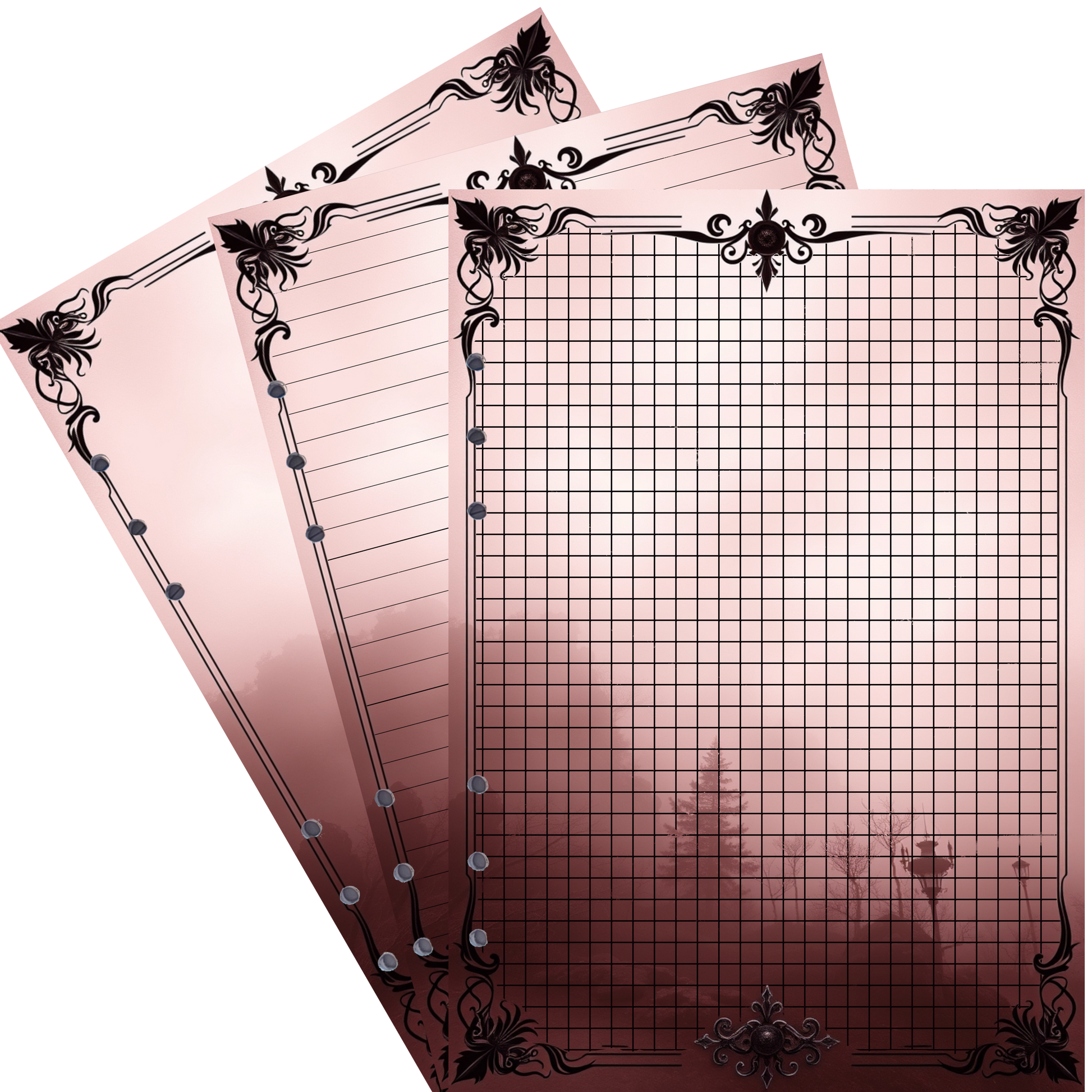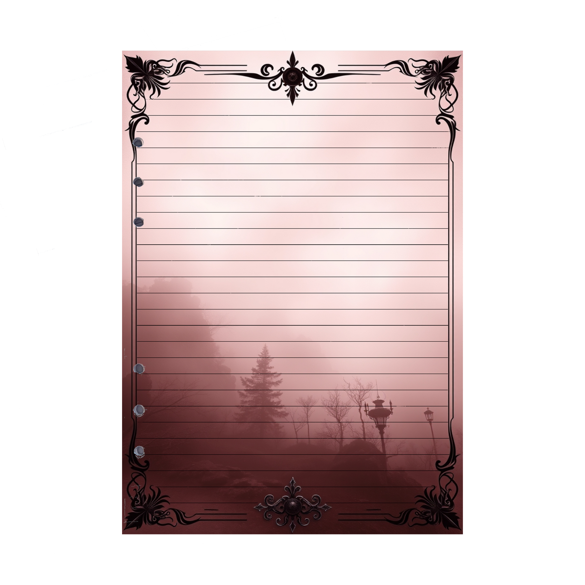 - Elegantes Design: Der bordeauxfarbene Nebel und die laternenbeleuchtete Szenerie verleihen Ihren Notizen eine besonders mystische und inspirierende Atmosphäre.