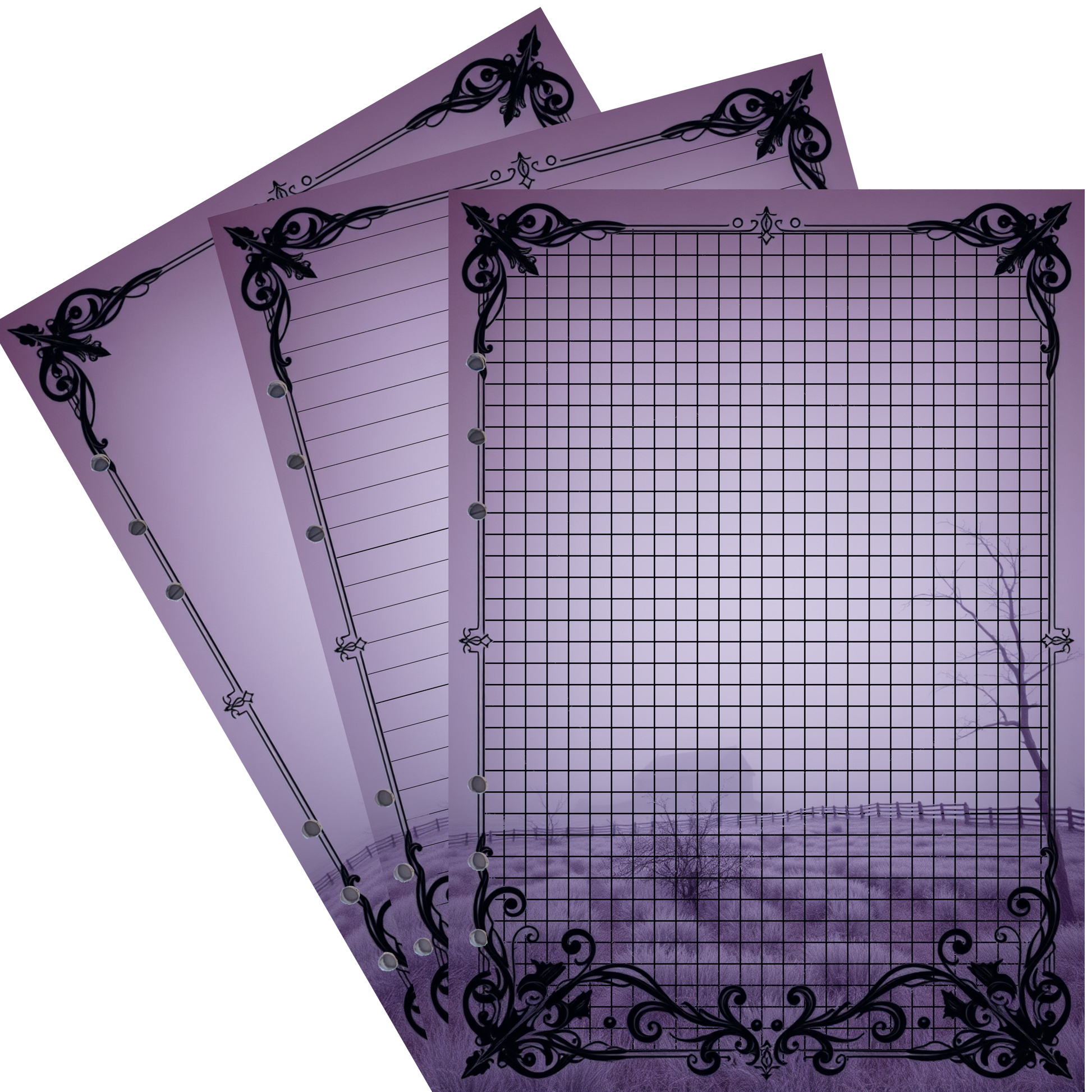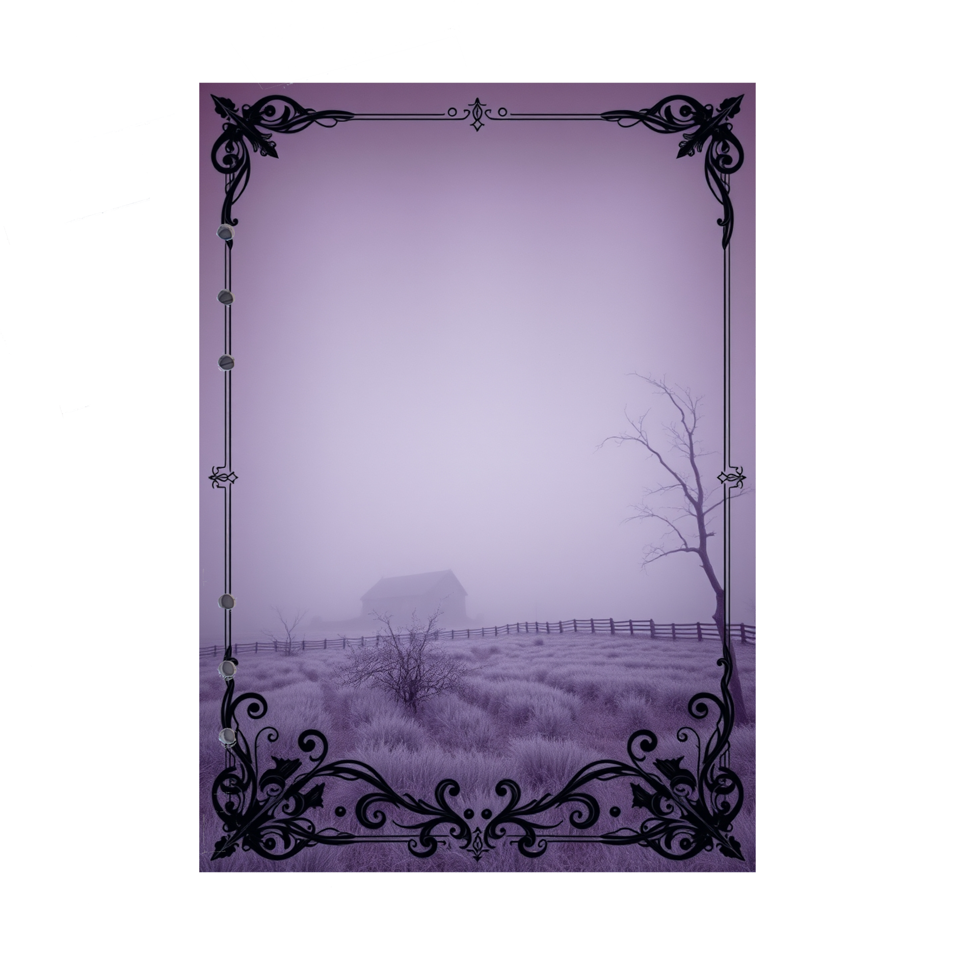 Tauchen Sie ein in eine geheimnisvolle Szenerie mit dem Mystic Fog 78-Design. Diese Nachfüllseiten zeigen ein altes Haus, das im Hintergrund im dichten Nebel verschwindet, während eine weite, eingezäunte Weidefläche im Vordergrund das Bild dominiert. Der lila Nebel, der alles umhüllt, verleiht der Landschaft eine fast surreale, lebendige Atmosphäre, die Ihre Notizen und Gedanken in einem magischen Licht erscheinen lässt.