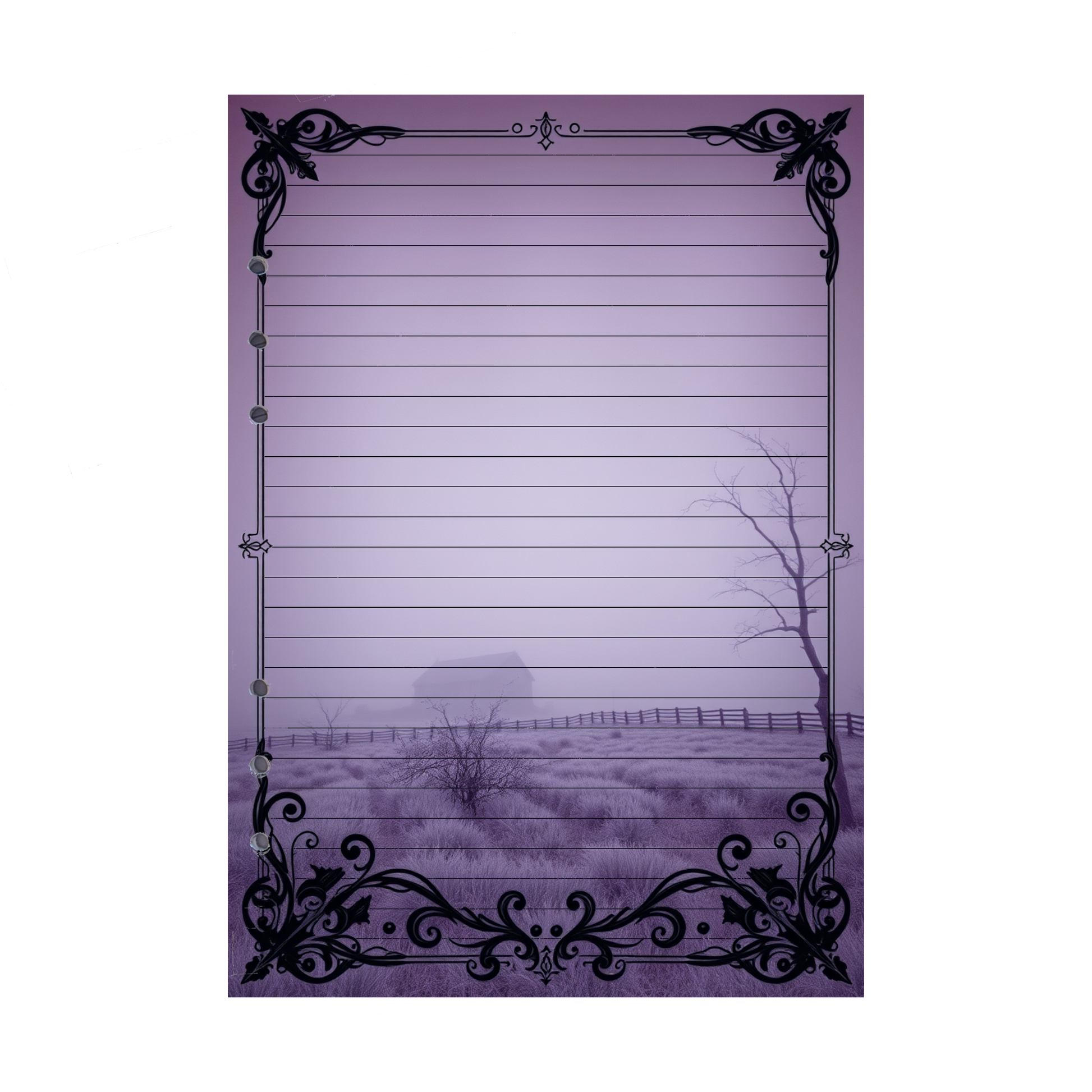 - Elegantes Design: Der lila Nebel und das Bild eines eingezäunten Grundstücks verleihen Ihren Notizen eine geheimnisvolle und fesselnde Atmosphäre.