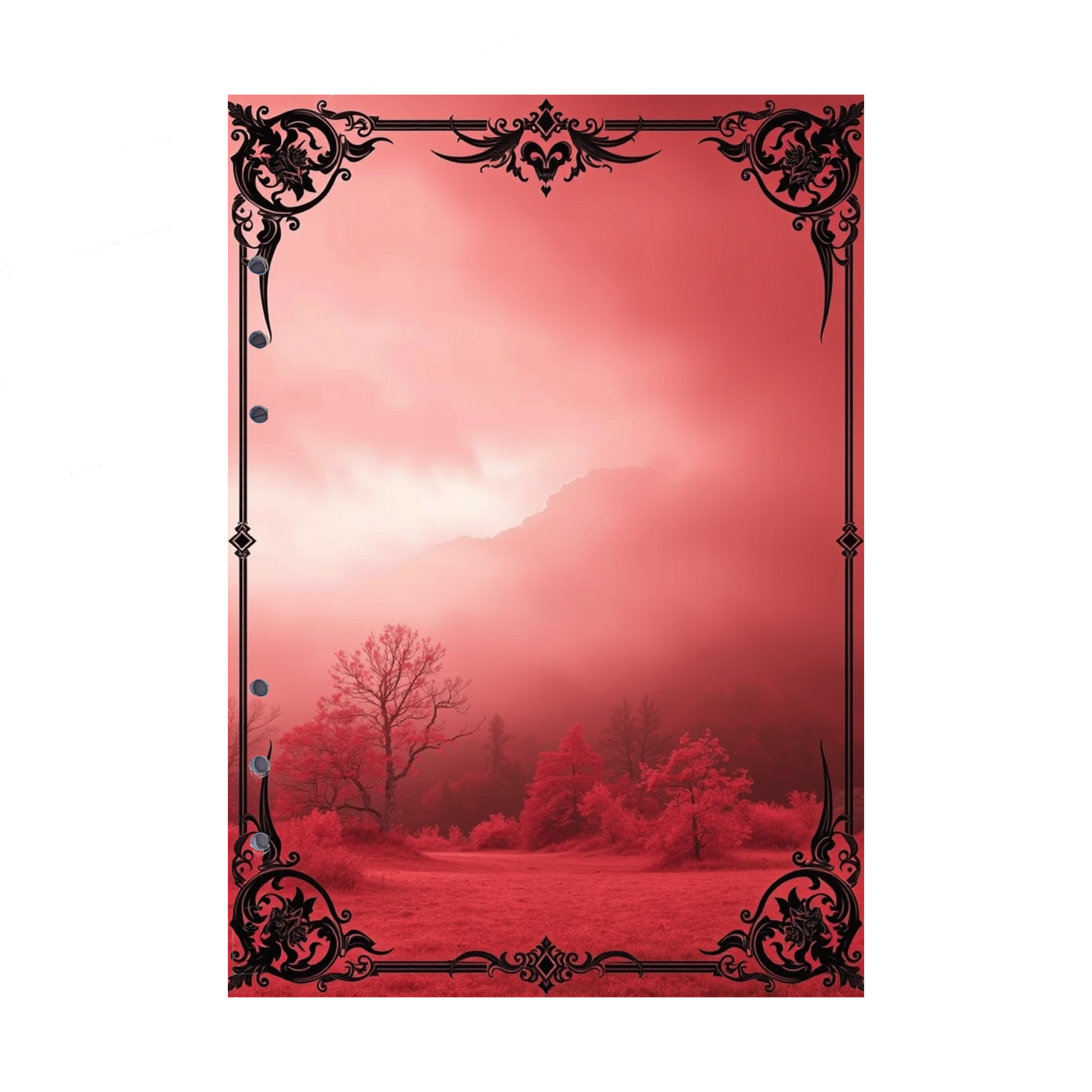 Tauchen Sie ein in die mystische Stille eines riesigen Berges, umhüllt von Nebel, mit unseren exklusiven DIN A5 Ringbucheinlagen im Mystic Fog 82-Design. Dieses faszinierende Motiv zeigt eine beeindruckende Landschaft vor einem mächtigen Berg, dessen Gipfel nur vage durch den dichten Nebel zu erahnen ist. Sträucher und Bäume in kräftigen Rottönen schmücken den Vordergrund und verleihen der Szene eine kraftvolle, aber gleichzeitig ruhige Atmosphäre.