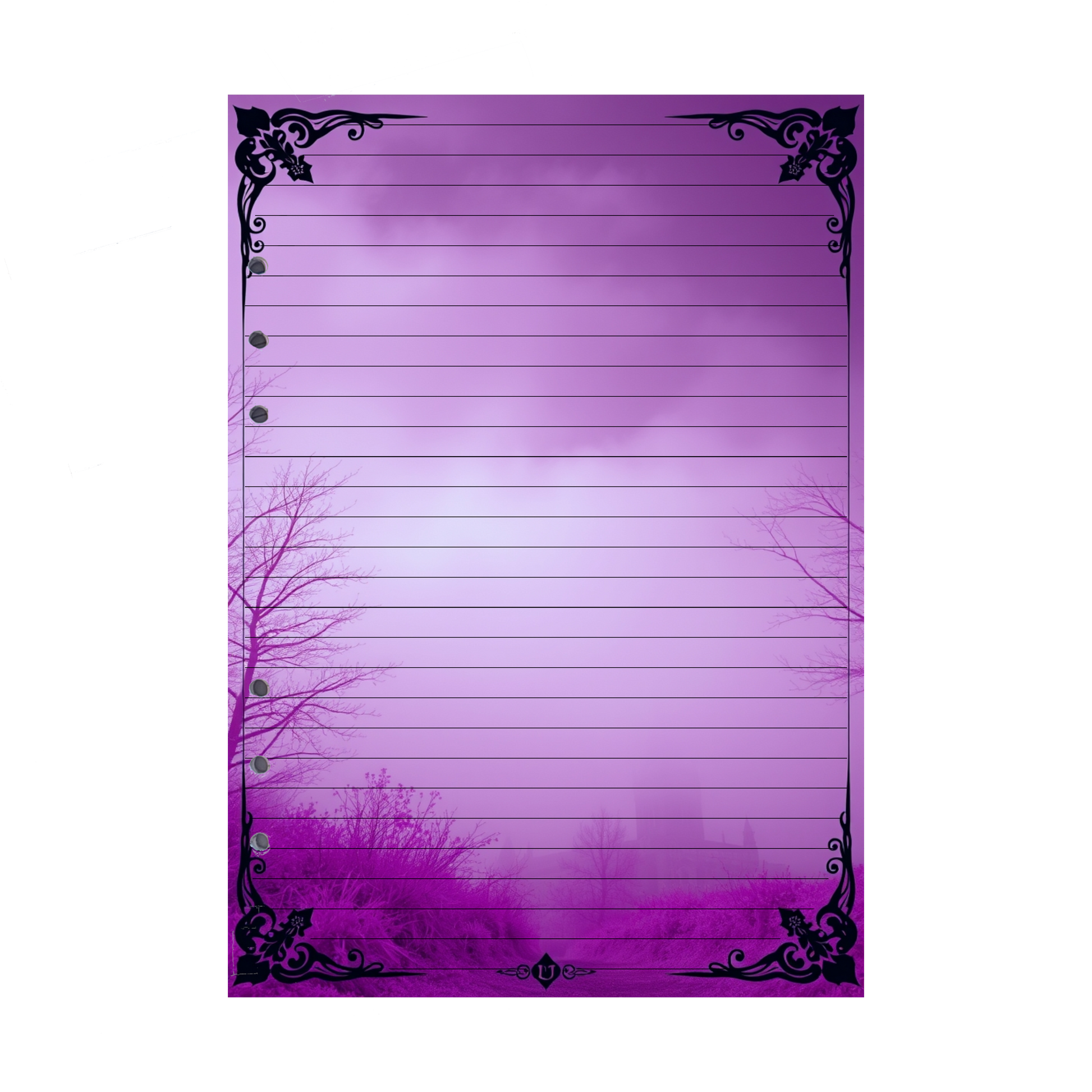 Tauchen Sie ein in eine geheimnisvolle Welt mit unseren exklusiven DIN A5 Ringbucheinlagen im Mystic Fog 84-Design. Dieses einzigartige Motiv zeigt einen geheimnisvollen Schotterweg, der von dichtem lila Nebel umhüllt ist und in der Ferne eine verlassene Burg andeutet. Das gesamte Bild ist in mystischen Lilatönen gehalten und verleiht Ihren Notizen eine geheimnisvolle, fast surreale Atmosphäre.