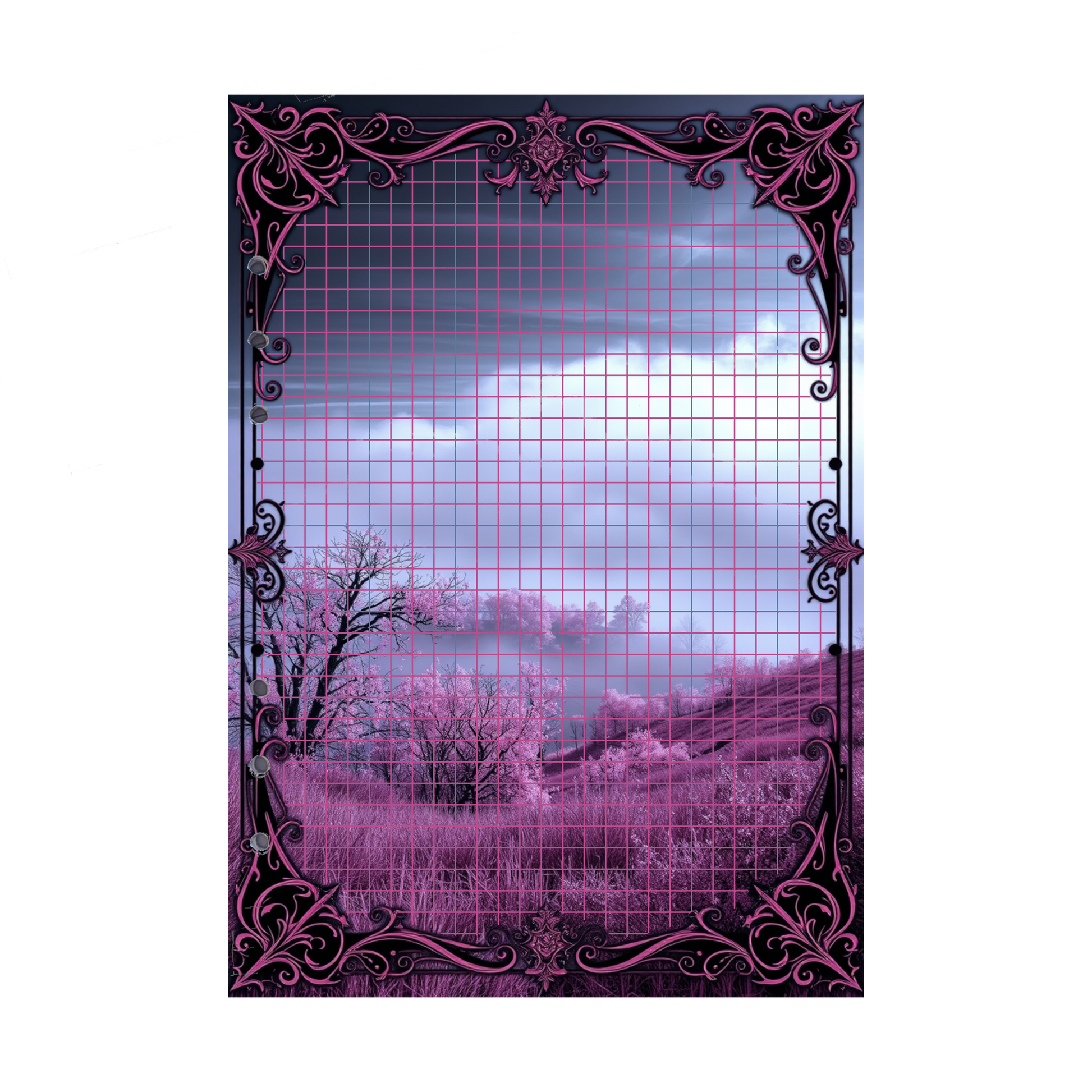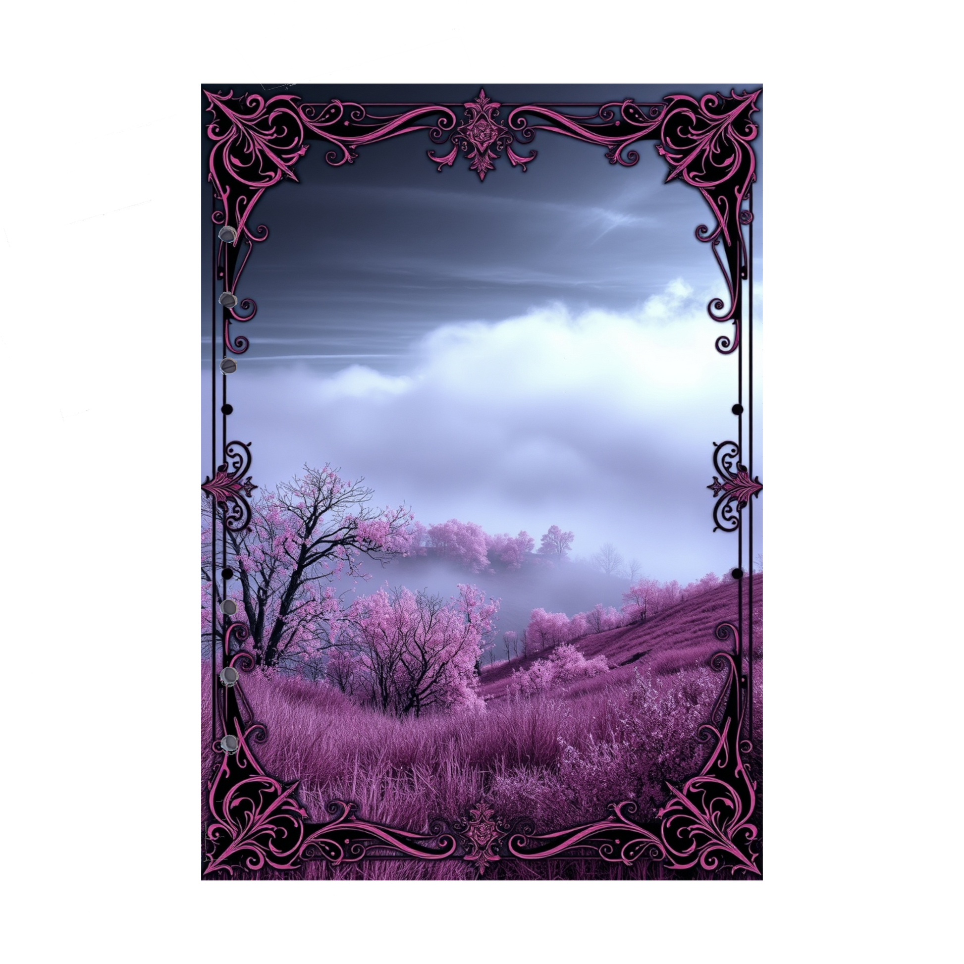 Das Mystic Fog 87-Design entführt Sie in eine Welt aus lila Feldern, rosa Bäumen und aufziehendem weißen Nebel unter einem dunkelblauen Himmel. Diese mystische Landschaft sorgt für eine ruhige, fast magische Stimmung – perfekt, um Ihre Gedanken in einer besonderen Atmosphäre festzuhalten.
