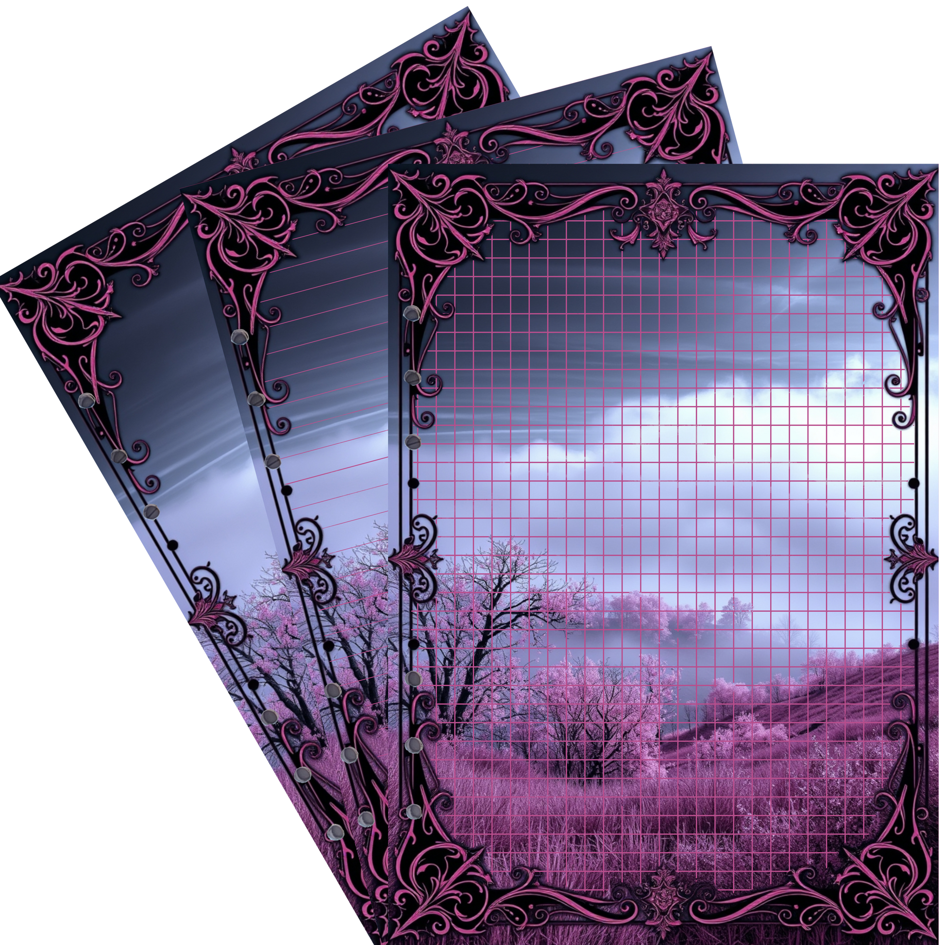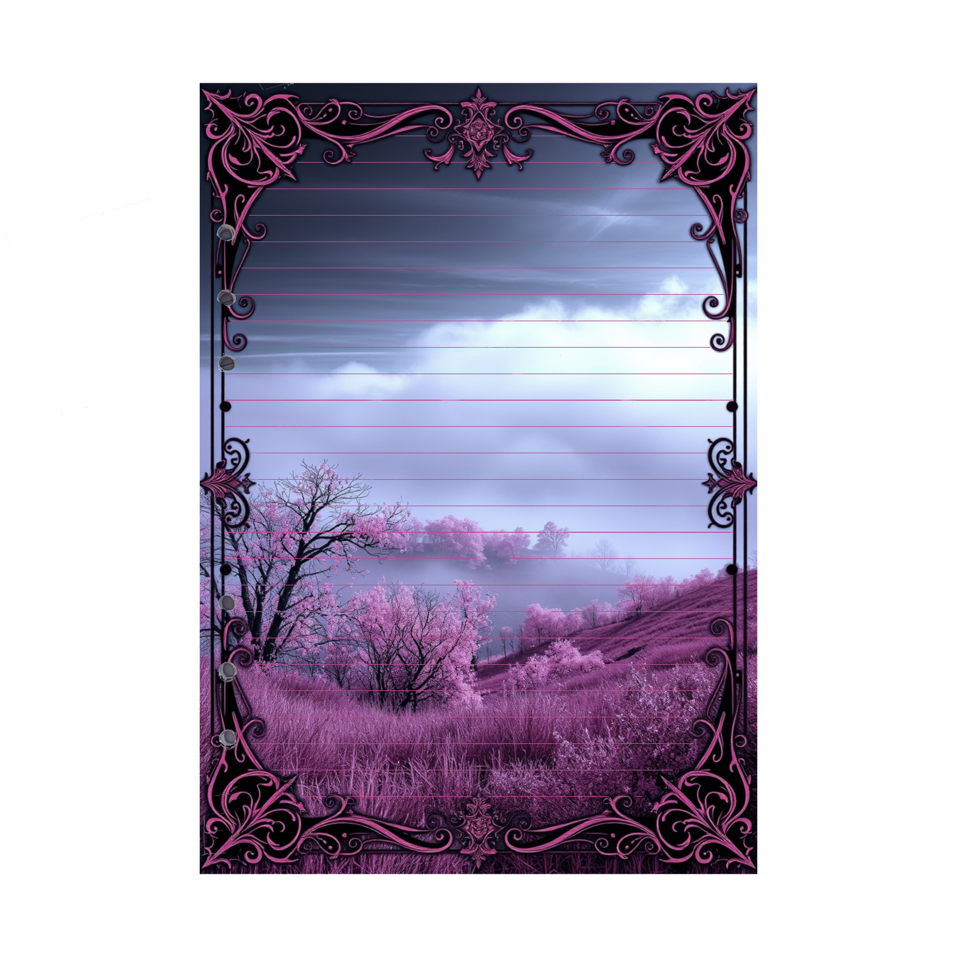 Erleben Sie die faszinierende Ruhe einer geheimnisvollen Landschaft mit unseren exklusiven DIN A5 Ringbucheinlagen im Mystic Fog 87-Design. Das Motiv zeigt hügelige Felder in sanften Lilatönen, die von rosa Bäumen gesäumt sind, während aufziehender weißer Nebel die Szene umhüllt. Der dunkelblaue Himmel verleiht dem Bild eine dramatische, zugleich beruhigende Atmosphäre – ideal für kreative Momente oder tiefgründige Notizen.