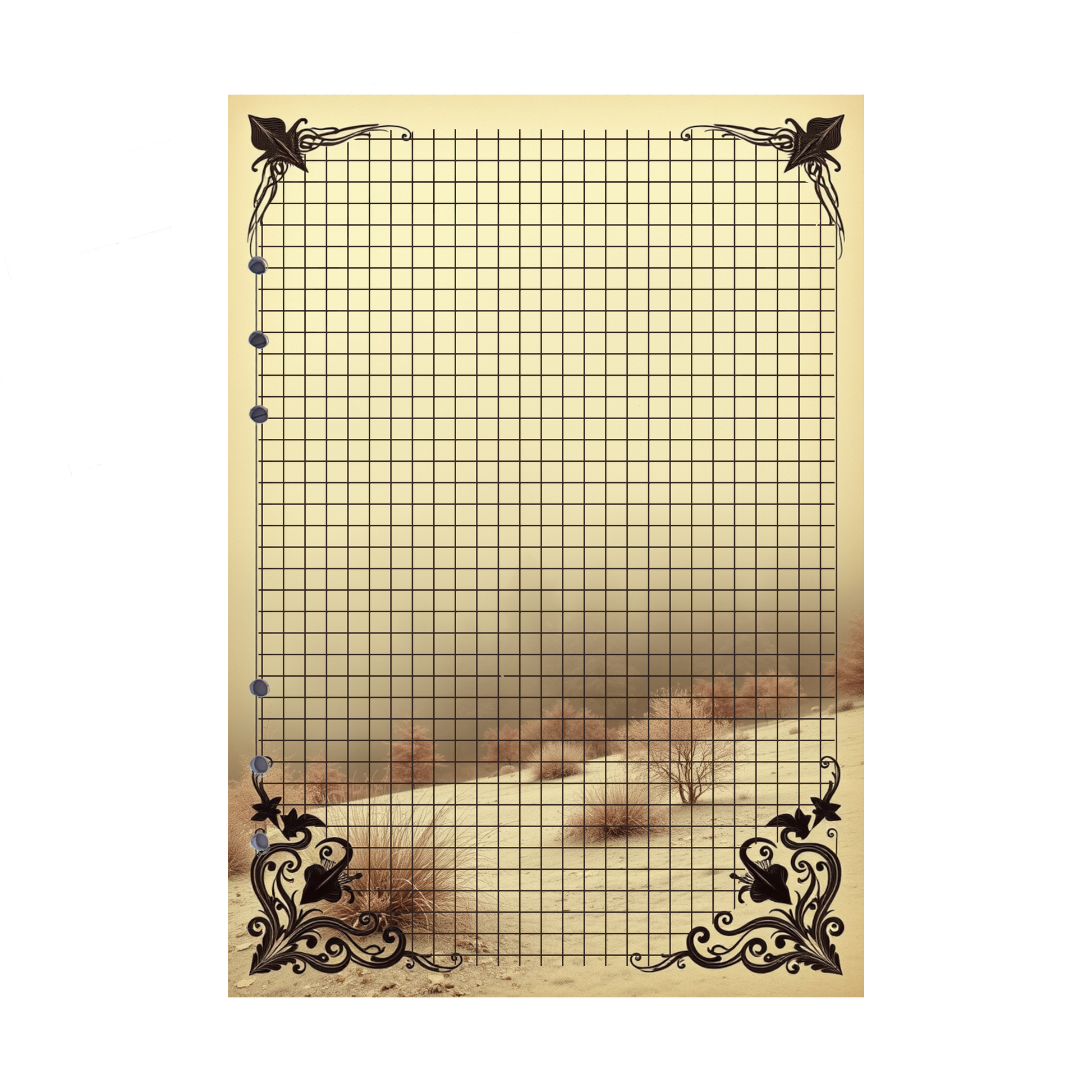 Das Mystic Fog 89-Design mit seinem sandigen Boden, den vereinzelten Grasbüscheln und dem gelben Nebel schafft eine ruhige, fast nostalgische Atmosphäre. Perfekt, um Ihre Gedanken in einer rustikalen, natürlichen Umgebung festzuhalten.