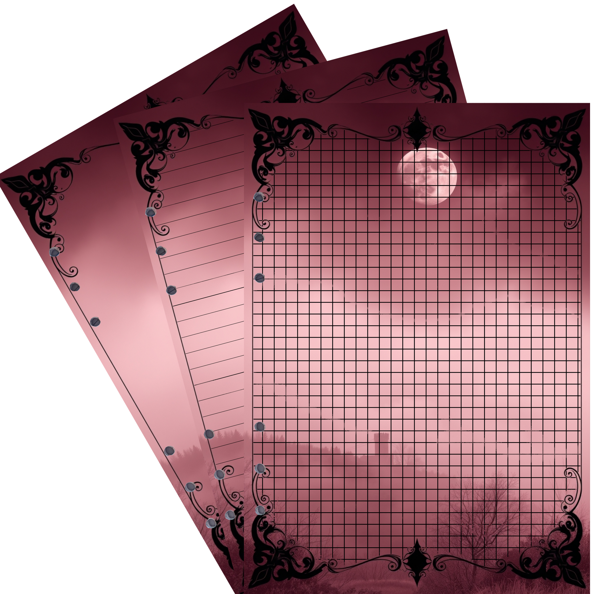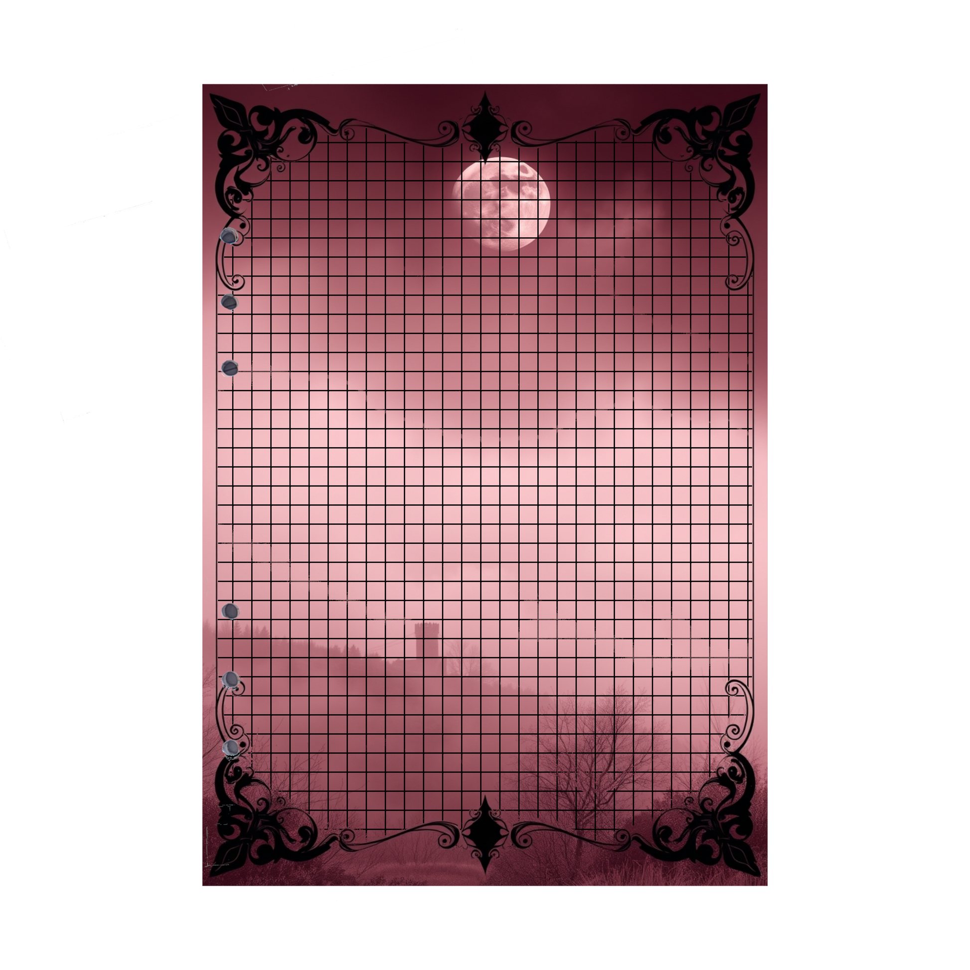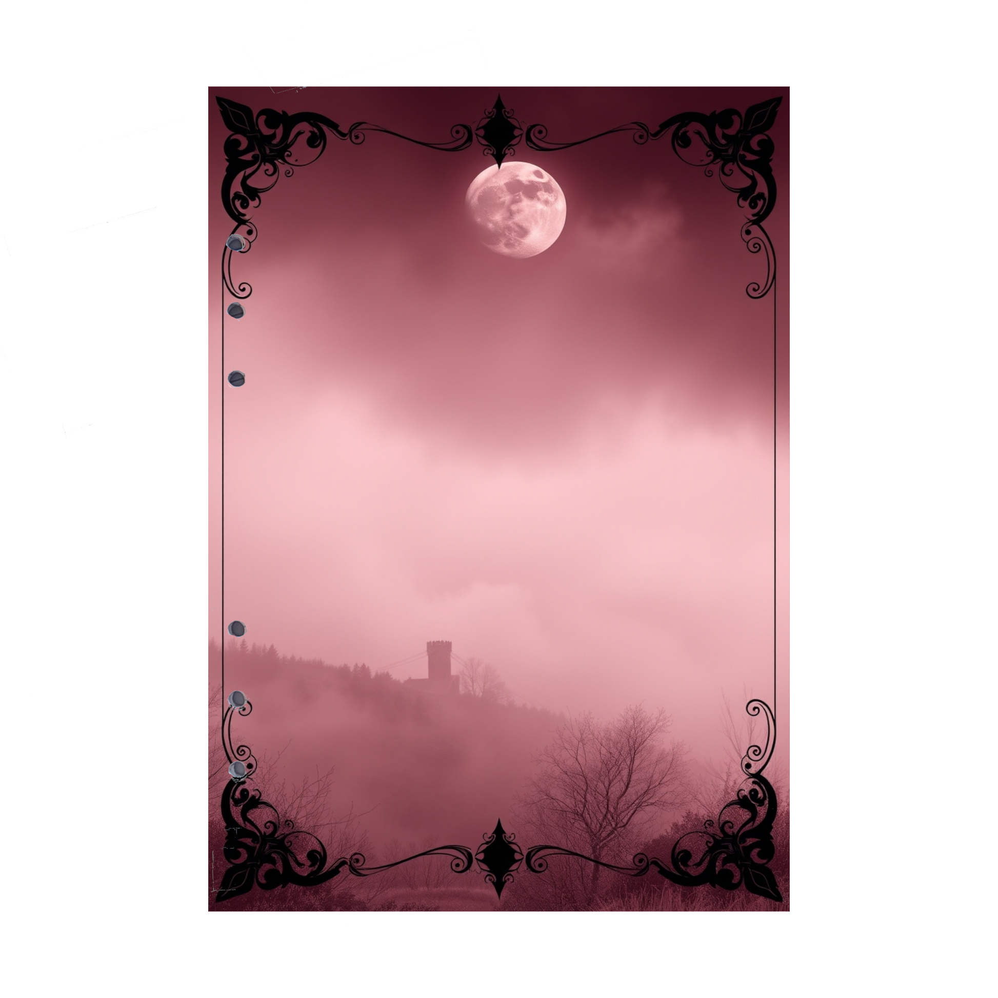 Erleben Sie die geheimnisvolle und märchenhafte Atmosphäre des Mystic Fog 9-Designs. Unter dem Schein eines voll erleuchteten Mondes liegt dichter Nebel, der sich sanft über die Landschaft zieht. In der Ferne ist eine alte, ehrwürdige Burg schemenhaft zu erkennen, umhüllt von mystischem Dunst. Die Farbpalette reicht von zartem Rosa bis hin zu tiefem Burgund und verstärkt die magische und fast surreale Stimmung. Diese Nachfüllseiten sind ideal für all jene, die ihre Gedanken in einer geheimnisvollen, fast mythischen Umgebung festhalten möchten.
