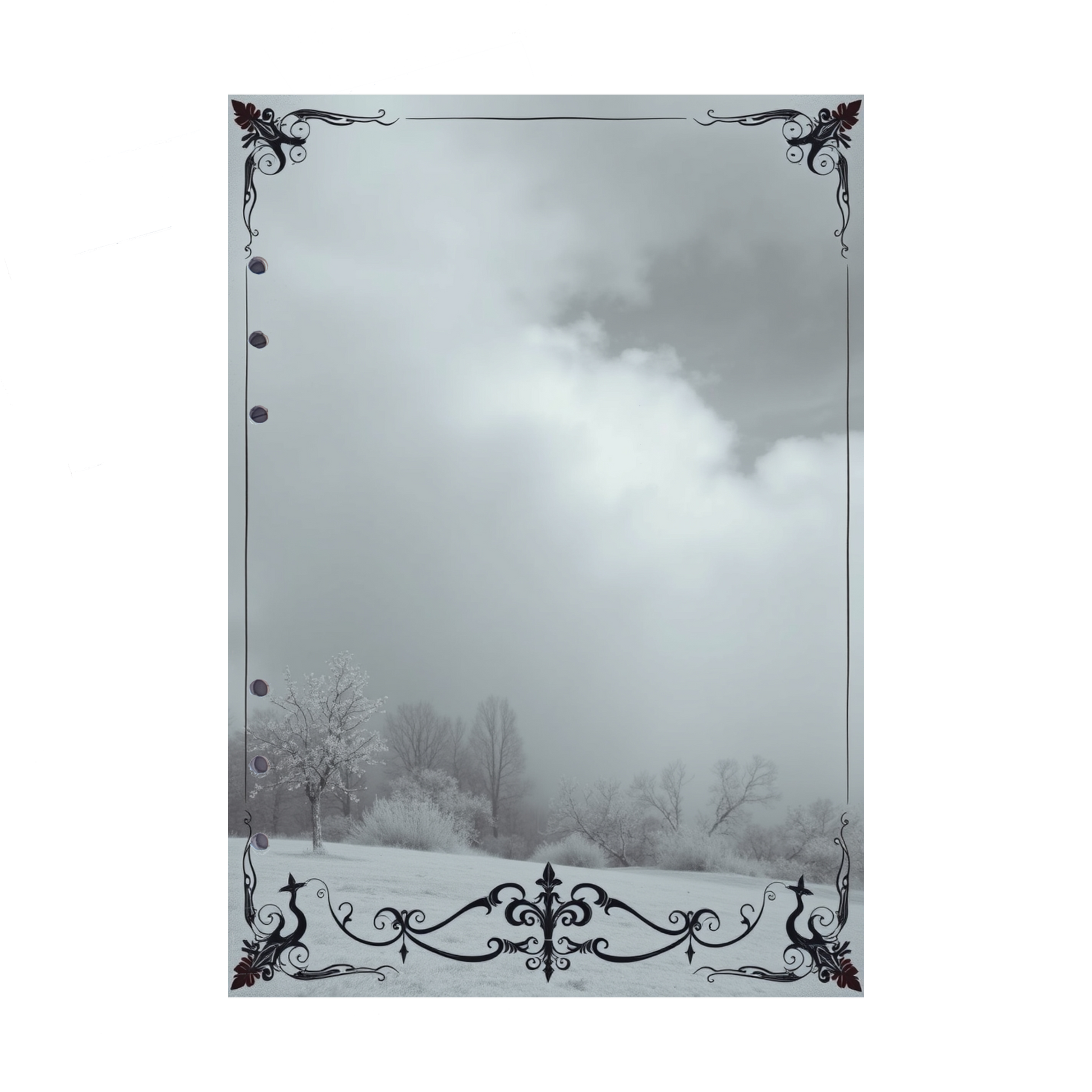 Tauchen Sie ein in die Stille einer winterlichen Landschaft mit unseren exklusiven DIN A5 Ringbucheinlagen im Mystic Fog 90-Design. Das Motiv zeigt eine weite Feldwiese am Waldrand, die von einem dünnen, hellgrauen Nebel umhüllt wird. Diese schlichte, winterliche Szene vermittelt eine Atmosphäre der Ruhe und Besinnlichkeit – perfekt, um Ihre Gedanken in einer klaren und beruhigenden Umgebung festzuhalten.
